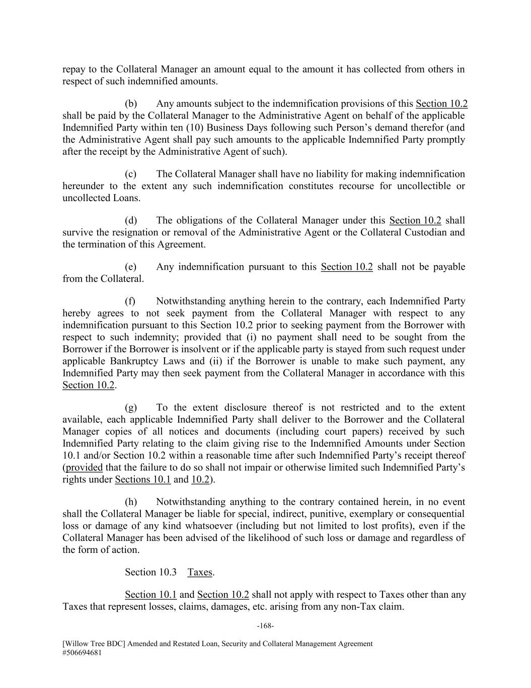 repay to the Collateral Manager an amount equal to the amount it has collected from others in respect of such indemnified amounts. (b) Any amounts subject to the indemnification provisions of this Section 10.2 shall be paid by the Collateral Manager to the Administrative Agent on behalf of the applicable Indemnified Party within ten (10) Business Days following such Person’s demand therefor (and the Administrative Agent shall pay such amounts to the applicable Indemnified Party promptly after the receipt by the Administrative Agent of such). (c) The Collateral Manager shall have no liability for making indemnification hereunder to the extent any such indemnification constitutes recourse for uncollectible or uncollected Loans. (d) The obligations of the Collateral Manager under this Section 10.2 shall survive the resignation or removal of the Administrative Agent or the Collateral Custodian and the termination of this Agreement. (e) Any indemnification pursuant to this Section 10.2 shall not be payable from the Collateral. (f) Notwithstanding anything herein to the contrary, each Indemnified Party hereby agrees to not seek payment from the Collateral Manager with respect to any indemnification pursuant to this Section 10.2 prior to seeking payment from the Borrower with respect to such indemnity; provided that (i) no payment shall need to be sought from the Borrower if the Borrower is insolvent or if the applicable party is stayed from such request under applicable Bankruptcy Laws and (ii) if the Borrower is unable to make such payment, any Indemnified Party may then seek payment from the Collateral Manager in accordance with this Section 10.2. (g) To the extent disclosure thereof is not restricted and to the extent available, each applicable Indemnified Party shall deliver to the Borrower and the Collateral Manager copies of all notices and documents (including court papers) received by such Indemnified Party relating to the claim giving rise to the Indemnified Amounts under Section 10.1 and/or Section 10.2 within a reasonable time after such Indemnified Party’s receipt thereof (provided that the failure to do so shall not impair or otherwise limited such Indemnified Party’s rights under Sections 10.1 and 10.2). (h) Notwithstanding anything to the contrary contained herein, in no event shall the Collateral Manager be liable for special, indirect, punitive, exemplary or consequential loss or damage of any kind whatsoever (including but not limited to lost profits), even if the Collateral Manager has been advised of the likelihood of such loss or damage and regardless of the form of action. Section 10.3 Taxes. Section 10.1 and Section 10.2 shall not apply with respect to Taxes other than any Taxes that represent losses, claims, damages, etc. arising from any non-Tax claim. -168- [Willow Tree BDC] Amended and Restated Loan, Security and Collateral Management Agreement #506694681