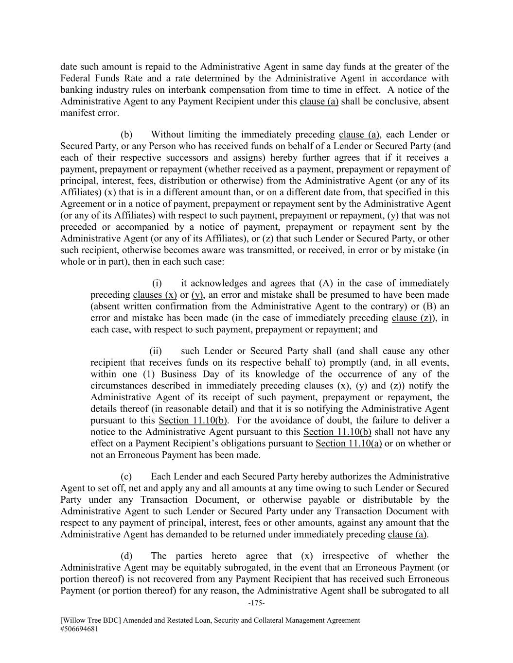 date such amount is repaid to the Administrative Agent in same day funds at the greater of the Federal Funds Rate and a rate determined by the Administrative Agent in accordance with banking industry rules on interbank compensation from time to time in effect. A notice of the Administrative Agent to any Payment Recipient under this clause (a) shall be conclusive, absent manifest error. (b) Without limiting the immediately preceding clause (a), each Lender or Secured Party, or any Person who has received funds on behalf of a Lender or Secured Party (and each of their respective successors and assigns) hereby further agrees that if it receives a payment, prepayment or repayment (whether received as a payment, prepayment or repayment of principal, interest, fees, distribution or otherwise) from the Administrative Agent (or any of its Affiliates) (x) that is in a different amount than, or on a different date from, that specified in this Agreement or in a notice of payment, prepayment or repayment sent by the Administrative Agent (or any of its Affiliates) with respect to such payment, prepayment or repayment, (y) that was not preceded or accompanied by a notice of payment, prepayment or repayment sent by the Administrative Agent (or any of its Affiliates), or (z) that such Lender or Secured Party, or other such recipient, otherwise becomes aware was transmitted, or received, in error or by mistake (in whole or in part), then in each such case: (i) it acknowledges and agrees that (A) in the case of immediately preceding clauses (x) or (y), an error and mistake shall be presumed to have been made (absent written confirmation from the Administrative Agent to the contrary) or (B) an error and mistake has been made (in the case of immediately preceding clause (z)), in each case, with respect to such payment, prepayment or repayment; and (ii) such Lender or Secured Party shall (and shall cause any other recipient that receives funds on its respective behalf to) promptly (and, in all events, within one (1) Business Day of its knowledge of the occurrence of any of the circumstances described in immediately preceding clauses (x), (y) and (z)) notify the Administrative Agent of its receipt of such payment, prepayment or repayment, the details thereof (in reasonable detail) and that it is so notifying the Administrative Agent pursuant to this Section 11.10(b). For the avoidance of doubt, the failure to deliver a notice to the Administrative Agent pursuant to this Section 11.10(b) shall not have any effect on a Payment Recipient’s obligations pursuant to Section 11.10(a) or on whether or not an Erroneous Payment has been made. (c) Each Lender and each Secured Party hereby authorizes the Administrative Agent to set off, net and apply any and all amounts at any time owing to such Lender or Secured Party under any Transaction Document, or otherwise payable or distributable by the Administrative Agent to such Lender or Secured Party under any Transaction Document with respect to any payment of principal, interest, fees or other amounts, against any amount that the Administrative Agent has demanded to be returned under immediately preceding clause (a). (d) The parties hereto agree that (x) irrespective of whether the Administrative Agent may be equitably subrogated, in the event that an Erroneous Payment (or portion thereof) is not recovered from any Payment Recipient that has received such Erroneous Payment (or portion thereof) for any reason, the Administrative Agent shall be subrogated to all -175- [Willow Tree BDC] Amended and Restated Loan, Security and Collateral Management Agreement #506694681