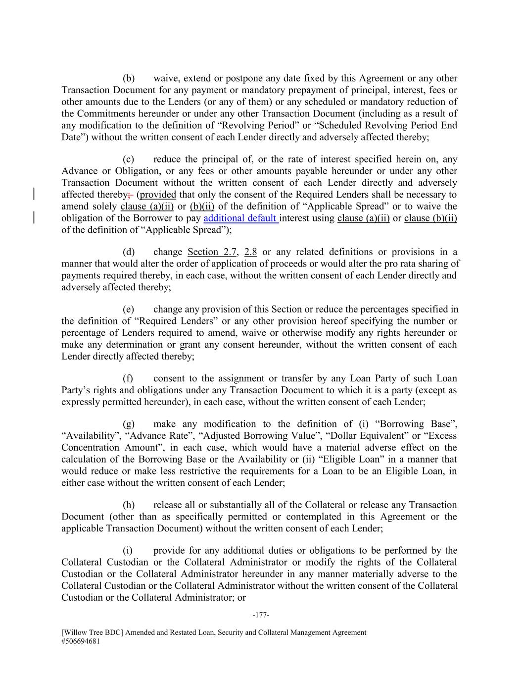 (b) waive, extend or postpone any date fixed by this Agreement or any other Transaction Document for any payment or mandatory prepayment of principal, interest, fees or other amounts due to the Lenders (or any of them) or any scheduled or mandatory reduction of the Commitments hereunder or under any other Transaction Document (including as a result of any modification to the definition of “Revolving Period” or “Scheduled Revolving Period End Date”) without the written consent of each Lender directly and adversely affected thereby; (c) reduce the principal of, or the rate of interest specified herein on, any Advance or Obligation, or any fees or other amounts payable hereunder or under any other Transaction Document without the written consent of each Lender directly and adversely affected thereby; (provided that only the consent of the Required Lenders shall be necessary to amend solely clause (a)(ii) or (b)(ii) of the definition of “Applicable Spread” or to waive the obligation of the Borrower to pay additional default interest using clause (a)(ii) or clause (b)(ii) of the definition of “Applicable Spread”); (d) change Section 2.7, 2.8 or any related definitions or provisions in a manner that would alter the order of application of proceeds or would alter the pro rata sharing of payments required thereby, in each case, without the written consent of each Lender directly and adversely affected thereby; (e) change any provision of this Section or reduce the percentages specified in the definition of “Required Lenders” or any other provision hereof specifying the number or percentage of Lenders required to amend, waive or otherwise modify any rights hereunder or make any determination or grant any consent hereunder, without the written consent of each Lender directly affected thereby; (f) consent to the assignment or transfer by any Loan Party of such Loan Party’s rights and obligations under any Transaction Document to which it is a party (except as expressly permitted hereunder), in each case, without the written consent of each Lender; (g) make any modification to the definition of (i) “Borrowing Base”, “Availability”, “Advance Rate”, “Adjusted Borrowing Value”, “Dollar Equivalent” or “Excess Concentration Amount”, in each case, which would have a material adverse effect on the calculation of the Borrowing Base or the Availability or (ii) “Eligible Loan” in a manner that would reduce or make less restrictive the requirements for a Loan to be an Eligible Loan, in either case without the written consent of each Lender; (h) release all or substantially all of the Collateral or release any Transaction Document (other than as specifically permitted or contemplated in this Agreement or the applicable Transaction Document) without the written consent of each Lender; (i) provide for any additional duties or obligations to be performed by the Collateral Custodian or the Collateral Administrator or modify the rights of the Collateral Custodian or the Collateral Administrator hereunder in any manner materially adverse to the Collateral Custodian or the Collateral Administrator without the written consent of the Collateral Custodian or the Collateral Administrator; or -177- [Willow Tree BDC] Amended and Restated Loan, Security and Collateral Management Agreement #506694681