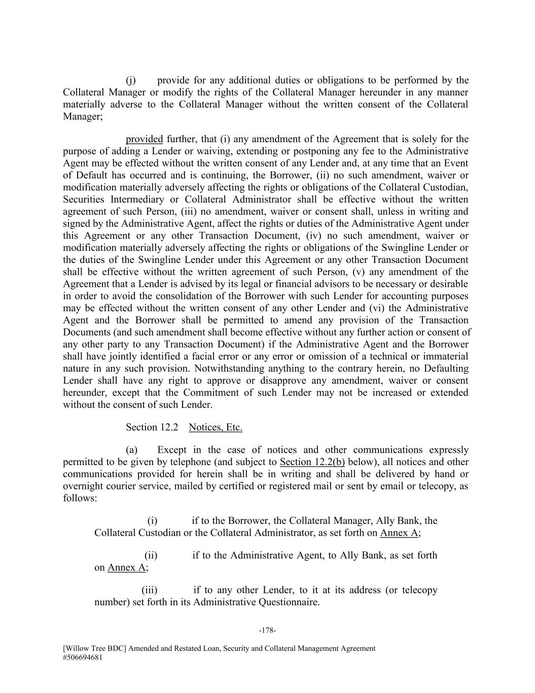 (j) provide for any additional duties or obligations to be performed by the Collateral Manager or modify the rights of the Collateral Manager hereunder in any manner materially adverse to the Collateral Manager without the written consent of the Collateral Manager; provided further, that (i) any amendment of the Agreement that is solely for the purpose of adding a Lender or waiving, extending or postponing any fee to the Administrative Agent may be effected without the written consent of any Lender and, at any time that an Event of Default has occurred and is continuing, the Borrower, (ii) no such amendment, waiver or modification materially adversely affecting the rights or obligations of the Collateral Custodian, Securities Intermediary or Collateral Administrator shall be effective without the written agreement of such Person, (iii) no amendment, waiver or consent shall, unless in writing and signed by the Administrative Agent, affect the rights or duties of the Administrative Agent under this Agreement or any other Transaction Document, (iv) no such amendment, waiver or modification materially adversely affecting the rights or obligations of the Swingline Lender or the duties of the Swingline Lender under this Agreement or any other Transaction Document shall be effective without the written agreement of such Person, (v) any amendment of the Agreement that a Lender is advised by its legal or financial advisors to be necessary or desirable in order to avoid the consolidation of the Borrower with such Lender for accounting purposes may be effected without the written consent of any other Lender and (vi) the Administrative Agent and the Borrower shall be permitted to amend any provision of the Transaction Documents (and such amendment shall become effective without any further action or consent of any other party to any Transaction Document) if the Administrative Agent and the Borrower shall have jointly identified a facial error or any error or omission of a technical or immaterial nature in any such provision. Notwithstanding anything to the contrary herein, no Defaulting Lender shall have any right to approve or disapprove any amendment, waiver or consent hereunder, except that the Commitment of such Lender may not be increased or extended without the consent of such Lender. Section 12.2 Notices, Etc. (a) Except in the case of notices and other communications expressly permitted to be given by telephone (and subject to Section 12.2(b) below), all notices and other communications provided for herein shall be in writing and shall be delivered by hand or overnight courier service, mailed by certified or registered mail or sent by email or telecopy, as follows: (i) if to the Borrower, the Collateral Manager, Ally Bank, the Collateral Custodian or the Collateral Administrator, as set forth on Annex A; (ii) if to the Administrative Agent, to Ally Bank, as set forth on Annex A; (iii) if to any other Lender, to it at its address (or telecopy number) set forth in its Administrative Questionnaire. -178- [Willow Tree BDC] Amended and Restated Loan, Security and Collateral Management Agreement #506694681