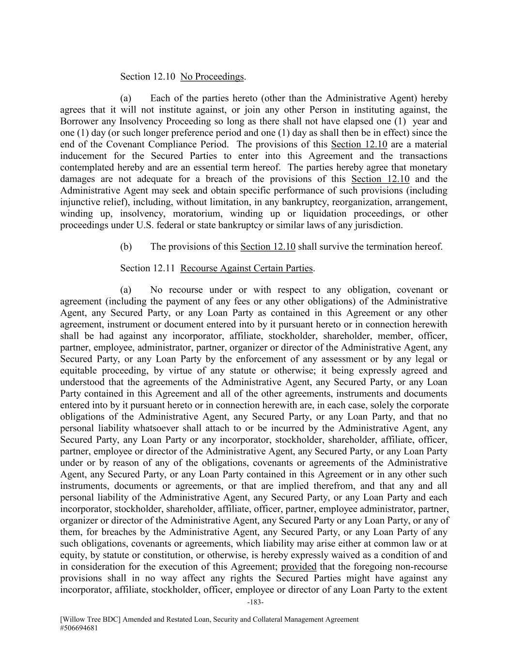 Section 12.10 No Proceedings. (a) Each of the parties hereto (other than the Administrative Agent) hereby agrees that it will not institute against, or join any other Person in instituting against, the Borrower any Insolvency Proceeding so long as there shall not have elapsed one (1) year and one (1) day (or such longer preference period and one (1) day as shall then be in effect) since the end of the Covenant Compliance Period. The provisions of this Section 12.10 are a material inducement for the Secured Parties to enter into this Agreement and the transactions contemplated hereby and are an essential term hereof. The parties hereby agree that monetary damages are not adequate for a breach of the provisions of this Section 12.10 and the Administrative Agent may seek and obtain specific performance of such provisions (including injunctive relief), including, without limitation, in any bankruptcy, reorganization, arrangement, winding up, insolvency, moratorium, winding up or liquidation proceedings, or other proceedings under U.S. federal or state bankruptcy or similar laws of any jurisdiction. (b) The provisions of this Section 12.10 shall survive the termination hereof. Section 12.11 Recourse Against Certain Parties. (a) No recourse under or with respect to any obligation, covenant or agreement (including the payment of any fees or any other obligations) of the Administrative Agent, any Secured Party, or any Loan Party as contained in this Agreement or any other agreement, instrument or document entered into by it pursuant hereto or in connection herewith shall be had against any incorporator, affiliate, stockholder, shareholder, member, officer, partner, employee, administrator, partner, organizer or director of the Administrative Agent, any Secured Party, or any Loan Party by the enforcement of any assessment or by any legal or equitable proceeding, by virtue of any statute or otherwise; it being expressly agreed and understood that the agreements of the Administrative Agent, any Secured Party, or any Loan Party contained in this Agreement and all of the other agreements, instruments and documents entered into by it pursuant hereto or in connection herewith are, in each case, solely the corporate obligations of the Administrative Agent, any Secured Party, or any Loan Party, and that no personal liability whatsoever shall attach to or be incurred by the Administrative Agent, any Secured Party, any Loan Party or any incorporator, stockholder, shareholder, affiliate, officer, partner, employee or director of the Administrative Agent, any Secured Party, or any Loan Party under or by reason of any of the obligations, covenants or agreements of the Administrative Agent, any Secured Party, or any Loan Party contained in this Agreement or in any other such instruments, documents or agreements, or that are implied therefrom, and that any and all personal liability of the Administrative Agent, any Secured Party, or any Loan Party and each incorporator, stockholder, shareholder, affiliate, officer, partner, employee administrator, partner, organizer or director of the Administrative Agent, any Secured Party or any Loan Party, or any of them, for breaches by the Administrative Agent, any Secured Party, or any Loan Party of any such obligations, covenants or agreements, which liability may arise either at common law or at equity, by statute or constitution, or otherwise, is hereby expressly waived as a condition of and in consideration for the execution of this Agreement; provided that the foregoing non-recourse provisions shall in no way affect any rights the Secured Parties might have against any incorporator, affiliate, stockholder, officer, employee or director of any Loan Party to the extent -183- [Willow Tree BDC] Amended and Restated Loan, Security and Collateral Management Agreement #506694681