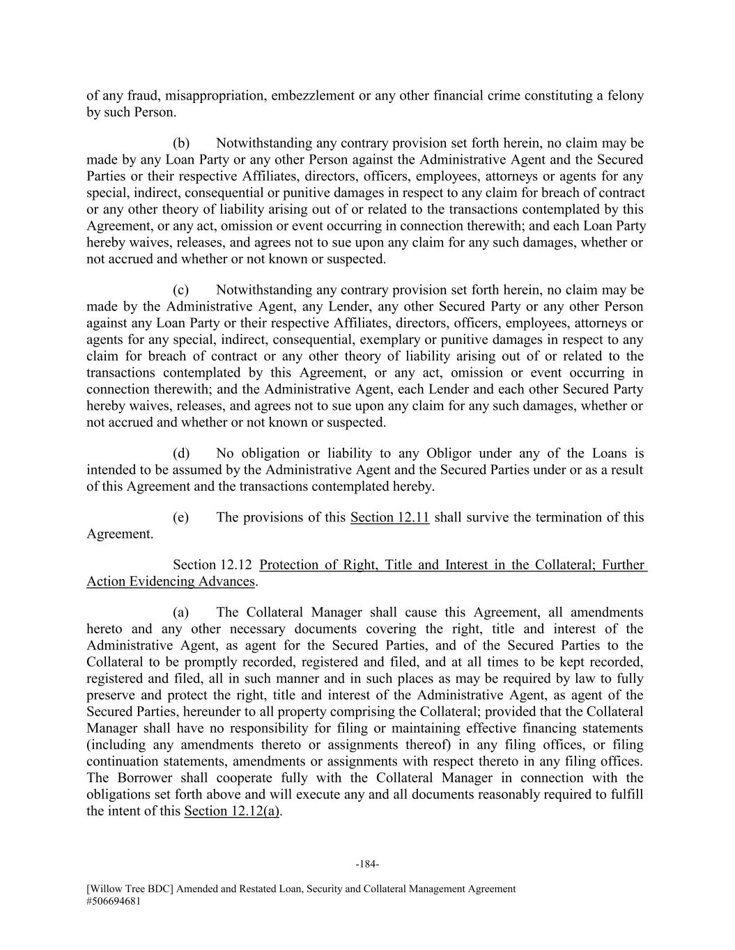of any fraud, misappropriation, embezzlement or any other financial crime constituting a felony by such Person. (b) Notwithstanding any contrary provision set forth herein, no claim may be made by any Loan Party or any other Person against the Administrative Agent and the Secured Parties or their respective Affiliates, directors, officers, employees, attorneys or agents for any special, indirect, consequential or punitive damages in respect to any claim for breach of contract or any other theory of liability arising out of or related to the transactions contemplated by this Agreement, or any act, omission or event occurring in connection therewith; and each Loan Party hereby waives, releases, and agrees not to sue upon any claim for any such damages, whether or not accrued and whether or not known or suspected. (c) Notwithstanding any contrary provision set forth herein, no claim may be made by the Administrative Agent, any Lender, any other Secured Party or any other Person against any Loan Party or their respective Affiliates, directors, officers, employees, attorneys or agents for any special, indirect, consequential, exemplary or punitive damages in respect to any claim for breach of contract or any other theory of liability arising out of or related to the transactions contemplated by this Agreement, or any act, omission or event occurring in connection therewith; and the Administrative Agent, each Lender and each other Secured Party hereby waives, releases, and agrees not to sue upon any claim for any such damages, whether or not accrued and whether or not known or suspected. (d) No obligation or liability to any Obligor under any of the Loans is intended to be assumed by the Administrative Agent and the Secured Parties under or as a result of this Agreement and the transactions contemplated hereby. (e) The provisions of this Section 12.11 shall survive the termination of this Agreement. Section 12.12 Protection of Right, Title and Interest in the Collateral; Further Action Evidencing Advances. (a) The Collateral Manager shall cause this Agreement, all amendments hereto and any other necessary documents covering the right, title and interest of the Administrative Agent, as agent for the Secured Parties, and of the Secured Parties to the Collateral to be promptly recorded, registered and filed, and at all times to be kept recorded, registered and filed, all in such manner and in such places as may be required by law to fully preserve and protect the right, title and interest of the Administrative Agent, as agent of the Secured Parties, hereunder to all property comprising the Collateral; provided that the Collateral Manager shall have no responsibility for filing or maintaining effective financing statements (including any amendments thereto or assignments thereof) in any filing offices, or filing continuation statements, amendments or assignments with respect thereto in any filing offices. The Borrower shall cooperate fully with the Collateral Manager in connection with the obligations set forth above and will execute any and all documents reasonably required to fulfill the intent of this Section 12.12(a). -184- [Willow Tree BDC] Amended and Restated Loan, Security and Collateral Management Agreement #506694681