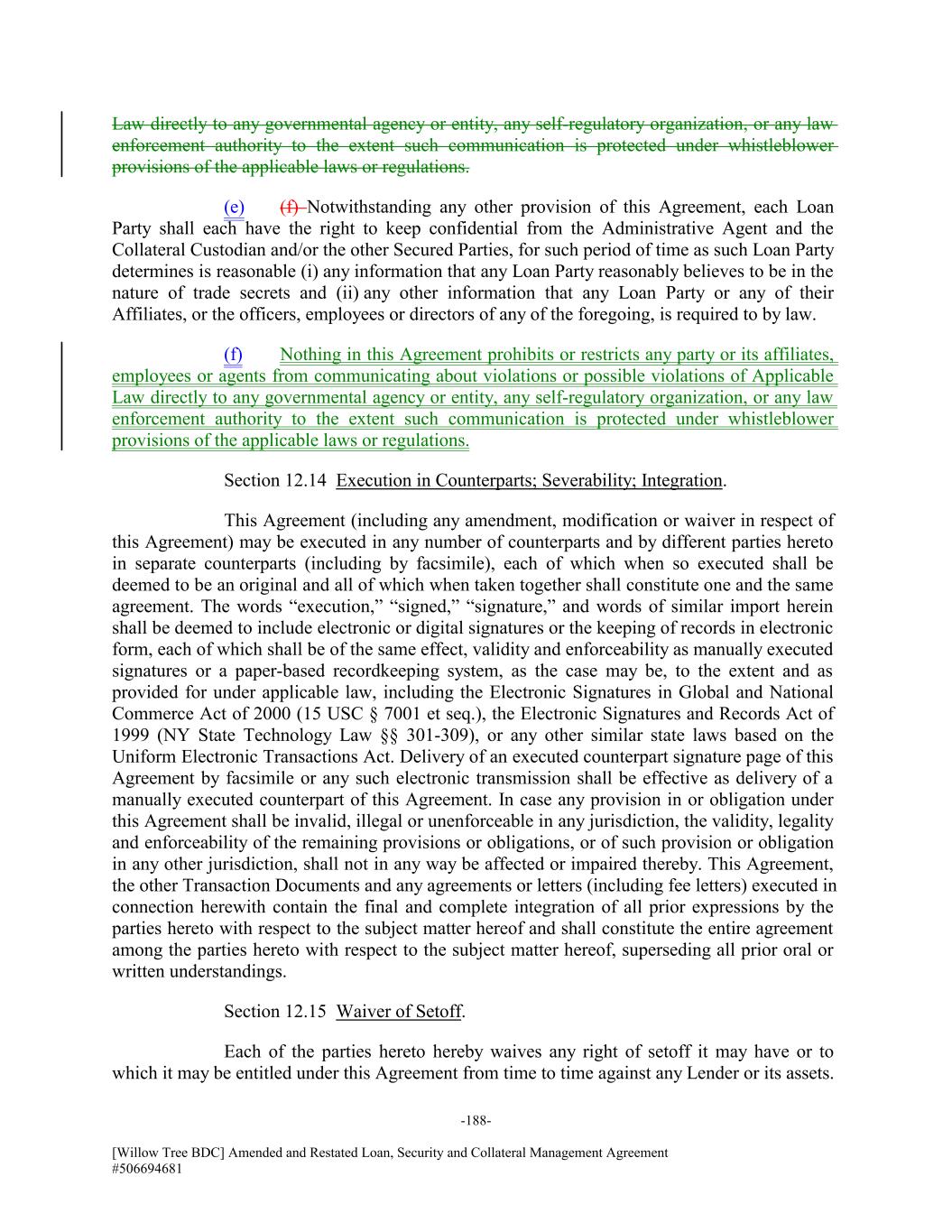 Law directly to any governmental agency or entity, any self-regulatory organization, or any law enforcement authority to the extent such communication is protected under whistleblower provisions of the applicable laws or regulations. (e) (f) Notwithstanding any other provision of this Agreement, each Loan Party shall each have the right to keep confidential from the Administrative Agent and the Collateral Custodian and/or the other Secured Parties, for such period of time as such Loan Party determines is reasonable (i) any information that any Loan Party reasonably believes to be in the nature of trade secrets and (ii) any other information that any Loan Party or any of their Affiliates, or the officers, employees or directors of any of the foregoing, is required to by law. (f) Nothing in this Agreement prohibits or restricts any party or its affiliates, employees or agents from communicating about violations or possible violations of Applicable Law directly to any governmental agency or entity, any self-regulatory organization, or any law enforcement authority to the extent such communication is protected under whistleblower provisions of the applicable laws or regulations. Section 12.14 Execution in Counterparts; Severability; Integration. This Agreement (including any amendment, modification or waiver in respect of this Agreement) may be executed in any number of counterparts and by different parties hereto in separate counterparts (including by facsimile), each of which when so executed shall be deemed to be an original and all of which when taken together shall constitute one and the same agreement. The words “execution,” “signed,” “signature,” and words of similar import herein shall be deemed to include electronic or digital signatures or the keeping of records in electronic form, each of which shall be of the same effect, validity and enforceability as manually executed signatures or a paper-based recordkeeping system, as the case may be, to the extent and as provided for under applicable law, including the Electronic Signatures in Global and National Commerce Act of 2000 (15 USC § 7001 et seq.), the Electronic Signatures and Records Act of 1999 (NY State Technology Law §§ 301-309), or any other similar state laws based on the Uniform Electronic Transactions Act. Delivery of an executed counterpart signature page of this Agreement by facsimile or any such electronic transmission shall be effective as delivery of a manually executed counterpart of this Agreement. In case any provision in or obligation under this Agreement shall be invalid, illegal or unenforceable in any jurisdiction, the validity, legality and enforceability of the remaining provisions or obligations, or of such provision or obligation in any other jurisdiction, shall not in any way be affected or impaired thereby. This Agreement, the other Transaction Documents and any agreements or letters (including fee letters) executed in connection herewith contain the final and complete integration of all prior expressions by the parties hereto with respect to the subject matter hereof and shall constitute the entire agreement among the parties hereto with respect to the subject matter hereof, superseding all prior oral or written understandings. Section 12.15 Waiver of Setoff. Each of the parties hereto hereby waives any right of setoff it may have or to which it may be entitled under this Agreement from time to time against any Lender or its assets. -188- [Willow Tree BDC] Amended and Restated Loan, Security and Collateral Management Agreement #506694681