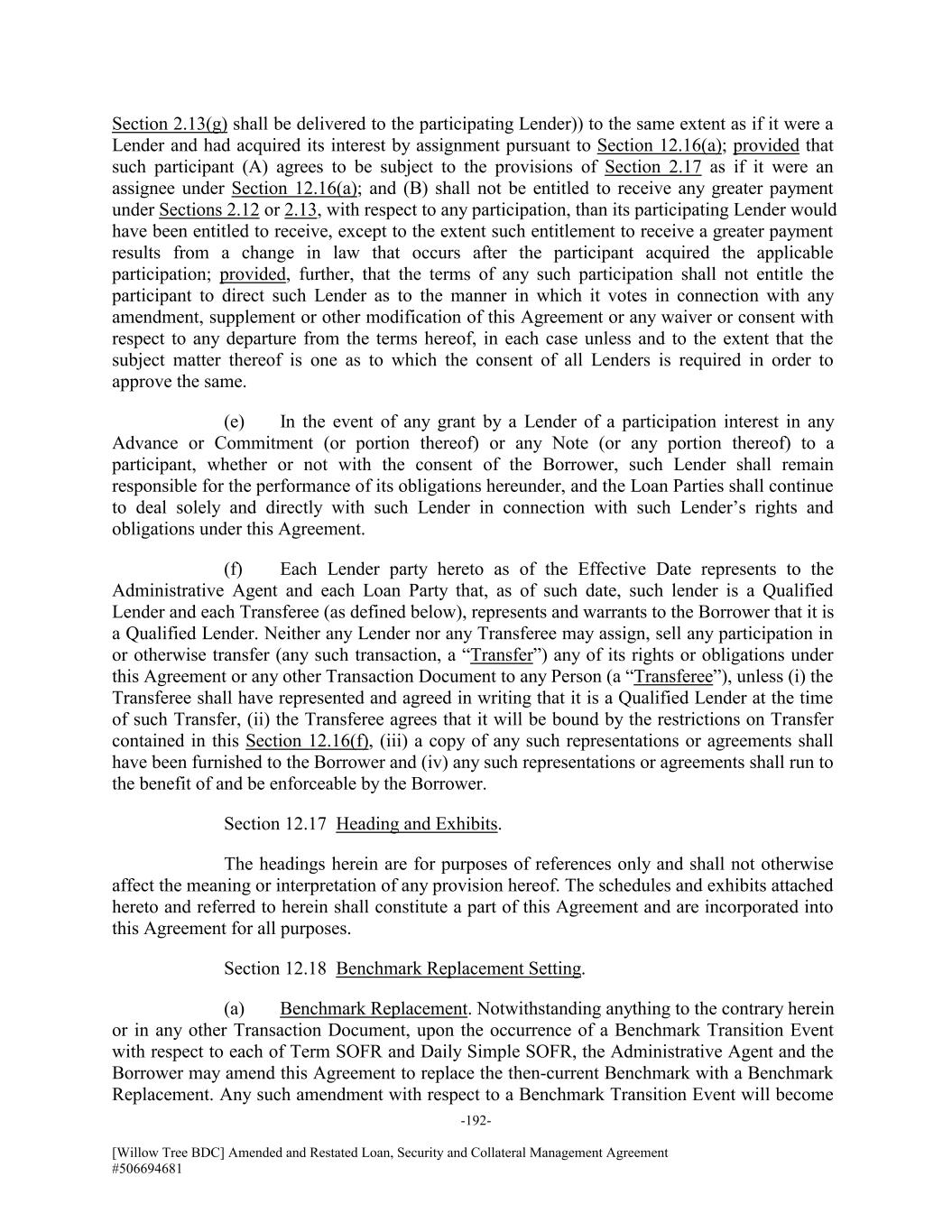 Section 2.13(g) shall be delivered to the participating Lender)) to the same extent as if it were a Lender and had acquired its interest by assignment pursuant to Section 12.16(a); provided that such participant (A) agrees to be subject to the provisions of Section 2.17 as if it were an assignee under Section 12.16(a); and (B) shall not be entitled to receive any greater payment under Sections 2.12 or 2.13, with respect to any participation, than its participating Lender would have been entitled to receive, except to the extent such entitlement to receive a greater payment results from a change in law that occurs after the participant acquired the applicable participation; provided, further, that the terms of any such participation shall not entitle the participant to direct such Lender as to the manner in which it votes in connection with any amendment, supplement or other modification of this Agreement or any waiver or consent with respect to any departure from the terms hereof, in each case unless and to the extent that the subject matter thereof is one as to which the consent of all Lenders is required in order to approve the same. (e) In the event of any grant by a Lender of a participation interest in any Advance or Commitment (or portion thereof) or any Note (or any portion thereof) to a participant, whether or not with the consent of the Borrower, such Lender shall remain responsible for the performance of its obligations hereunder, and the Loan Parties shall continue to deal solely and directly with such Lender in connection with such Lender’s rights and obligations under this Agreement. (f) Each Lender party hereto as of the Effective Date represents to the Administrative Agent and each Loan Party that, as of such date, such lender is a Qualified Lender and each Transferee (as defined below), represents and warrants to the Borrower that it is a Qualified Lender. Neither any Lender nor any Transferee may assign, sell any participation in or otherwise transfer (any such transaction, a “Transfer”) any of its rights or obligations under this Agreement or any other Transaction Document to any Person (a “Transferee”), unless (i) the Transferee shall have represented and agreed in writing that it is a Qualified Lender at the time of such Transfer, (ii) the Transferee agrees that it will be bound by the restrictions on Transfer contained in this Section 12.16(f), (iii) a copy of any such representations or agreements shall have been furnished to the Borrower and (iv) any such representations or agreements shall run to the benefit of and be enforceable by the Borrower. Section 12.17 Heading and Exhibits. The headings herein are for purposes of references only and shall not otherwise affect the meaning or interpretation of any provision hereof. The schedules and exhibits attached hereto and referred to herein shall constitute a part of this Agreement and are incorporated into this Agreement for all purposes. Section 12.18 Benchmark Replacement Setting. (a) Benchmark Replacement. Notwithstanding anything to the contrary herein or in any other Transaction Document, upon the occurrence of a Benchmark Transition Event with respect to each of Term SOFR and Daily Simple SOFR, the Administrative Agent and the Borrower may amend this Agreement to replace the then-current Benchmark with a Benchmark Replacement. Any such amendment with respect to a Benchmark Transition Event will become -192- [Willow Tree BDC] Amended and Restated Loan, Security and Collateral Management Agreement #506694681