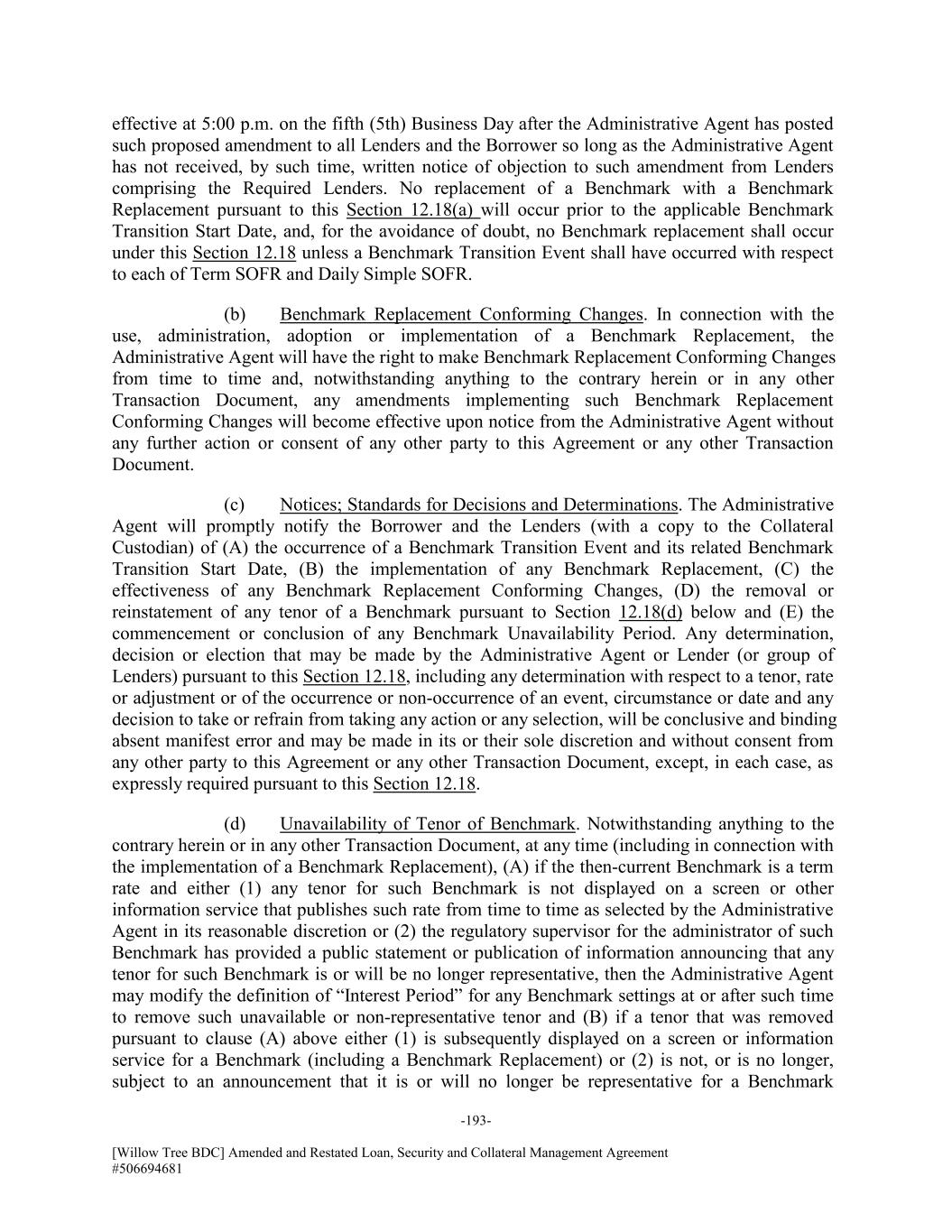 effective at 5:00 p.m. on the fifth (5th) Business Day after the Administrative Agent has posted such proposed amendment to all Lenders and the Borrower so long as the Administrative Agent has not received, by such time, written notice of objection to such amendment from Lenders comprising the Required Lenders. No replacement of a Benchmark with a Benchmark Replacement pursuant to this Section 12.18(a) will occur prior to the applicable Benchmark Transition Start Date, and, for the avoidance of doubt, no Benchmark replacement shall occur under this Section 12.18 unless a Benchmark Transition Event shall have occurred with respect to each of Term SOFR and Daily Simple SOFR. (b) Benchmark Replacement Conforming Changes. In connection with the use, administration, adoption or implementation of a Benchmark Replacement, the Administrative Agent will have the right to make Benchmark Replacement Conforming Changes from time to time and, notwithstanding anything to the contrary herein or in any other Transaction Document, any amendments implementing such Benchmark Replacement Conforming Changes will become effective upon notice from the Administrative Agent without any further action or consent of any other party to this Agreement or any other Transaction Document. (c) Notices; Standards for Decisions and Determinations. The Administrative Agent will promptly notify the Borrower and the Lenders (with a copy to the Collateral Custodian) of (A) the occurrence of a Benchmark Transition Event and its related Benchmark Transition Start Date, (B) the implementation of any Benchmark Replacement, (C) the effectiveness of any Benchmark Replacement Conforming Changes, (D) the removal or reinstatement of any tenor of a Benchmark pursuant to Section 12.18(d) below and (E) the commencement or conclusion of any Benchmark Unavailability Period. Any determination, decision or election that may be made by the Administrative Agent or Lender (or group of Lenders) pursuant to this Section 12.18, including any determination with respect to a tenor, rate or adjustment or of the occurrence or non-occurrence of an event, circumstance or date and any decision to take or refrain from taking any action or any selection, will be conclusive and binding absent manifest error and may be made in its or their sole discretion and without consent from any other party to this Agreement or any other Transaction Document, except, in each case, as expressly required pursuant to this Section 12.18. (d) Unavailability of Tenor of Benchmark. Notwithstanding anything to the contrary herein or in any other Transaction Document, at any time (including in connection with the implementation of a Benchmark Replacement), (A) if the then-current Benchmark is a term rate and either (1) any tenor for such Benchmark is not displayed on a screen or other information service that publishes such rate from time to time as selected by the Administrative Agent in its reasonable discretion or (2) the regulatory supervisor for the administrator of such Benchmark has provided a public statement or publication of information announcing that any tenor for such Benchmark is or will be no longer representative, then the Administrative Agent may modify the definition of “Interest Period” for any Benchmark settings at or after such time to remove such unavailable or non-representative tenor and (B) if a tenor that was removed pursuant to clause (A) above either (1) is subsequently displayed on a screen or information service for a Benchmark (including a Benchmark Replacement) or (2) is not, or is no longer, subject to an announcement that it is or will no longer be representative for a Benchmark -193- [Willow Tree BDC] Amended and Restated Loan, Security and Collateral Management Agreement #506694681