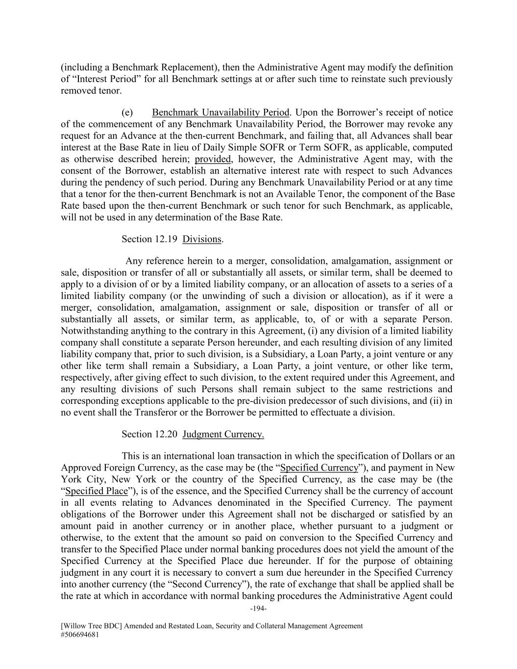 (including a Benchmark Replacement), then the Administrative Agent may modify the definition of “Interest Period” for all Benchmark settings at or after such time to reinstate such previously removed tenor. (e) Benchmark Unavailability Period. Upon the Borrower’s receipt of notice of the commencement of any Benchmark Unavailability Period, the Borrower may revoke any request for an Advance at the then-current Benchmark, and failing that, all Advances shall bear interest at the Base Rate in lieu of Daily Simple SOFR or Term SOFR, as applicable, computed as otherwise described herein; provided, however, the Administrative Agent may, with the consent of the Borrower, establish an alternative interest rate with respect to such Advances during the pendency of such period. During any Benchmark Unavailability Period or at any time that a tenor for the then-current Benchmark is not an Available Tenor, the component of the Base Rate based upon the then-current Benchmark or such tenor for such Benchmark, as applicable, will not be used in any determination of the Base Rate. Section 12.19 Divisions. Any reference herein to a merger, consolidation, amalgamation, assignment or sale, disposition or transfer of all or substantially all assets, or similar term, shall be deemed to apply to a division of or by a limited liability company, or an allocation of assets to a series of a limited liability company (or the unwinding of such a division or allocation), as if it were a merger, consolidation, amalgamation, assignment or sale, disposition or transfer of all or substantially all assets, or similar term, as applicable, to, of or with a separate Person. Notwithstanding anything to the contrary in this Agreement, (i) any division of a limited liability company shall constitute a separate Person hereunder, and each resulting division of any limited liability company that, prior to such division, is a Subsidiary, a Loan Party, a joint venture or any other like term shall remain a Subsidiary, a Loan Party, a joint venture, or other like term, respectively, after giving effect to such division, to the extent required under this Agreement, and any resulting divisions of such Persons shall remain subject to the same restrictions and corresponding exceptions applicable to the pre-division predecessor of such divisions, and (ii) in no event shall the Transferor or the Borrower be permitted to effectuate a division. Section 12.20 Judgment Currency. This is an international loan transaction in which the specification of Dollars or an Approved Foreign Currency, as the case may be (the “Specified Currency”), and payment in New York City, New York or the country of the Specified Currency, as the case may be (the “Specified Place”), is of the essence, and the Specified Currency shall be the currency of account in all events relating to Advances denominated in the Specified Currency. The payment obligations of the Borrower under this Agreement shall not be discharged or satisfied by an amount paid in another currency or in another place, whether pursuant to a judgment or otherwise, to the extent that the amount so paid on conversion to the Specified Currency and transfer to the Specified Place under normal banking procedures does not yield the amount of the Specified Currency at the Specified Place due hereunder. If for the purpose of obtaining judgment in any court it is necessary to convert a sum due hereunder in the Specified Currency into another currency (the “Second Currency”), the rate of exchange that shall be applied shall be the rate at which in accordance with normal banking procedures the Administrative Agent could -194- [Willow Tree BDC] Amended and Restated Loan, Security and Collateral Management Agreement #506694681