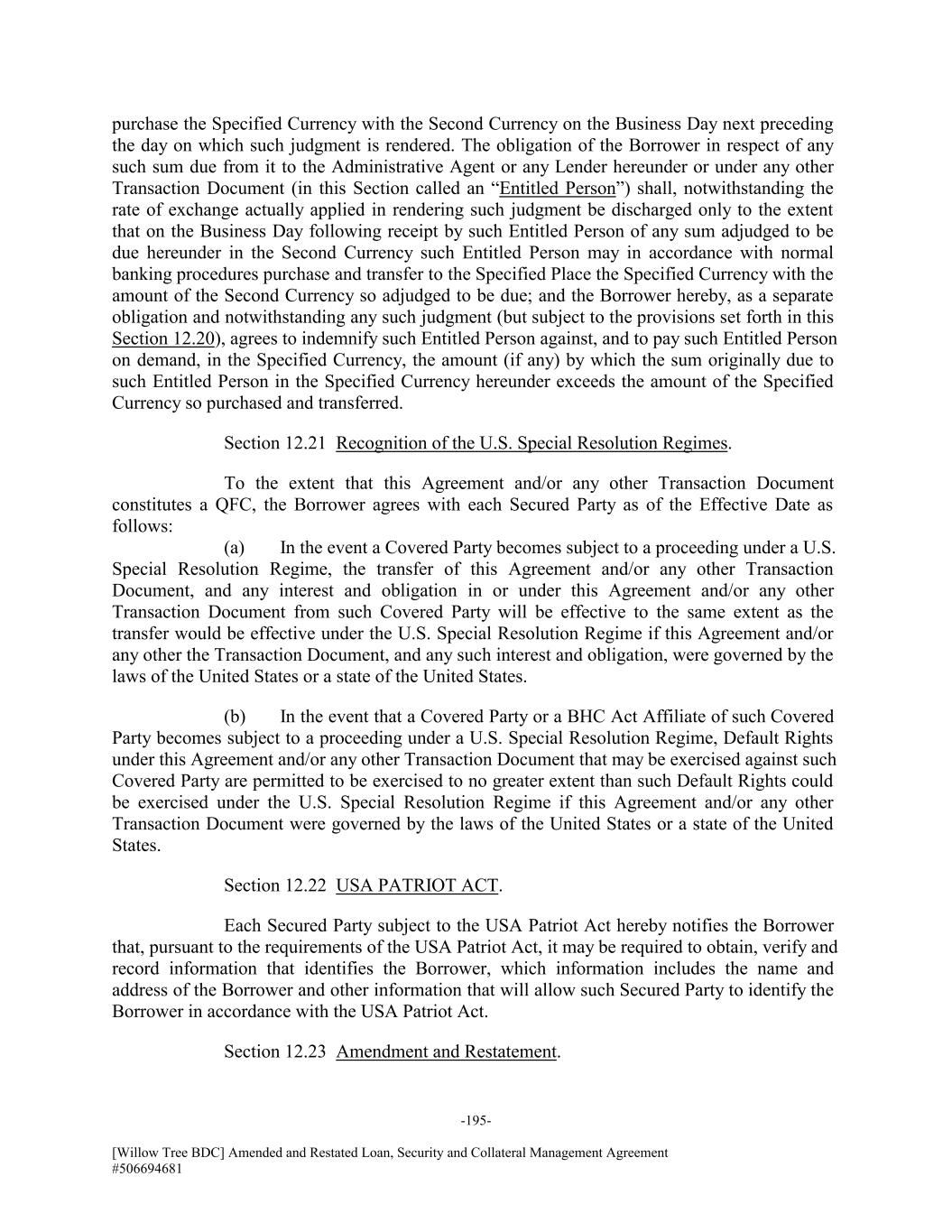 purchase the Specified Currency with the Second Currency on the Business Day next preceding the day on which such judgment is rendered. The obligation of the Borrower in respect of any such sum due from it to the Administrative Agent or any Lender hereunder or under any other Transaction Document (in this Section called an “Entitled Person”) shall, notwithstanding the rate of exchange actually applied in rendering such judgment be discharged only to the extent that on the Business Day following receipt by such Entitled Person of any sum adjudged to be due hereunder in the Second Currency such Entitled Person may in accordance with normal banking procedures purchase and transfer to the Specified Place the Specified Currency with the amount of the Second Currency so adjudged to be due; and the Borrower hereby, as a separate obligation and notwithstanding any such judgment (but subject to the provisions set forth in this Section 12.20), agrees to indemnify such Entitled Person against, and to pay such Entitled Person on demand, in the Specified Currency, the amount (if any) by which the sum originally due to such Entitled Person in the Specified Currency hereunder exceeds the amount of the Specified Currency so purchased and transferred. Section 12.21 Recognition of the U.S. Special Resolution Regimes. To the extent that this Agreement and/or any other Transaction Document constitutes a QFC, the Borrower agrees with each Secured Party as of the Effective Date as follows: (a) In the event a Covered Party becomes subject to a proceeding under a U.S. Special Resolution Regime, the transfer of this Agreement and/or any other Transaction Document, and any interest and obligation in or under this Agreement and/or any other Transaction Document from such Covered Party will be effective to the same extent as the transfer would be effective under the U.S. Special Resolution Regime if this Agreement and/or any other the Transaction Document, and any such interest and obligation, were governed by the laws of the United States or a state of the United States. (b) In the event that a Covered Party or a BHC Act Affiliate of such Covered Party becomes subject to a proceeding under a U.S. Special Resolution Regime, Default Rights under this Agreement and/or any other Transaction Document that may be exercised against such Covered Party are permitted to be exercised to no greater extent than such Default Rights could be exercised under the U.S. Special Resolution Regime if this Agreement and/or any other Transaction Document were governed by the laws of the United States or a state of the United States. Section 12.22 USA PATRIOT ACT. Each Secured Party subject to the USA Patriot Act hereby notifies the Borrower that, pursuant to the requirements of the USA Patriot Act, it may be required to obtain, verify and record information that identifies the Borrower, which information includes the name and address of the Borrower and other information that will allow such Secured Party to identify the Borrower in accordance with the USA Patriot Act. Section 12.23 Amendment and Restatement. -195- [Willow Tree BDC] Amended and Restated Loan, Security and Collateral Management Agreement #506694681