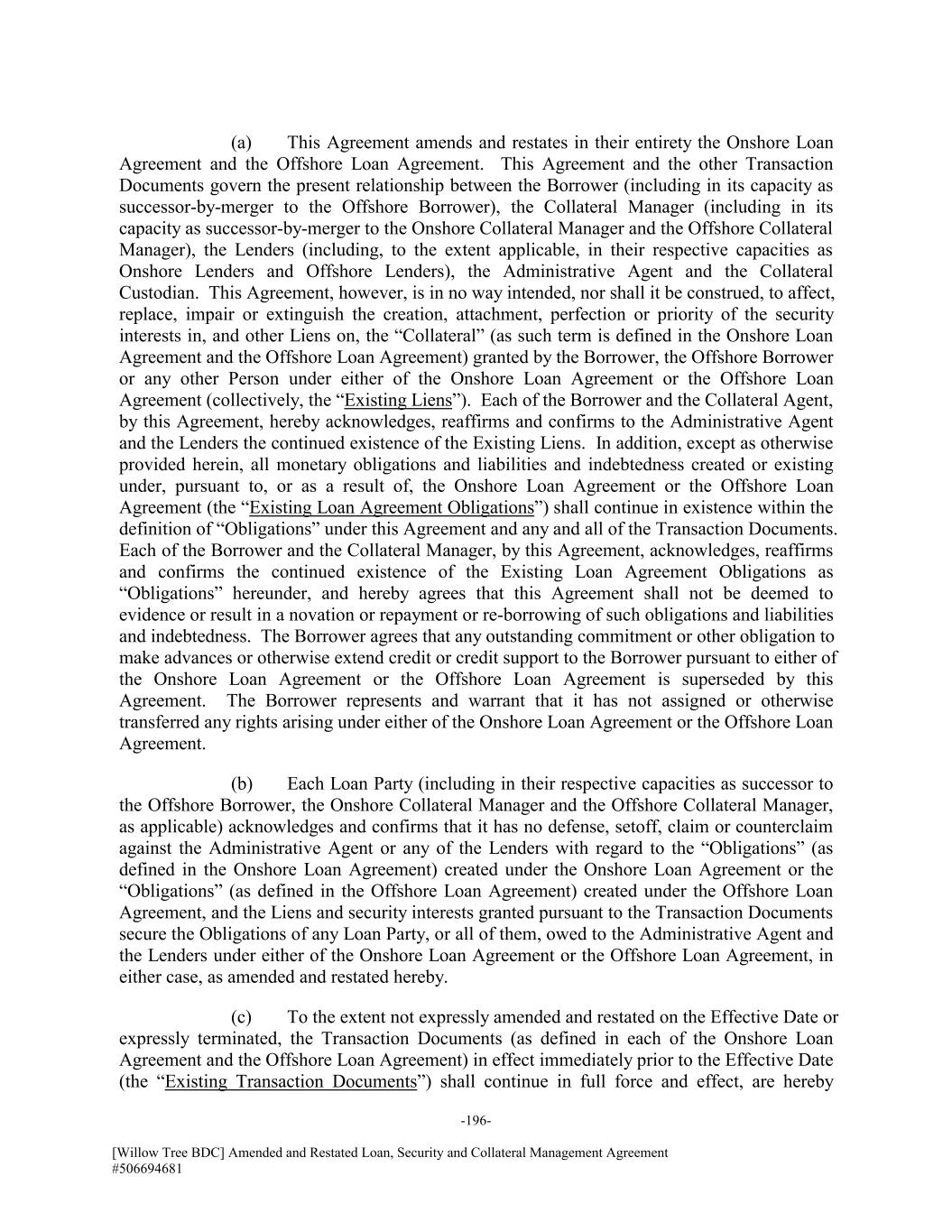 (a) This Agreement amends and restates in their entirety the Onshore Loan Agreement and the Offshore Loan Agreement. This Agreement and the other Transaction Documents govern the present relationship between the Borrower (including in its capacity as successor-by-merger to the Offshore Borrower), the Collateral Manager (including in its capacity as successor-by-merger to the Onshore Collateral Manager and the Offshore Collateral Manager), the Lenders (including, to the extent applicable, in their respective capacities as Onshore Lenders and Offshore Lenders), the Administrative Agent and the Collateral Custodian. This Agreement, however, is in no way intended, nor shall it be construed, to affect, replace, impair or extinguish the creation, attachment, perfection or priority of the security interests in, and other Liens on, the “Collateral” (as such term is defined in the Onshore Loan Agreement and the Offshore Loan Agreement) granted by the Borrower, the Offshore Borrower or any other Person under either of the Onshore Loan Agreement or the Offshore Loan Agreement (collectively, the “Existing Liens”). Each of the Borrower and the Collateral Agent, by this Agreement, hereby acknowledges, reaffirms and confirms to the Administrative Agent and the Lenders the continued existence of the Existing Liens. In addition, except as otherwise provided herein, all monetary obligations and liabilities and indebtedness created or existing under, pursuant to, or as a result of, the Onshore Loan Agreement or the Offshore Loan Agreement (the “Existing Loan Agreement Obligations”) shall continue in existence within the definition of “Obligations” under this Agreement and any and all of the Transaction Documents. Each of the Borrower and the Collateral Manager, by this Agreement, acknowledges, reaffirms and confirms the continued existence of the Existing Loan Agreement Obligations as “Obligations” hereunder, and hereby agrees that this Agreement shall not be deemed to evidence or result in a novation or repayment or re-borrowing of such obligations and liabilities and indebtedness. The Borrower agrees that any outstanding commitment or other obligation to make advances or otherwise extend credit or credit support to the Borrower pursuant to either of the Onshore Loan Agreement or the Offshore Loan Agreement is superseded by this Agreement. The Borrower represents and warrant that it has not assigned or otherwise transferred any rights arising under either of the Onshore Loan Agreement or the Offshore Loan Agreement. (b) Each Loan Party (including in their respective capacities as successor to the Offshore Borrower, the Onshore Collateral Manager and the Offshore Collateral Manager, as applicable) acknowledges and confirms that it has no defense, setoff, claim or counterclaim against the Administrative Agent or any of the Lenders with regard to the “Obligations” (as defined in the Onshore Loan Agreement) created under the Onshore Loan Agreement or the “Obligations” (as defined in the Offshore Loan Agreement) created under the Offshore Loan Agreement, and the Liens and security interests granted pursuant to the Transaction Documents secure the Obligations of any Loan Party, or all of them, owed to the Administrative Agent and the Lenders under either of the Onshore Loan Agreement or the Offshore Loan Agreement, in either case, as amended and restated hereby. (c) To the extent not expressly amended and restated on the Effective Date or expressly terminated, the Transaction Documents (as defined in each of the Onshore Loan Agreement and the Offshore Loan Agreement) in effect immediately prior to the Effective Date (the “Existing Transaction Documents”) shall continue in full force and effect, are hereby -196- [Willow Tree BDC] Amended and Restated Loan, Security and Collateral Management Agreement #506694681