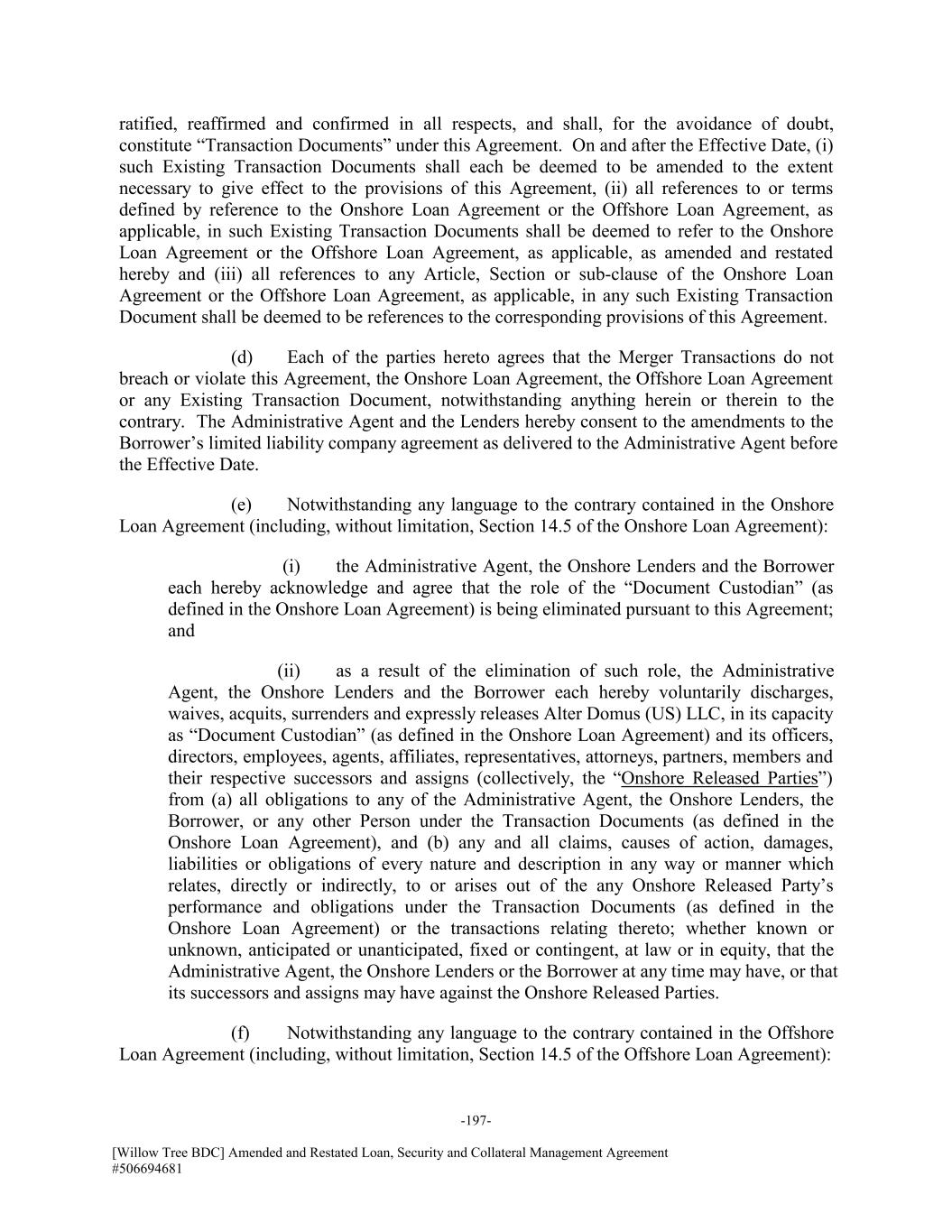 ratified, reaffirmed and confirmed in all respects, and shall, for the avoidance of doubt, constitute “Transaction Documents” under this Agreement. On and after the Effective Date, (i) such Existing Transaction Documents shall each be deemed to be amended to the extent necessary to give effect to the provisions of this Agreement, (ii) all references to or terms defined by reference to the Onshore Loan Agreement or the Offshore Loan Agreement, as applicable, in such Existing Transaction Documents shall be deemed to refer to the Onshore Loan Agreement or the Offshore Loan Agreement, as applicable, as amended and restated hereby and (iii) all references to any Article, Section or sub-clause of the Onshore Loan Agreement or the Offshore Loan Agreement, as applicable, in any such Existing Transaction Document shall be deemed to be references to the corresponding provisions of this Agreement. (d) Each of the parties hereto agrees that the Merger Transactions do not breach or violate this Agreement, the Onshore Loan Agreement, the Offshore Loan Agreement or any Existing Transaction Document, notwithstanding anything herein or therein to the contrary. The Administrative Agent and the Lenders hereby consent to the amendments to the Borrower’s limited liability company agreement as delivered to the Administrative Agent before the Effective Date. (e) Notwithstanding any language to the contrary contained in the Onshore Loan Agreement (including, without limitation, Section 14.5 of the Onshore Loan Agreement): (i) the Administrative Agent, the Onshore Lenders and the Borrower each hereby acknowledge and agree that the role of the “Document Custodian” (as defined in the Onshore Loan Agreement) is being eliminated pursuant to this Agreement; and (ii) as a result of the elimination of such role, the Administrative Agent, the Onshore Lenders and the Borrower each hereby voluntarily discharges, waives, acquits, surrenders and expressly releases Alter Domus (US) LLC, in its capacity as “Document Custodian” (as defined in the Onshore Loan Agreement) and its officers, directors, employees, agents, affiliates, representatives, attorneys, partners, members and their respective successors and assigns (collectively, the “Onshore Released Parties”) from (a) all obligations to any of the Administrative Agent, the Onshore Lenders, the Borrower, or any other Person under the Transaction Documents (as defined in the Onshore Loan Agreement), and (b) any and all claims, causes of action, damages, liabilities or obligations of every nature and description in any way or manner which relates, directly or indirectly, to or arises out of the any Onshore Released Party’s performance and obligations under the Transaction Documents (as defined in the Onshore Loan Agreement) or the transactions relating thereto; whether known or unknown, anticipated or unanticipated, fixed or contingent, at law or in equity, that the Administrative Agent, the Onshore Lenders or the Borrower at any time may have, or that its successors and assigns may have against the Onshore Released Parties. (f) Notwithstanding any language to the contrary contained in the Offshore Loan Agreement (including, without limitation, Section 14.5 of the Offshore Loan Agreement): -197- [Willow Tree BDC] Amended and Restated Loan, Security and Collateral Management Agreement #506694681