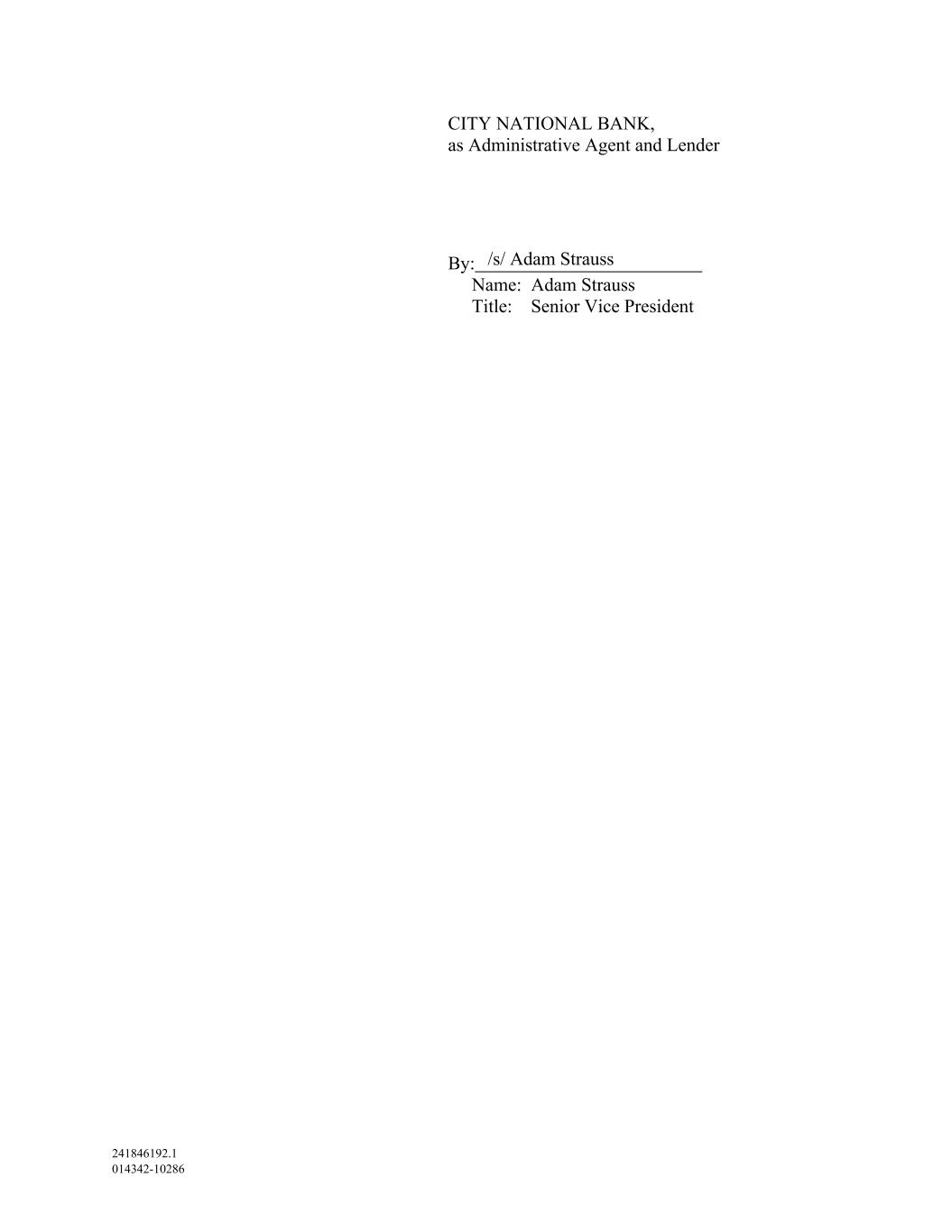 241846192.1 014342-10286 CITY NATIONAL BANK, as Administrative Agent and Lender By: Name: Adam Strauss Title: Senior Vice President /s/ Adam Strauss