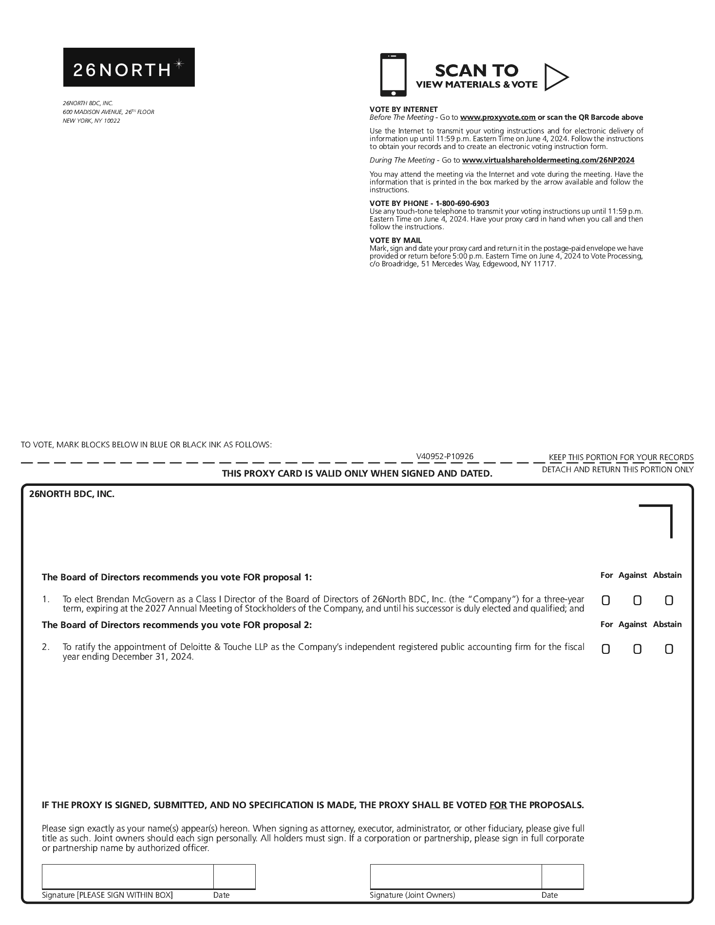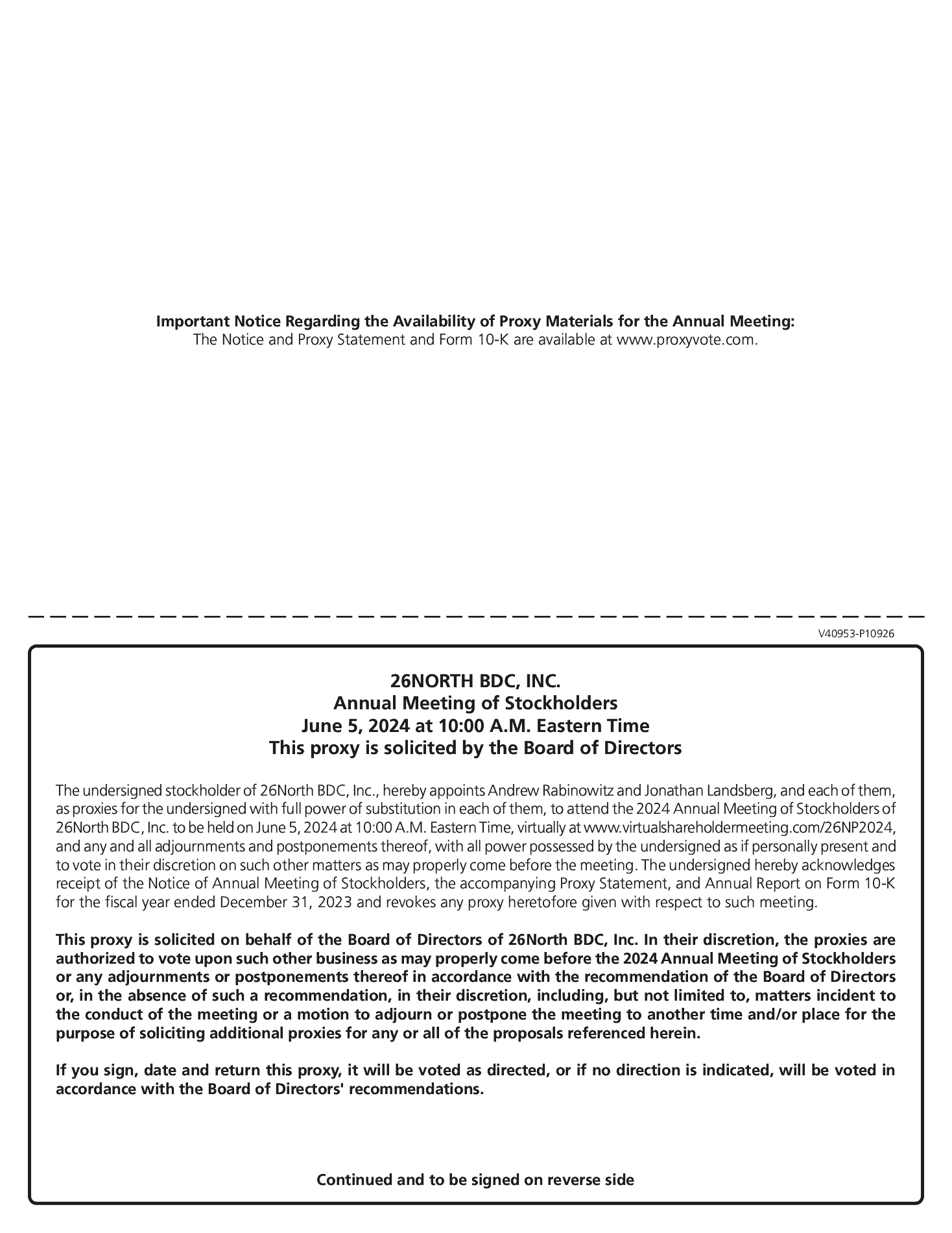 The Company expects that the 2025 Annual Meeting of Stockholders will be held in June 2025, but the exact date, time and location of such meeting have yet to be determined. A Stockholder who intends to present a proposal at that annual meeting, including nomination of a director, must submit the proposal in writing to the Secretary of the Company, c/o 26North BDC, Inc., 600 Madison Avenue, 26th Floor, New York, NY 10022. Notices of intention to present proposals, including nomination of a director, at the 2025 Annual Meeting of Stockholders must be received by the Company no earlier than November 16, 2024 and no later than 5:00 p.m., Eastern Time, on December 16, 2024. If the 2025 Annual Meeting of Stockholders is scheduled to be held on a date more than 30 days prior to or after such anniversary date, stockholder proposals or director nominations must be received no later than the 10th day following the day on which such notice of the date of the 2025 Annual Meeting of Stockholders was