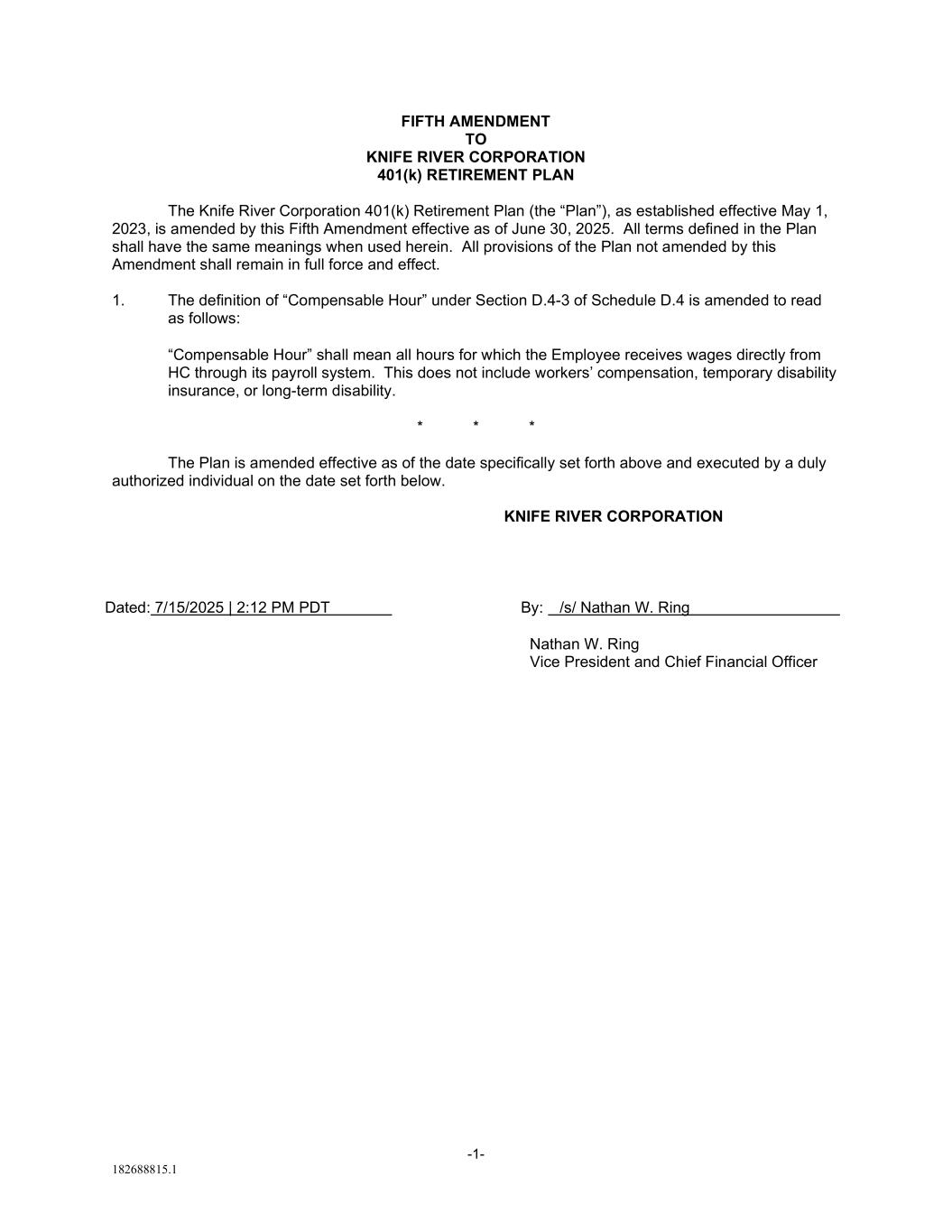 -1- 182688815.1 FIFTH AMENDMENT TO KNIFE RIVER CORPORATION 401(k) RETIREMENT PLAN The Knife River Corporation 401(k) Retirement Plan (the “Plan”), as established effective May 1, 2023, is amended by this Fifth Amendment effective as of June 30, 2025. All terms defined in the Plan shall have the same meanings when used herein. All provisions of the Plan not amended by this Amendment shall remain in full force and effect. 1. The definition of “Compensable Hour” under Section D.4-3 of Schedule D.4 is amended to read as follows: “Compensable Hour” shall mean all hours for which the Employee receives wages directly from HC through its payroll system. This does not include workers’ compensation, temporary disability insurance, or long-term disability. * * * The Plan is amended effective as of the date specifically set forth above and executed by a duly authorized individual on the date set forth below. KNIFE RIVER CORPORATION Dated: 7/15/2025 | 2:12 PM PDT By: /s/ Nathan W. Ring Nathan W. Ring Vice President and Chief Financial Officer