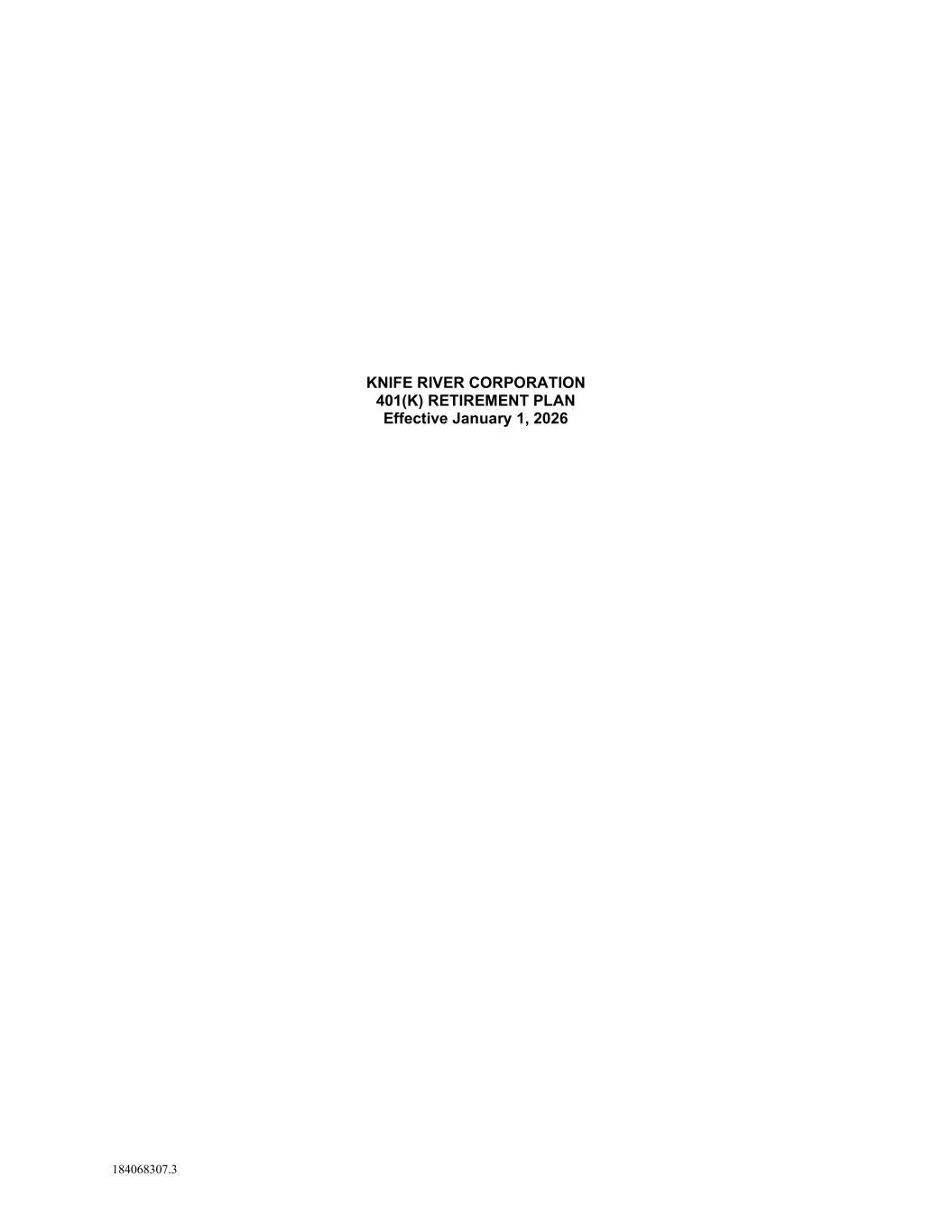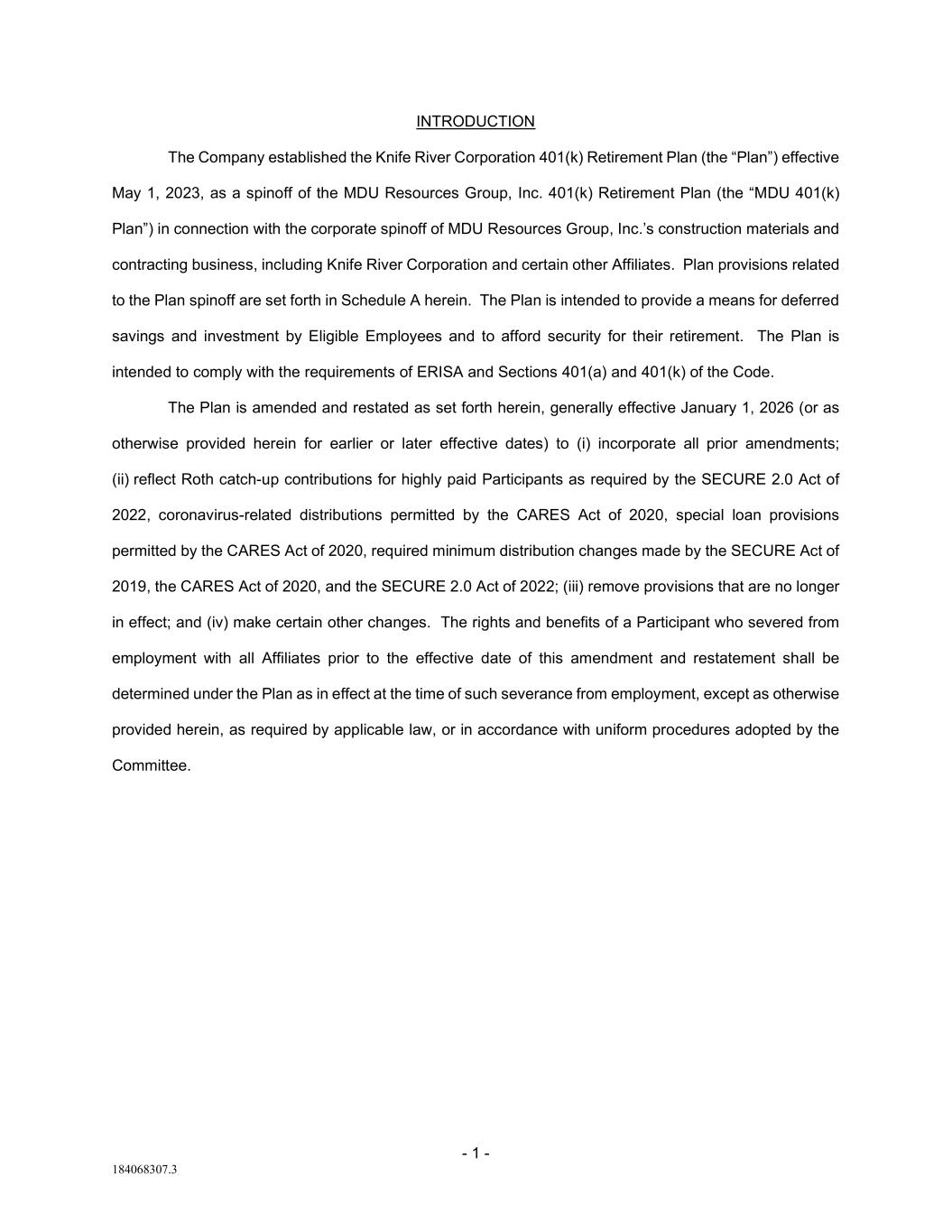 - 1 - 184068307.3 INTRODUCTION The Company established the Knife River Corporation 401(k) Retirement Plan (the “Plan”) effective May 1, 2023, as a spinoff of the MDU Resources Group, Inc. 401(k) Retirement Plan (the “MDU 401(k) Plan”) in connection with the corporate spinoff of MDU Resources Group, Inc.’s construction materials and contracting business, including Knife River Corporation and certain other Affiliates. Plan provisions related to the Plan spinoff are set forth in Schedule A herein. The Plan is intended to provide a means for deferred savings and investment by Eligible Employees and to afford security for their retirement. The Plan is intended to comply with the requirements of ERISA and Sections 401(a) and 401(k) of the Code. The Plan is amended and restated as set forth herein, generally effective January 1, 2026 (or as otherwise provided herein for earlier or later effective dates) to (i) incorporate all prior amendments; (ii) reflect Roth catch-up contributions for highly paid Participants as required by the SECURE 2.0 Act of 2022, coronavirus-related distributions permitted by the CARES Act of 2020, special loan provisions permitted by the CARES Act of 2020, required minimum distribution changes made by the SECURE Act of 2019, the CARES Act of 2020, and the SECURE 2.0 Act of 2022; (iii) remove provisions that are no longer in effect; and (iv) make certain other changes. The rights and benefits of a Participant who severed from employment with all Affiliates prior to the effective date of this amendment and restatement shall be determined under the Plan as in effect at the time of such severance from employment, except as otherwise provided herein, as required by applicable law, or in accordance with uniform procedures adopted by the Committee.
