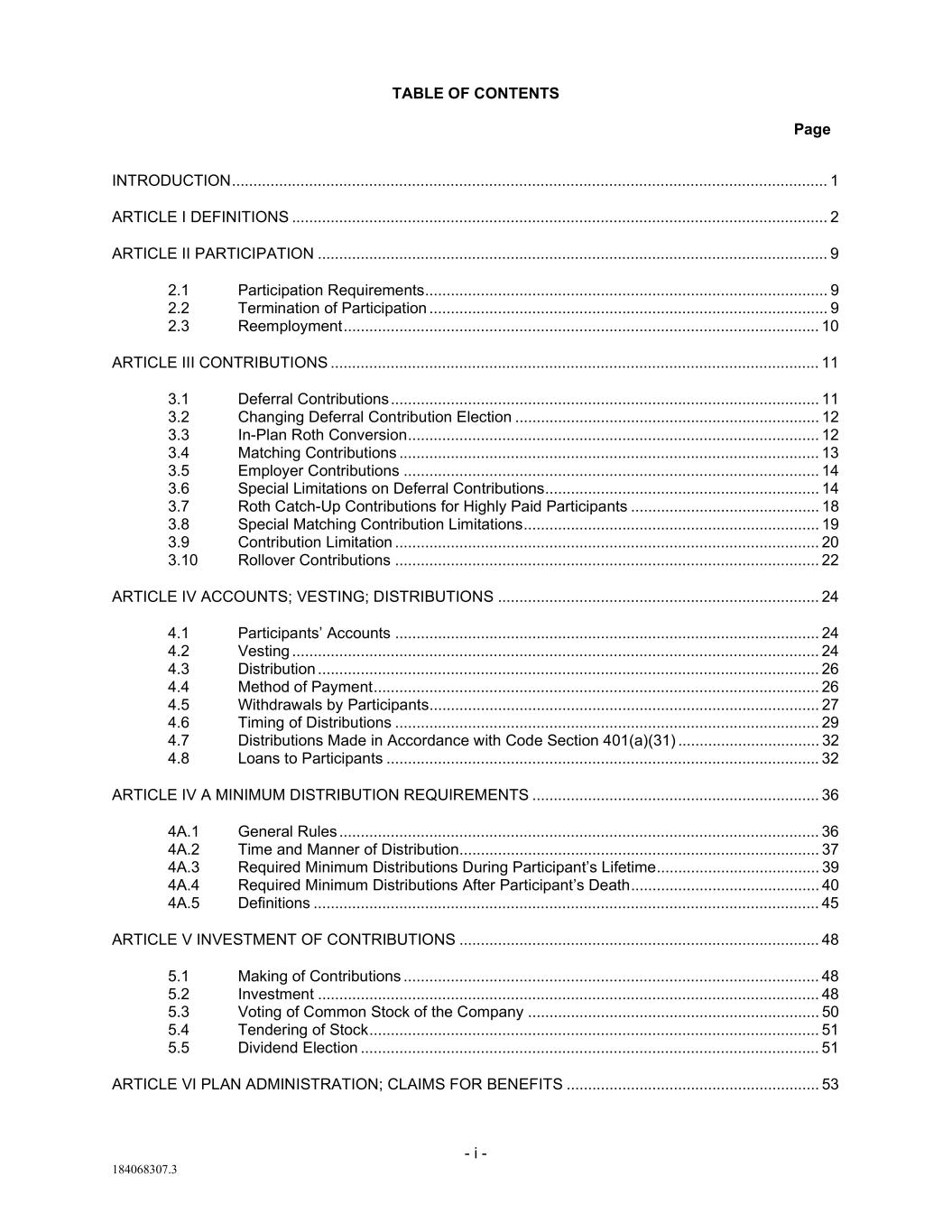 TABLE OF CONTENTS Page - i - 184068307.3 INTRODUCTION ........................................................................................................................................... 1 ARTICLE I DEFINITIONS ............................................................................................................................. 2 ARTICLE II PARTICIPATION ....................................................................................................................... 9 2.1 Participation Requirements .............................................................................................. 9 2.2 Termination of Participation ............................................................................................. 9 2.3 Reemployment ............................................................................................................... 10 ARTICLE III CONTRIBUTIONS .................................................................................................................. 11 3.1 Deferral Contributions .................................................................................................... 11 3.2 Changing Deferral Contribution Election ....................................................................... 12 3.3 In-Plan Roth Conversion ................................................................................................ 12 3.4 Matching Contributions .................................................................................................. 13 3.5 Employer Contributions ................................................................................................. 14 3.6 Special Limitations on Deferral Contributions ................................................................ 14 3.7 Roth Catch-Up Contributions for Highly Paid Participants ............................................ 18 3.8 Special Matching Contribution Limitations ..................................................................... 19 3.9 Contribution Limitation ................................................................................................... 20 3.10 Rollover Contributions ................................................................................................... 22 ARTICLE IV ACCOUNTS; VESTING; DISTRIBUTIONS ........................................................................... 24 4.1 Participants’ Accounts ................................................................................................... 24 4.2 Vesting ........................................................................................................................... 24 4.3 Distribution ..................................................................................................................... 26 4.4 Method of Payment ........................................................................................................ 26 4.5 Withdrawals by Participants ........................................................................................... 27 4.6 Timing of Distributions ................................................................................................... 29 4.7 Distributions Made in Accordance with Code Section 401(a)(31) ................................. 32 4.8 Loans to Participants ..................................................................................................... 32 ARTICLE IV A MINIMUM DISTRIBUTION REQUIREMENTS ................................................................... 36 4A.1 General Rules ................................................................................................................ 36 4A.2 Time and Manner of Distribution.................................................................................... 37 4A.3 Required Minimum Distributions During Participant’s Lifetime ...................................... 39 4A.4 Required Minimum Distributions After Participant’s Death ............................................ 40 4A.5 Definitions ...................................................................................................................... 45 ARTICLE V INVESTMENT OF CONTRIBUTIONS .................................................................................... 48 5.1 Making of Contributions ................................................................................................. 48 5.2 Investment ..................................................................................................................... 48 5.3 Voting of Common Stock of the Company .................................................................... 50 5.4 Tendering of Stock ......................................................................................................... 51 5.5 Dividend Election ........................................................................................................... 51 ARTICLE VI PLAN ADMINISTRATION; CLAIMS FOR BENEFITS ........................................................... 53