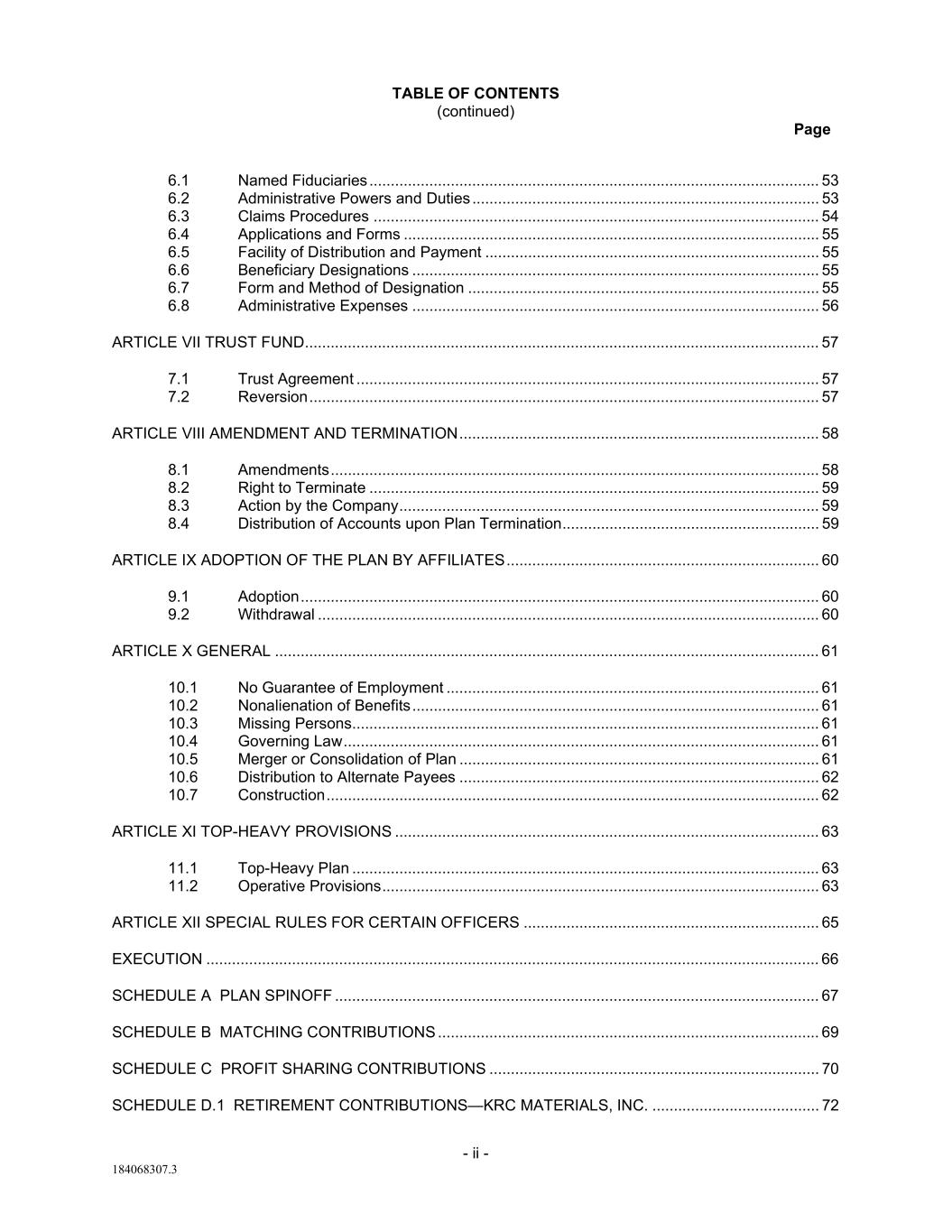 TABLE OF CONTENTS (continued) Page - ii - 184068307.3 6.1 Named Fiduciaries ......................................................................................................... 53 6.2 Administrative Powers and Duties ................................................................................. 53 6.3 Claims Procedures ........................................................................................................ 54 6.4 Applications and Forms ................................................................................................. 55 6.5 Facility of Distribution and Payment .............................................................................. 55 6.6 Beneficiary Designations ............................................................................................... 55 6.7 Form and Method of Designation .................................................................................. 55 6.8 Administrative Expenses ............................................................................................... 56 ARTICLE VII TRUST FUND ........................................................................................................................ 57 7.1 Trust Agreement ............................................................................................................ 57 7.2 Reversion ....................................................................................................................... 57 ARTICLE VIII AMENDMENT AND TERMINATION .................................................................................... 58 8.1 Amendments .................................................................................................................. 58 8.2 Right to Terminate ......................................................................................................... 59 8.3 Action by the Company .................................................................................................. 59 8.4 Distribution of Accounts upon Plan Termination ............................................................ 59 ARTICLE IX ADOPTION OF THE PLAN BY AFFILIATES ......................................................................... 60 9.1 Adoption ......................................................................................................................... 60 9.2 Withdrawal ..................................................................................................................... 60 ARTICLE X GENERAL ............................................................................................................................... 61 10.1 No Guarantee of Employment ....................................................................................... 61 10.2 Nonalienation of Benefits ............................................................................................... 61 10.3 Missing Persons............................................................................................................. 61 10.4 Governing Law ............................................................................................................... 61 10.5 Merger or Consolidation of Plan .................................................................................... 61 10.6 Distribution to Alternate Payees .................................................................................... 62 10.7 Construction ................................................................................................................... 62 ARTICLE XI TOP-HEAVY PROVISIONS ................................................................................................... 63 11.1 Top-Heavy Plan ............................................................................................................. 63 11.2 Operative Provisions ...................................................................................................... 63 ARTICLE XII SPECIAL RULES FOR CERTAIN OFFICERS ..................................................................... 65 EXECUTION ............................................................................................................................................... 66 SCHEDULE A PLAN SPINOFF ................................................................................................................. 67 SCHEDULE B MATCHING CONTRIBUTIONS ......................................................................................... 69 SCHEDULE C PROFIT SHARING CONTRIBUTIONS ............................................................................. 70 SCHEDULE D.1 RETIREMENT CONTRIBUTIONS—KRC MATERIALS, INC. ....................................... 72