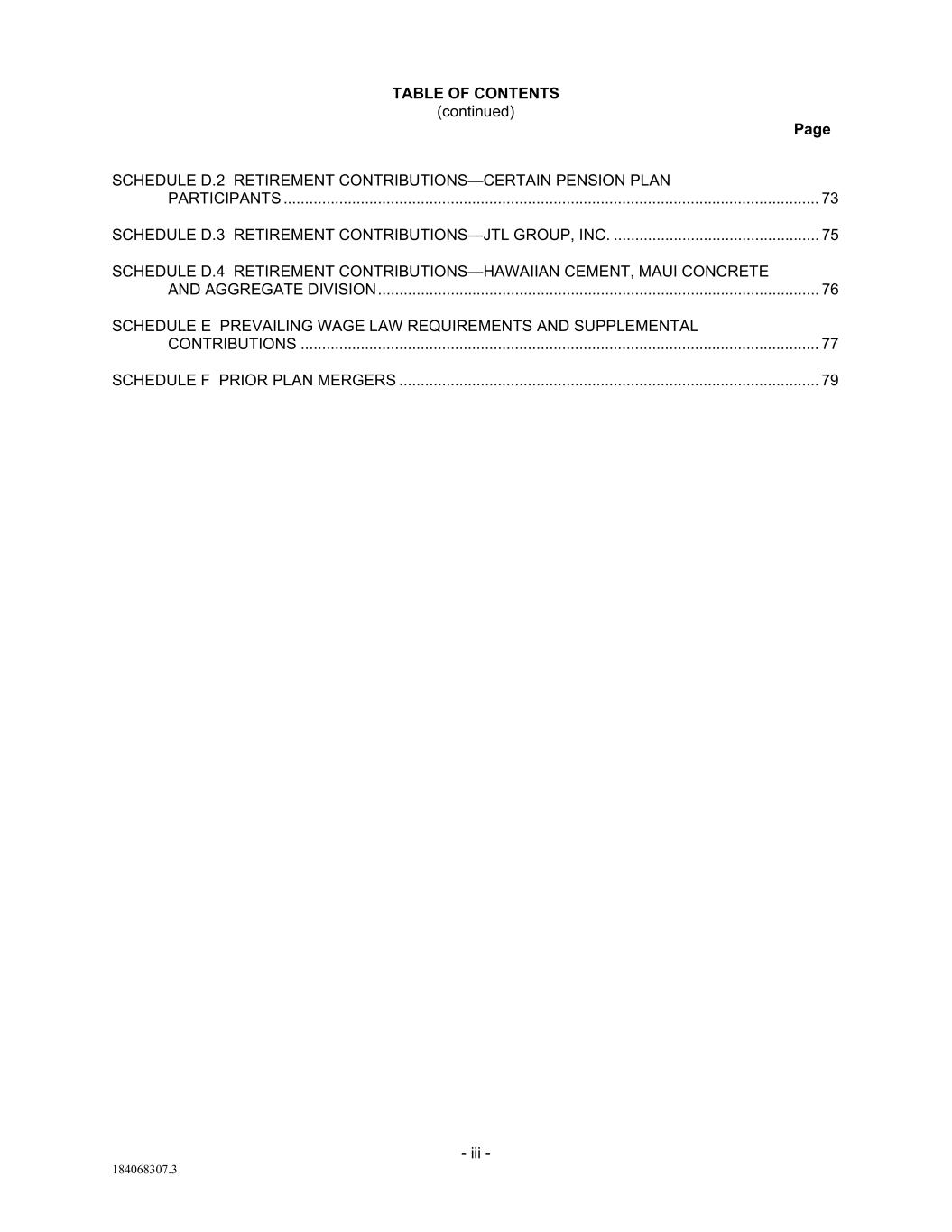 TABLE OF CONTENTS (continued) Page - iii - 184068307.3 SCHEDULE D.2 RETIREMENT CONTRIBUTIONS—CERTAIN PENSION PLAN PARTICIPANTS ............................................................................................................................. 73 SCHEDULE D.3 RETIREMENT CONTRIBUTIONS—JTL GROUP, INC. ................................................ 75 SCHEDULE D.4 RETIREMENT CONTRIBUTIONS—HAWAIIAN CEMENT, MAUI CONCRETE AND AGGREGATE DIVISION ....................................................................................................... 76 SCHEDULE E PREVAILING WAGE LAW REQUIREMENTS AND SUPPLEMENTAL CONTRIBUTIONS ......................................................................................................................... 77 SCHEDULE F PRIOR PLAN MERGERS .................................................................................................. 79