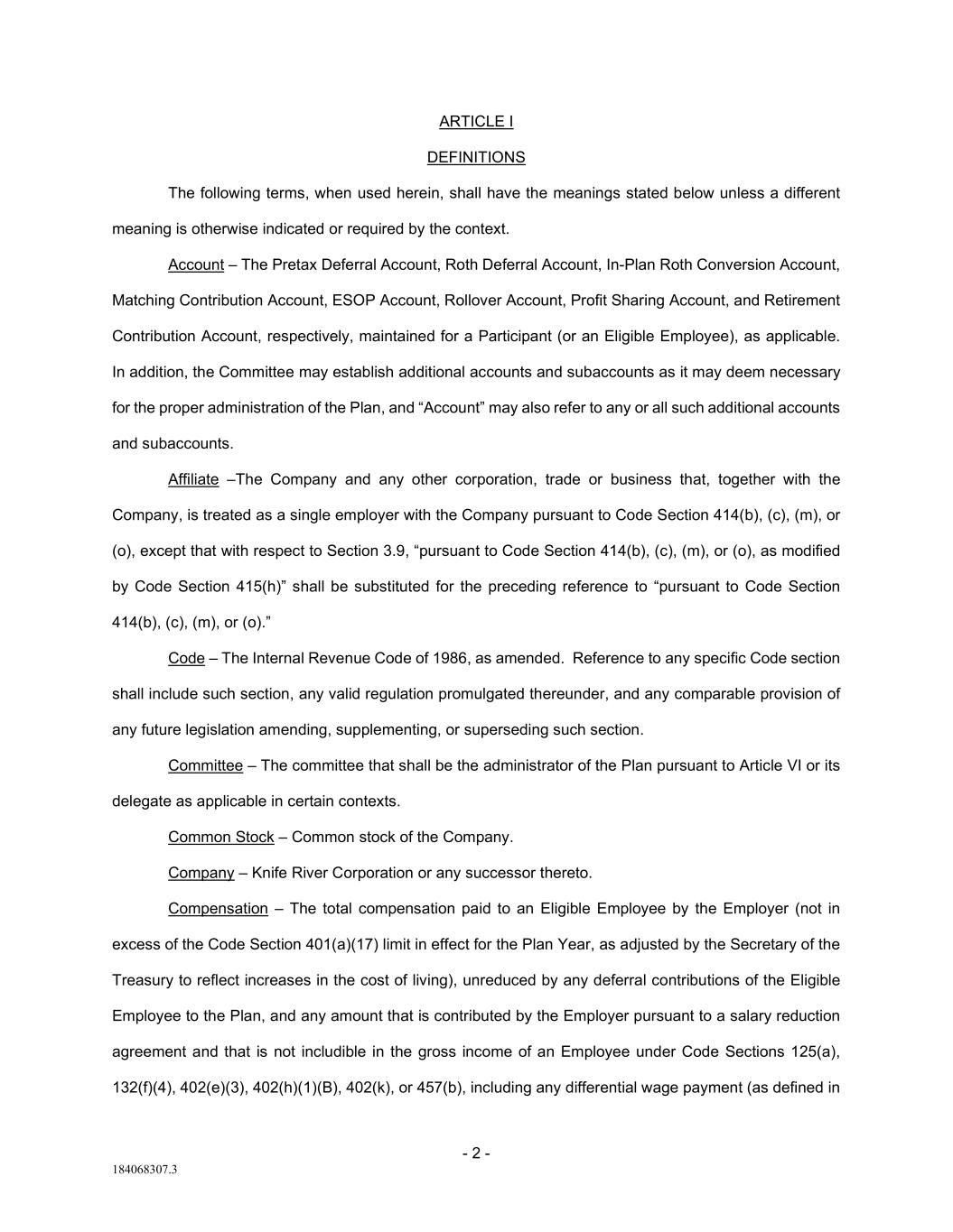 - 2 - 184068307.3 ARTICLE I DEFINITIONS The following terms, when used herein, shall have the meanings stated below unless a different meaning is otherwise indicated or required by the context. Account – The Pretax Deferral Account, Roth Deferral Account, In-Plan Roth Conversion Account, Matching Contribution Account, ESOP Account, Rollover Account, Profit Sharing Account, and Retirement Contribution Account, respectively, maintained for a Participant (or an Eligible Employee), as applicable. In addition, the Committee may establish additional accounts and subaccounts as it may deem necessary for the proper administration of the Plan, and “Account” may also refer to any or all such additional accounts and subaccounts. Affiliate –The Company and any other corporation, trade or business that, together with the Company, is treated as a single employer with the Company pursuant to Code Section 414(b), (c), (m), or (o), except that with respect to Section 3.9, “pursuant to Code Section 414(b), (c), (m), or (o), as modified by Code Section 415(h)” shall be substituted for the preceding reference to “pursuant to Code Section 414(b), (c), (m), or (o).” Code – The Internal Revenue Code of 1986, as amended. Reference to any specific Code section shall include such section, any valid regulation promulgated thereunder, and any comparable provision of any future legislation amending, supplementing, or superseding such section. Committee – The committee that shall be the administrator of the Plan pursuant to Article VI or its delegate as applicable in certain contexts. Common Stock – Common stock of the Company. Company – Knife River Corporation or any successor thereto. Compensation – The total compensation paid to an Eligible Employee by the Employer (not in excess of the Code Section 401(a)(17) limit in effect for the Plan Year, as adjusted by the Secretary of the Treasury to reflect increases in the cost of living), unreduced by any deferral contributions of the Eligible Employee to the Plan, and any amount that is contributed by the Employer pursuant to a salary reduction agreement and that is not includible in the gross income of an Employee under Code Sections 125(a), 132(f)(4), 402(e)(3), 402(h)(1)(B), 402(k), or 457(b), including any differential wage payment (as defined in
