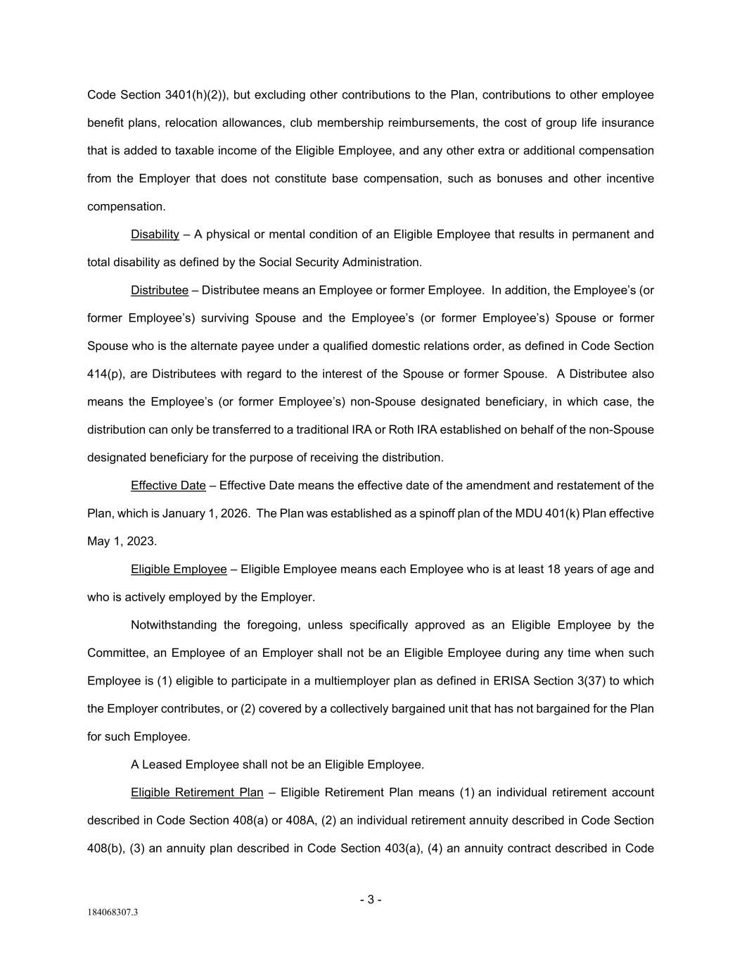- 3 - 184068307.3 Code Section 3401(h)(2)), but excluding other contributions to the Plan, contributions to other employee benefit plans, relocation allowances, club membership reimbursements, the cost of group life insurance that is added to taxable income of the Eligible Employee, and any other extra or additional compensation from the Employer that does not constitute base compensation, such as bonuses and other incentive compensation. Disability – A physical or mental condition of an Eligible Employee that results in permanent and total disability as defined by the Social Security Administration. Distributee – Distributee means an Employee or former Employee. In addition, the Employee’s (or former Employee’s) surviving Spouse and the Employee’s (or former Employee’s) Spouse or former Spouse who is the alternate payee under a qualified domestic relations order, as defined in Code Section 414(p), are Distributees with regard to the interest of the Spouse or former Spouse. A Distributee also means the Employee’s (or former Employee’s) non-Spouse designated beneficiary, in which case, the distribution can only be transferred to a traditional IRA or Roth IRA established on behalf of the non-Spouse designated beneficiary for the purpose of receiving the distribution. Effective Date – Effective Date means the effective date of the amendment and restatement of the Plan, which is January 1, 2026. The Plan was established as a spinoff plan of the MDU 401(k) Plan effective May 1, 2023. Eligible Employee – Eligible Employee means each Employee who is at least 18 years of age and who is actively employed by the Employer. Notwithstanding the foregoing, unless specifically approved as an Eligible Employee by the Committee, an Employee of an Employer shall not be an Eligible Employee during any time when such Employee is (1) eligible to participate in a multiemployer plan as defined in ERISA Section 3(37) to which the Employer contributes, or (2) covered by a collectively bargained unit that has not bargained for the Plan for such Employee. A Leased Employee shall not be an Eligible Employee. Eligible Retirement Plan – Eligible Retirement Plan means (1) an individual retirement account described in Code Section 408(a) or 408A, (2) an individual retirement annuity described in Code Section 408(b), (3) an annuity plan described in Code Section 403(a), (4) an annuity contract described in Code