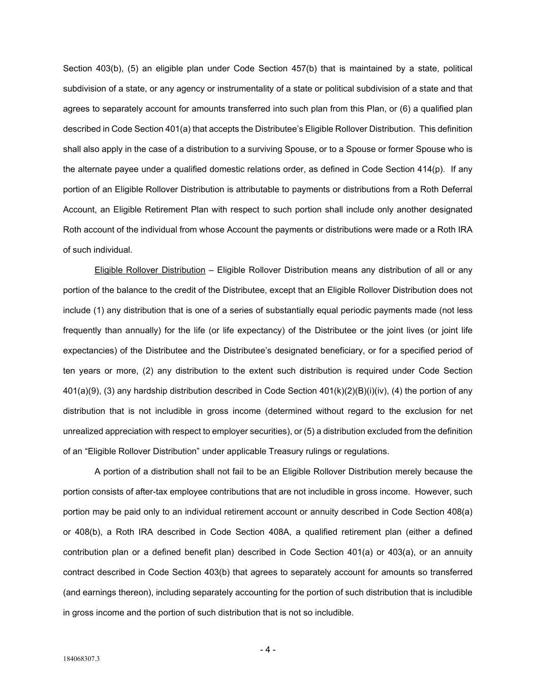- 4 - 184068307.3 Section 403(b), (5) an eligible plan under Code Section 457(b) that is maintained by a state, political subdivision of a state, or any agency or instrumentality of a state or political subdivision of a state and that agrees to separately account for amounts transferred into such plan from this Plan, or (6) a qualified plan described in Code Section 401(a) that accepts the Distributee’s Eligible Rollover Distribution. This definition shall also apply in the case of a distribution to a surviving Spouse, or to a Spouse or former Spouse who is the alternate payee under a qualified domestic relations order, as defined in Code Section 414(p). If any portion of an Eligible Rollover Distribution is attributable to payments or distributions from a Roth Deferral Account, an Eligible Retirement Plan with respect to such portion shall include only another designated Roth account of the individual from whose Account the payments or distributions were made or a Roth IRA of such individual. Eligible Rollover Distribution – Eligible Rollover Distribution means any distribution of all or any portion of the balance to the credit of the Distributee, except that an Eligible Rollover Distribution does not include (1) any distribution that is one of a series of substantially equal periodic payments made (not less frequently than annually) for the life (or life expectancy) of the Distributee or the joint lives (or joint life expectancies) of the Distributee and the Distributee’s designated beneficiary, or for a specified period of ten years or more, (2) any distribution to the extent such distribution is required under Code Section 401(a)(9), (3) any hardship distribution described in Code Section 401(k)(2)(B)(i)(iv), (4) the portion of any distribution that is not includible in gross income (determined without regard to the exclusion for net unrealized appreciation with respect to employer securities), or (5) a distribution excluded from the definition of an “Eligible Rollover Distribution” under applicable Treasury rulings or regulations. A portion of a distribution shall not fail to be an Eligible Rollover Distribution merely because the portion consists of after-tax employee contributions that are not includible in gross income. However, such portion may be paid only to an individual retirement account or annuity described in Code Section 408(a) or 408(b), a Roth IRA described in Code Section 408A, a qualified retirement plan (either a defined contribution plan or a defined benefit plan) described in Code Section 401(a) or 403(a), or an annuity contract described in Code Section 403(b) that agrees to separately account for amounts so transferred (and earnings thereon), including separately accounting for the portion of such distribution that is includible in gross income and the portion of such distribution that is not so includible.