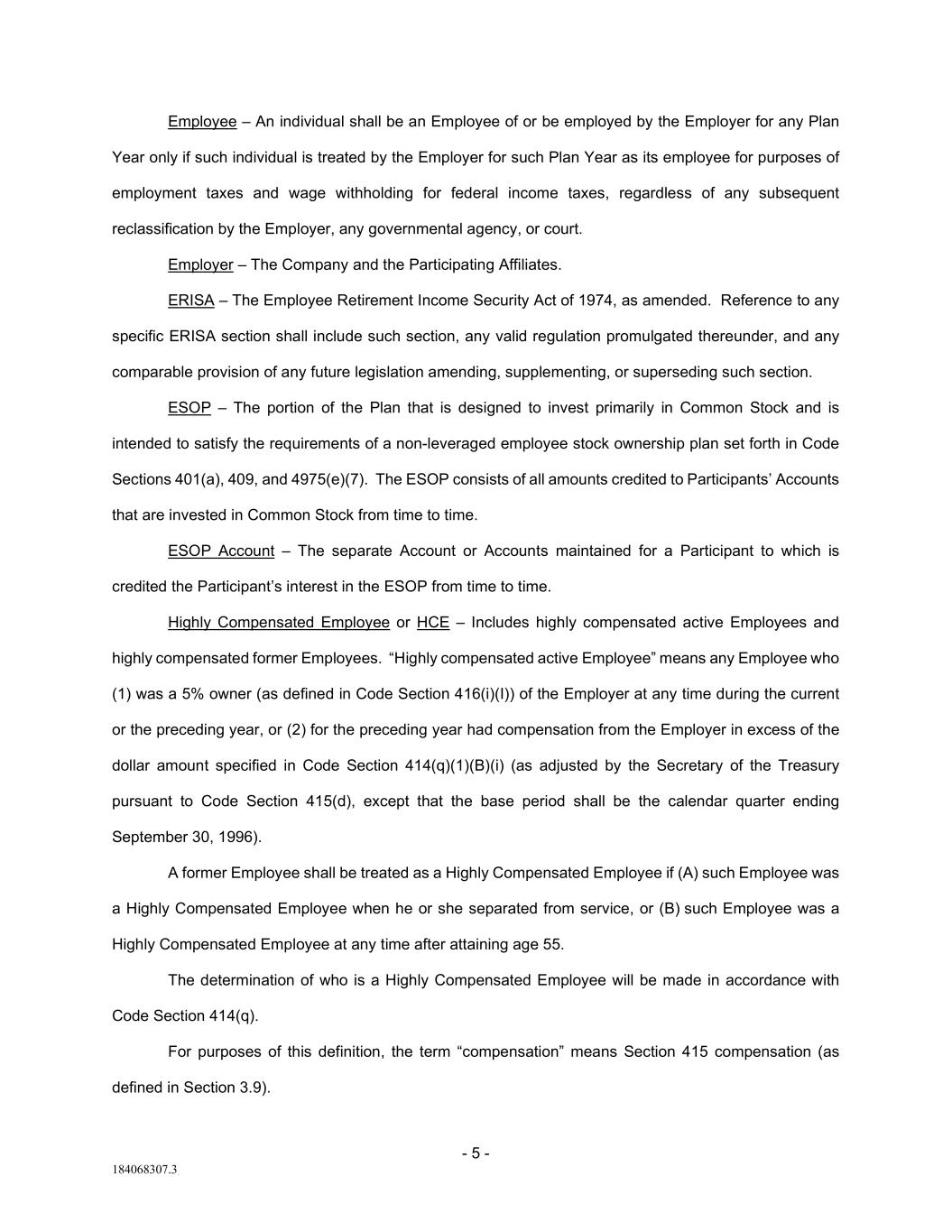 - 5 - 184068307.3 Employee – An individual shall be an Employee of or be employed by the Employer for any Plan Year only if such individual is treated by the Employer for such Plan Year as its employee for purposes of employment taxes and wage withholding for federal income taxes, regardless of any subsequent reclassification by the Employer, any governmental agency, or court. Employer – The Company and the Participating Affiliates. ERISA – The Employee Retirement Income Security Act of 1974, as amended. Reference to any specific ERISA section shall include such section, any valid regulation promulgated thereunder, and any comparable provision of any future legislation amending, supplementing, or superseding such section. ESOP – The portion of the Plan that is designed to invest primarily in Common Stock and is intended to satisfy the requirements of a non-leveraged employee stock ownership plan set forth in Code Sections 401(a), 409, and 4975(e)(7). The ESOP consists of all amounts credited to Participants’ Accounts that are invested in Common Stock from time to time. ESOP Account – The separate Account or Accounts maintained for a Participant to which is credited the Participant’s interest in the ESOP from time to time. Highly Compensated Employee or HCE – Includes highly compensated active Employees and highly compensated former Employees. “Highly compensated active Employee” means any Employee who (1) was a 5% owner (as defined in Code Section 416(i)(I)) of the Employer at any time during the current or the preceding year, or (2) for the preceding year had compensation from the Employer in excess of the dollar amount specified in Code Section 414(q)(1)(B)(i) (as adjusted by the Secretary of the Treasury pursuant to Code Section 415(d), except that the base period shall be the calendar quarter ending September 30, 1996). A former Employee shall be treated as a Highly Compensated Employee if (A) such Employee was a Highly Compensated Employee when he or she separated from service, or (B) such Employee was a Highly Compensated Employee at any time after attaining age 55. The determination of who is a Highly Compensated Employee will be made in accordance with Code Section 414(q). For purposes of this definition, the term “compensation” means Section 415 compensation (as defined in Section 3.9).