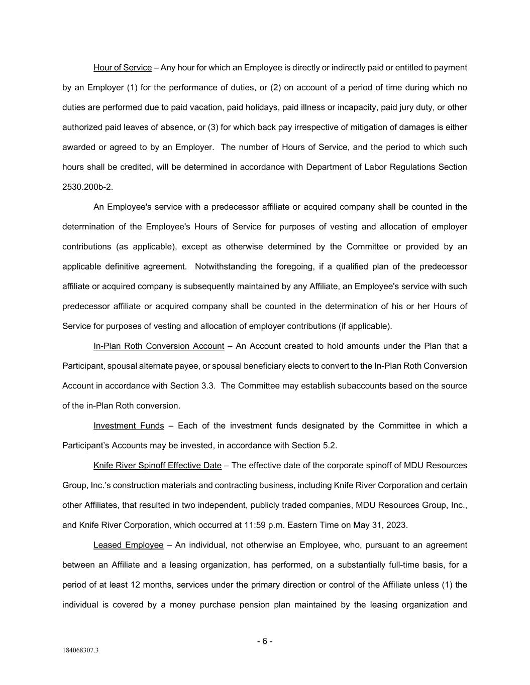 - 6 - 184068307.3 Hour of Service – Any hour for which an Employee is directly or indirectly paid or entitled to payment by an Employer (1) for the performance of duties, or (2) on account of a period of time during which no duties are performed due to paid vacation, paid holidays, paid illness or incapacity, paid jury duty, or other authorized paid leaves of absence, or (3) for which back pay irrespective of mitigation of damages is either awarded or agreed to by an Employer. The number of Hours of Service, and the period to which such hours shall be credited, will be determined in accordance with Department of Labor Regulations Section 2530.200b-2. An Employee's service with a predecessor affiliate or acquired company shall be counted in the determination of the Employee's Hours of Service for purposes of vesting and allocation of employer contributions (as applicable), except as otherwise determined by the Committee or provided by an applicable definitive agreement. Notwithstanding the foregoing, if a qualified plan of the predecessor affiliate or acquired company is subsequently maintained by any Affiliate, an Employee's service with such predecessor affiliate or acquired company shall be counted in the determination of his or her Hours of Service for purposes of vesting and allocation of employer contributions (if applicable). In-Plan Roth Conversion Account – An Account created to hold amounts under the Plan that a Participant, spousal alternate payee, or spousal beneficiary elects to convert to the In-Plan Roth Conversion Account in accordance with Section 3.3. The Committee may establish subaccounts based on the source of the in-Plan Roth conversion. Investment Funds – Each of the investment funds designated by the Committee in which a Participant’s Accounts may be invested, in accordance with Section 5.2. Knife River Spinoff Effective Date – The effective date of the corporate spinoff of MDU Resources Group, Inc.’s construction materials and contracting business, including Knife River Corporation and certain other Affiliates, that resulted in two independent, publicly traded companies, MDU Resources Group, Inc., and Knife River Corporation, which occurred at 11:59 p.m. Eastern Time on May 31, 2023. Leased Employee – An individual, not otherwise an Employee, who, pursuant to an agreement between an Affiliate and a leasing organization, has performed, on a substantially full-time basis, for a period of at least 12 months, services under the primary direction or control of the Affiliate unless (1) the individual is covered by a money purchase pension plan maintained by the leasing organization and