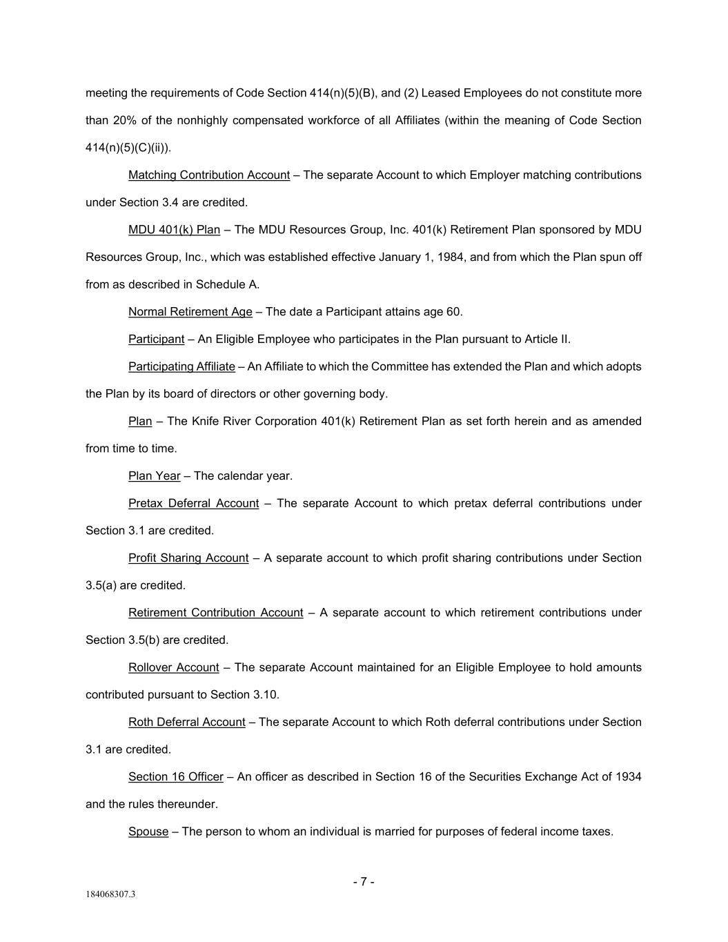 - 7 - 184068307.3 meeting the requirements of Code Section 414(n)(5)(B), and (2) Leased Employees do not constitute more than 20% of the nonhighly compensated workforce of all Affiliates (within the meaning of Code Section 414(n)(5)(C)(ii)). Matching Contribution Account – The separate Account to which Employer matching contributions under Section 3.4 are credited. MDU 401(k) Plan – The MDU Resources Group, Inc. 401(k) Retirement Plan sponsored by MDU Resources Group, Inc., which was established effective January 1, 1984, and from which the Plan spun off from as described in Schedule A. Normal Retirement Age – The date a Participant attains age 60. Participant – An Eligible Employee who participates in the Plan pursuant to Article II. Participating Affiliate – An Affiliate to which the Committee has extended the Plan and which adopts the Plan by its board of directors or other governing body. Plan – The Knife River Corporation 401(k) Retirement Plan as set forth herein and as amended from time to time. Plan Year – The calendar year. Pretax Deferral Account – The separate Account to which pretax deferral contributions under Section 3.1 are credited. Profit Sharing Account – A separate account to which profit sharing contributions under Section 3.5(a) are credited. Retirement Contribution Account – A separate account to which retirement contributions under Section 3.5(b) are credited. Rollover Account – The separate Account maintained for an Eligible Employee to hold amounts contributed pursuant to Section 3.10. Roth Deferral Account – The separate Account to which Roth deferral contributions under Section 3.1 are credited. Section 16 Officer – An officer as described in Section 16 of the Securities Exchange Act of 1934 and the rules thereunder. Spouse – The person to whom an individual is married for purposes of federal income taxes.