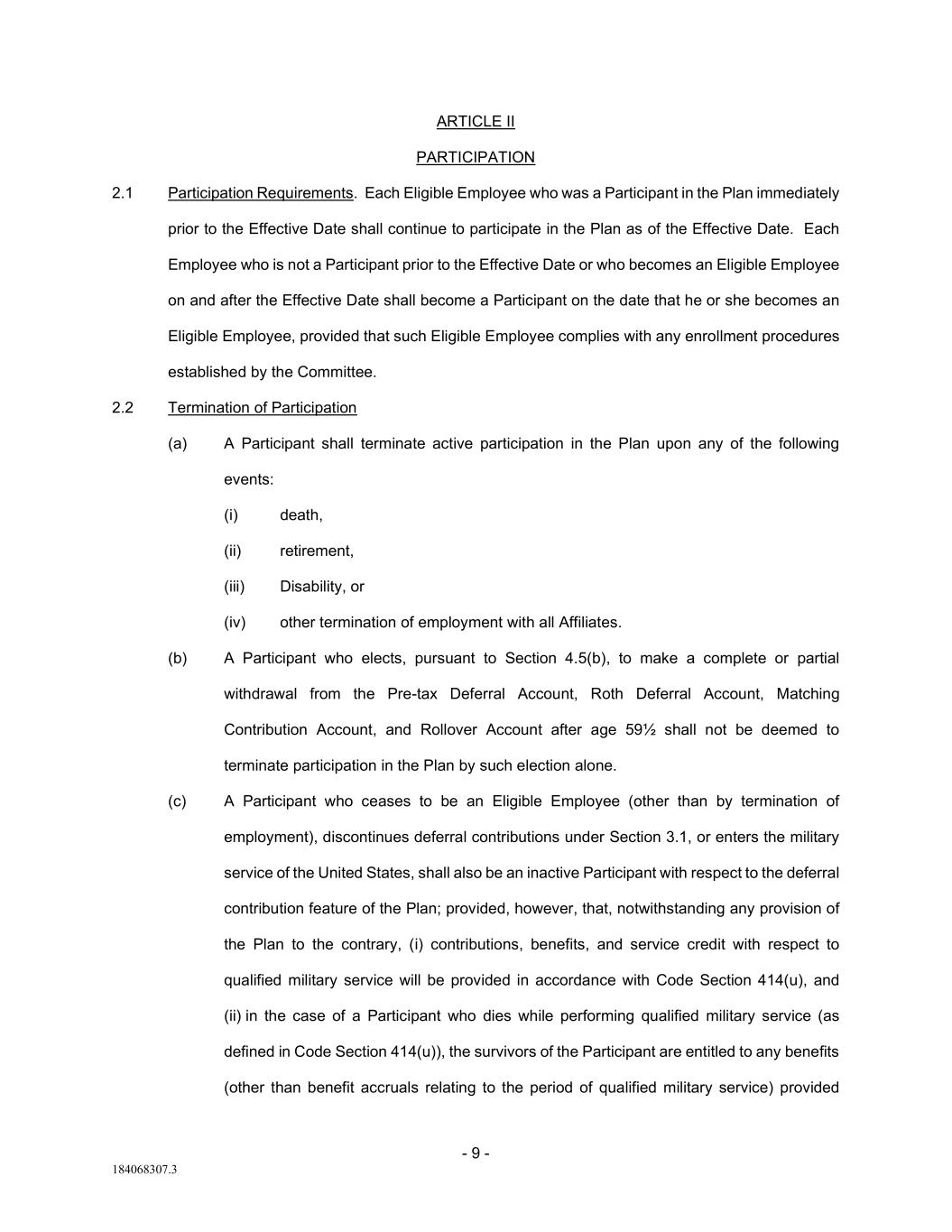 - 9 - 184068307.3 ARTICLE II PARTICIPATION 2.1 Participation Requirements. Each Eligible Employee who was a Participant in the Plan immediately prior to the Effective Date shall continue to participate in the Plan as of the Effective Date. Each Employee who is not a Participant prior to the Effective Date or who becomes an Eligible Employee on and after the Effective Date shall become a Participant on the date that he or she becomes an Eligible Employee, provided that such Eligible Employee complies with any enrollment procedures established by the Committee. 2.2 Termination of Participation (a) A Participant shall terminate active participation in the Plan upon any of the following events: (i) death, (ii) retirement, (iii) Disability, or (iv) other termination of employment with all Affiliates. (b) A Participant who elects, pursuant to Section 4.5(b), to make a complete or partial withdrawal from the Pre-tax Deferral Account, Roth Deferral Account, Matching Contribution Account, and Rollover Account after age 59½ shall not be deemed to terminate participation in the Plan by such election alone. (c) A Participant who ceases to be an Eligible Employee (other than by termination of employment), discontinues deferral contributions under Section 3.1, or enters the military service of the United States, shall also be an inactive Participant with respect to the deferral contribution feature of the Plan; provided, however, that, notwithstanding any provision of the Plan to the contrary, (i) contributions, benefits, and service credit with respect to qualified military service will be provided in accordance with Code Section 414(u), and (ii) in the case of a Participant who dies while performing qualified military service (as defined in Code Section 414(u)), the survivors of the Participant are entitled to any benefits (other than benefit accruals relating to the period of qualified military service) provided