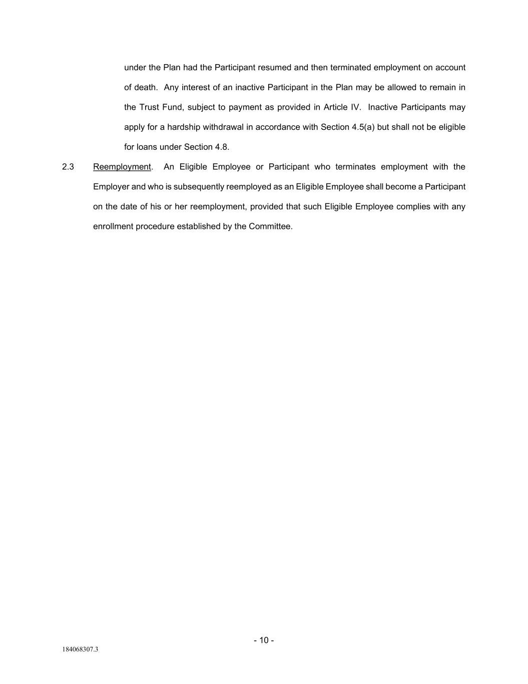 - 10 - 184068307.3 under the Plan had the Participant resumed and then terminated employment on account of death. Any interest of an inactive Participant in the Plan may be allowed to remain in the Trust Fund, subject to payment as provided in Article IV. Inactive Participants may apply for a hardship withdrawal in accordance with Section 4.5(a) but shall not be eligible for loans under Section 4.8. 2.3 Reemployment. An Eligible Employee or Participant who terminates employment with the Employer and who is subsequently reemployed as an Eligible Employee shall become a Participant on the date of his or her reemployment, provided that such Eligible Employee complies with any enrollment procedure established by the Committee.
