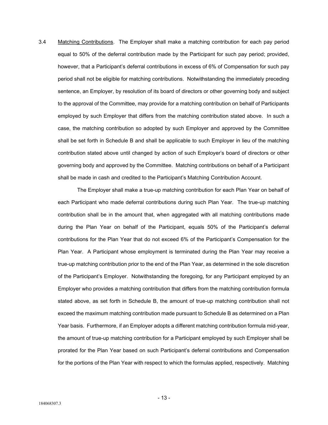 - 13 - 184068307.3 3.4 Matching Contributions. The Employer shall make a matching contribution for each pay period equal to 50% of the deferral contribution made by the Participant for such pay period; provided, however, that a Participant’s deferral contributions in excess of 6% of Compensation for such pay period shall not be eligible for matching contributions. Notwithstanding the immediately preceding sentence, an Employer, by resolution of its board of directors or other governing body and subject to the approval of the Committee, may provide for a matching contribution on behalf of Participants employed by such Employer that differs from the matching contribution stated above. In such a case, the matching contribution so adopted by such Employer and approved by the Committee shall be set forth in Schedule B and shall be applicable to such Employer in lieu of the matching contribution stated above until changed by action of such Employer’s board of directors or other governing body and approved by the Committee. Matching contributions on behalf of a Participant shall be made in cash and credited to the Participant’s Matching Contribution Account. The Employer shall make a true-up matching contribution for each Plan Year on behalf of each Participant who made deferral contributions during such Plan Year. The true-up matching contribution shall be in the amount that, when aggregated with all matching contributions made during the Plan Year on behalf of the Participant, equals 50% of the Participant’s deferral contributions for the Plan Year that do not exceed 6% of the Participant’s Compensation for the Plan Year. A Participant whose employment is terminated during the Plan Year may receive a true-up matching contribution prior to the end of the Plan Year, as determined in the sole discretion of the Participant’s Employer. Notwithstanding the foregoing, for any Participant employed by an Employer who provides a matching contribution that differs from the matching contribution formula stated above, as set forth in Schedule B, the amount of true-up matching contribution shall not exceed the maximum matching contribution made pursuant to Schedule B as determined on a Plan Year basis. Furthermore, if an Employer adopts a different matching contribution formula mid-year, the amount of true-up matching contribution for a Participant employed by such Employer shall be prorated for the Plan Year based on such Participant’s deferral contributions and Compensation for the portions of the Plan Year with respect to which the formulas applied, respectively. Matching
