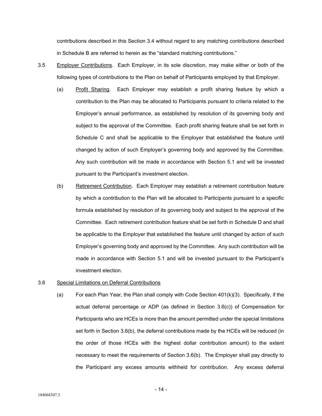 - 14 - 184068307.3 contributions described in this Section 3.4 without regard to any matching contributions described in Schedule B are referred to herein as the “standard matching contributions.” 3.5 Employer Contributions. Each Employer, in its sole discretion, may make either or both of the following types of contributions to the Plan on behalf of Participants employed by that Employer. (a) Profit Sharing. Each Employer may establish a profit sharing feature by which a contribution to the Plan may be allocated to Participants pursuant to criteria related to the Employer’s annual performance, as established by resolution of its governing body and subject to the approval of the Committee. Each profit sharing feature shall be set forth in Schedule C and shall be applicable to the Employer that established the feature until changed by action of such Employer’s governing body and approved by the Committee. Any such contribution will be made in accordance with Section 5.1 and will be invested pursuant to the Participant’s investment election. (b) Retirement Contribution. Each Employer may establish a retirement contribution feature by which a contribution to the Plan will be allocated to Participants pursuant to a specific formula established by resolution of its governing body and subject to the approval of the Committee. Each retirement contribution feature shall be set forth in Schedule D and shall be applicable to the Employer that established the feature until changed by action of such Employer’s governing body and approved by the Committee. Any such contribution will be made in accordance with Section 5.1 and will be invested pursuant to the Participant’s investment election. 3.6 Special Limitations on Deferral Contributions (a) For each Plan Year, the Plan shall comply with Code Section 401(k)(3). Specifically, if the actual deferral percentage or ADP (as defined in Section 3.6(c)) of Compensation for Participants who are HCEs is more than the amount permitted under the special limitations set forth in Section 3.6(b), the deferral contributions made by the HCEs will be reduced (in the order of those HCEs with the highest dollar contribution amount) to the extent necessary to meet the requirements of Section 3.6(b). The Employer shall pay directly to the Participant any excess amounts withheld for contribution. Any excess deferral