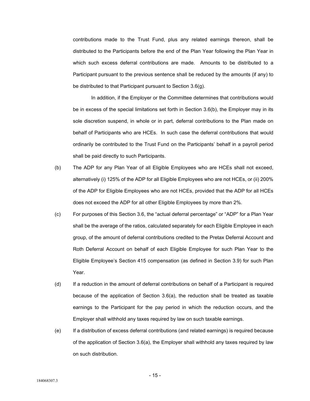 - 15 - 184068307.3 contributions made to the Trust Fund, plus any related earnings thereon, shall be distributed to the Participants before the end of the Plan Year following the Plan Year in which such excess deferral contributions are made. Amounts to be distributed to a Participant pursuant to the previous sentence shall be reduced by the amounts (if any) to be distributed to that Participant pursuant to Section 3.6(g). In addition, if the Employer or the Committee determines that contributions would be in excess of the special limitations set forth in Section 3.6(b), the Employer may in its sole discretion suspend, in whole or in part, deferral contributions to the Plan made on behalf of Participants who are HCEs. In such case the deferral contributions that would ordinarily be contributed to the Trust Fund on the Participants’ behalf in a payroll period shall be paid directly to such Participants. (b) The ADP for any Plan Year of all Eligible Employees who are HCEs shall not exceed, alternatively (i) 125% of the ADP for all Eligible Employees who are not HCEs, or (ii) 200% of the ADP for Eligible Employees who are not HCEs, provided that the ADP for all HCEs does not exceed the ADP for all other Eligible Employees by more than 2%. (c) For purposes of this Section 3.6, the “actual deferral percentage” or “ADP” for a Plan Year shall be the average of the ratios, calculated separately for each Eligible Employee in each group, of the amount of deferral contributions credited to the Pretax Deferral Account and Roth Deferral Account on behalf of each Eligible Employee for such Plan Year to the Eligible Employee’s Section 415 compensation (as defined in Section 3.9) for such Plan Year. (d) If a reduction in the amount of deferral contributions on behalf of a Participant is required because of the application of Section 3.6(a), the reduction shall be treated as taxable earnings to the Participant for the pay period in which the reduction occurs, and the Employer shall withhold any taxes required by law on such taxable earnings. (e) If a distribution of excess deferral contributions (and related earnings) is required because of the application of Section 3.6(a), the Employer shall withhold any taxes required by law on such distribution.