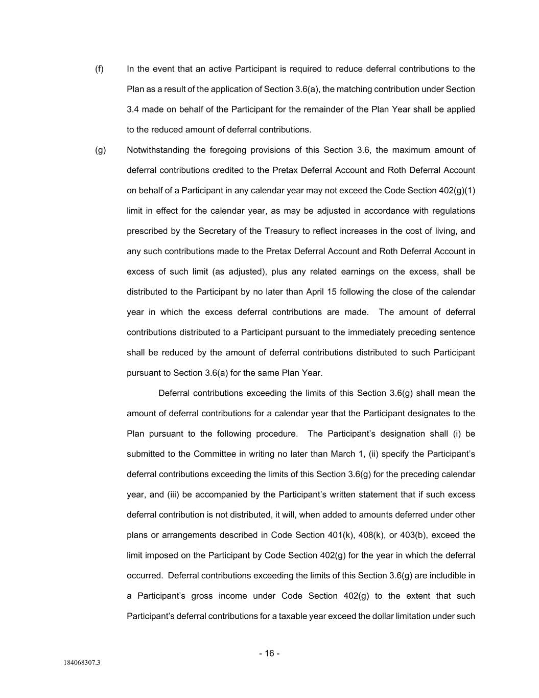 - 16 - 184068307.3 (f) In the event that an active Participant is required to reduce deferral contributions to the Plan as a result of the application of Section 3.6(a), the matching contribution under Section 3.4 made on behalf of the Participant for the remainder of the Plan Year shall be applied to the reduced amount of deferral contributions. (g) Notwithstanding the foregoing provisions of this Section 3.6, the maximum amount of deferral contributions credited to the Pretax Deferral Account and Roth Deferral Account on behalf of a Participant in any calendar year may not exceed the Code Section 402(g)(1) limit in effect for the calendar year, as may be adjusted in accordance with regulations prescribed by the Secretary of the Treasury to reflect increases in the cost of living, and any such contributions made to the Pretax Deferral Account and Roth Deferral Account in excess of such limit (as adjusted), plus any related earnings on the excess, shall be distributed to the Participant by no later than April 15 following the close of the calendar year in which the excess deferral contributions are made. The amount of deferral contributions distributed to a Participant pursuant to the immediately preceding sentence shall be reduced by the amount of deferral contributions distributed to such Participant pursuant to Section 3.6(a) for the same Plan Year. Deferral contributions exceeding the limits of this Section 3.6(g) shall mean the amount of deferral contributions for a calendar year that the Participant designates to the Plan pursuant to the following procedure. The Participant’s designation shall (i) be submitted to the Committee in writing no later than March 1, (ii) specify the Participant’s deferral contributions exceeding the limits of this Section 3.6(g) for the preceding calendar year, and (iii) be accompanied by the Participant’s written statement that if such excess deferral contribution is not distributed, it will, when added to amounts deferred under other plans or arrangements described in Code Section 401(k), 408(k), or 403(b), exceed the limit imposed on the Participant by Code Section 402(g) for the year in which the deferral occurred. Deferral contributions exceeding the limits of this Section 3.6(g) are includible in a Participant’s gross income under Code Section 402(g) to the extent that such Participant’s deferral contributions for a taxable year exceed the dollar limitation under such