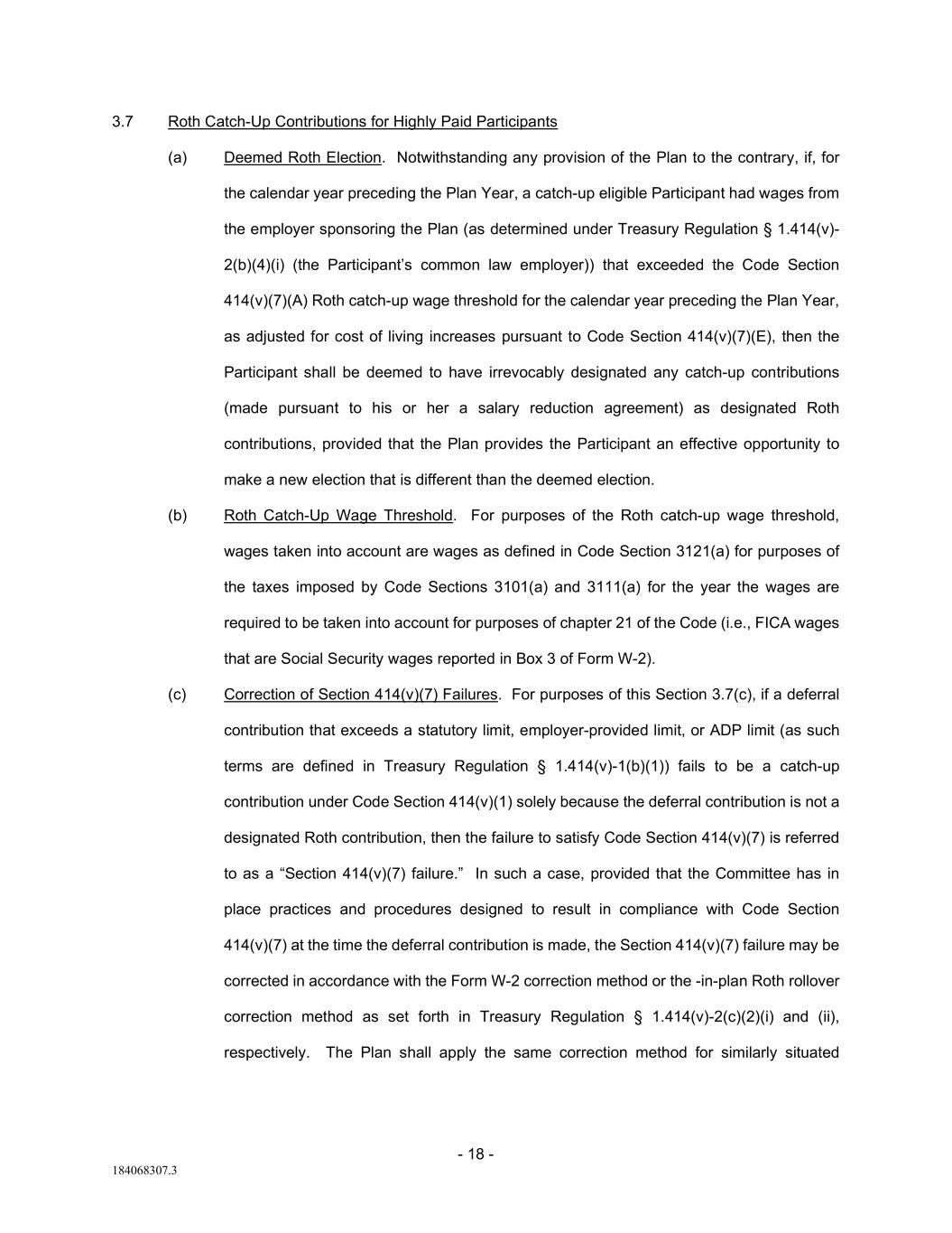 - 18 - 184068307.3 3.7 Roth Catch-Up Contributions for Highly Paid Participants (a) Deemed Roth Election. Notwithstanding any provision of the Plan to the contrary, if, for the calendar year preceding the Plan Year, a catch-up eligible Participant had wages from the employer sponsoring the Plan (as determined under Treasury Regulation § 1.414(v)- 2(b)(4)(i) (the Participant’s common law employer)) that exceeded the Code Section 414(v)(7)(A) Roth catch-up wage threshold for the calendar year preceding the Plan Year, as adjusted for cost of living increases pursuant to Code Section 414(v)(7)(E), then the Participant shall be deemed to have irrevocably designated any catch-up contributions (made pursuant to his or her a salary reduction agreement) as designated Roth contributions, provided that the Plan provides the Participant an effective opportunity to make a new election that is different than the deemed election. (b) Roth Catch-Up Wage Threshold. For purposes of the Roth catch-up wage threshold, wages taken into account are wages as defined in Code Section 3121(a) for purposes of the taxes imposed by Code Sections 3101(a) and 3111(a) for the year the wages are required to be taken into account for purposes of chapter 21 of the Code (i.e., FICA wages that are Social Security wages reported in Box 3 of Form W-2). (c) Correction of Section 414(v)(7) Failures. For purposes of this Section 3.7(c), if a deferral contribution that exceeds a statutory limit, employer-provided limit, or ADP limit (as such terms are defined in Treasury Regulation § 1.414(v)-1(b)(1)) fails to be a catch-up contribution under Code Section 414(v)(1) solely because the deferral contribution is not a designated Roth contribution, then the failure to satisfy Code Section 414(v)(7) is referred to as a “Section 414(v)(7) failure.” In such a case, provided that the Committee has in place practices and procedures designed to result in compliance with Code Section 414(v)(7) at the time the deferral contribution is made, the Section 414(v)(7) failure may be corrected in accordance with the Form W-2 correction method or the -in-plan Roth rollover correction method as set forth in Treasury Regulation § 1.414(v)-2(c)(2)(i) and (ii), respectively. The Plan shall apply the same correction method for similarly situated
