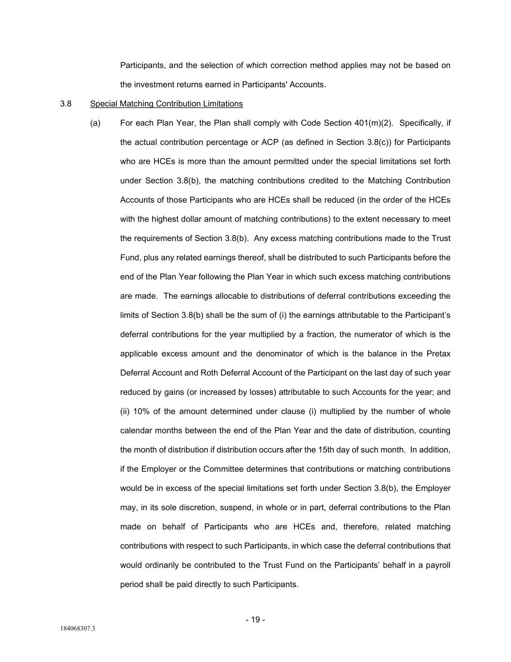 - 19 - 184068307.3 Participants, and the selection of which correction method applies may not be based on the investment returns earned in Participants' Accounts. 3.8 Special Matching Contribution Limitations (a) For each Plan Year, the Plan shall comply with Code Section 401(m)(2). Specifically, if the actual contribution percentage or ACP (as defined in Section 3.8(c)) for Participants who are HCEs is more than the amount permitted under the special limitations set forth under Section 3.8(b), the matching contributions credited to the Matching Contribution Accounts of those Participants who are HCEs shall be reduced (in the order of the HCEs with the highest dollar amount of matching contributions) to the extent necessary to meet the requirements of Section 3.8(b). Any excess matching contributions made to the Trust Fund, plus any related earnings thereof, shall be distributed to such Participants before the end of the Plan Year following the Plan Year in which such excess matching contributions are made. The earnings allocable to distributions of deferral contributions exceeding the limits of Section 3.8(b) shall be the sum of (i) the earnings attributable to the Participant’s deferral contributions for the year multiplied by a fraction, the numerator of which is the applicable excess amount and the denominator of which is the balance in the Pretax Deferral Account and Roth Deferral Account of the Participant on the last day of such year reduced by gains (or increased by losses) attributable to such Accounts for the year; and (ii) 10% of the amount determined under clause (i) multiplied by the number of whole calendar months between the end of the Plan Year and the date of distribution, counting the month of distribution if distribution occurs after the 15th day of such month. In addition, if the Employer or the Committee determines that contributions or matching contributions would be in excess of the special limitations set forth under Section 3.8(b), the Employer may, in its sole discretion, suspend, in whole or in part, deferral contributions to the Plan made on behalf of Participants who are HCEs and, therefore, related matching contributions with respect to such Participants, in which case the deferral contributions that would ordinarily be contributed to the Trust Fund on the Participants’ behalf in a payroll period shall be paid directly to such Participants.