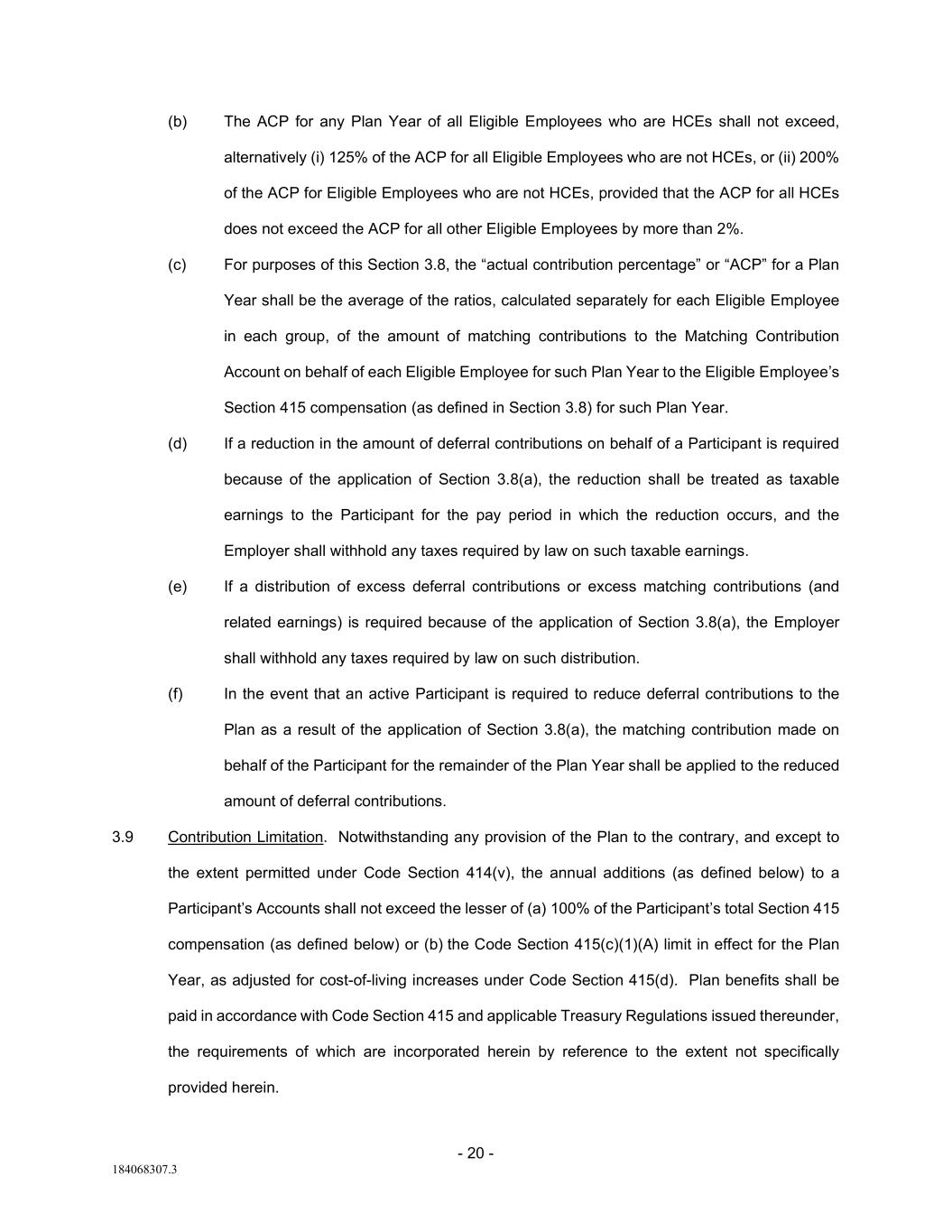 - 20 - 184068307.3 (b) The ACP for any Plan Year of all Eligible Employees who are HCEs shall not exceed, alternatively (i) 125% of the ACP for all Eligible Employees who are not HCEs, or (ii) 200% of the ACP for Eligible Employees who are not HCEs, provided that the ACP for all HCEs does not exceed the ACP for all other Eligible Employees by more than 2%. (c) For purposes of this Section 3.8, the “actual contribution percentage” or “ACP” for a Plan Year shall be the average of the ratios, calculated separately for each Eligible Employee in each group, of the amount of matching contributions to the Matching Contribution Account on behalf of each Eligible Employee for such Plan Year to the Eligible Employee’s Section 415 compensation (as defined in Section 3.8) for such Plan Year. (d) If a reduction in the amount of deferral contributions on behalf of a Participant is required because of the application of Section 3.8(a), the reduction shall be treated as taxable earnings to the Participant for the pay period in which the reduction occurs, and the Employer shall withhold any taxes required by law on such taxable earnings. (e) If a distribution of excess deferral contributions or excess matching contributions (and related earnings) is required because of the application of Section 3.8(a), the Employer shall withhold any taxes required by law on such distribution. (f) In the event that an active Participant is required to reduce deferral contributions to the Plan as a result of the application of Section 3.8(a), the matching contribution made on behalf of the Participant for the remainder of the Plan Year shall be applied to the reduced amount of deferral contributions. 3.9 Contribution Limitation. Notwithstanding any provision of the Plan to the contrary, and except to the extent permitted under Code Section 414(v), the annual additions (as defined below) to a Participant’s Accounts shall not exceed the lesser of (a) 100% of the Participant’s total Section 415 compensation (as defined below) or (b) the Code Section 415(c)(1)(A) limit in effect for the Plan Year, as adjusted for cost-of-living increases under Code Section 415(d). Plan benefits shall be paid in accordance with Code Section 415 and applicable Treasury Regulations issued thereunder, the requirements of which are incorporated herein by reference to the extent not specifically provided herein.