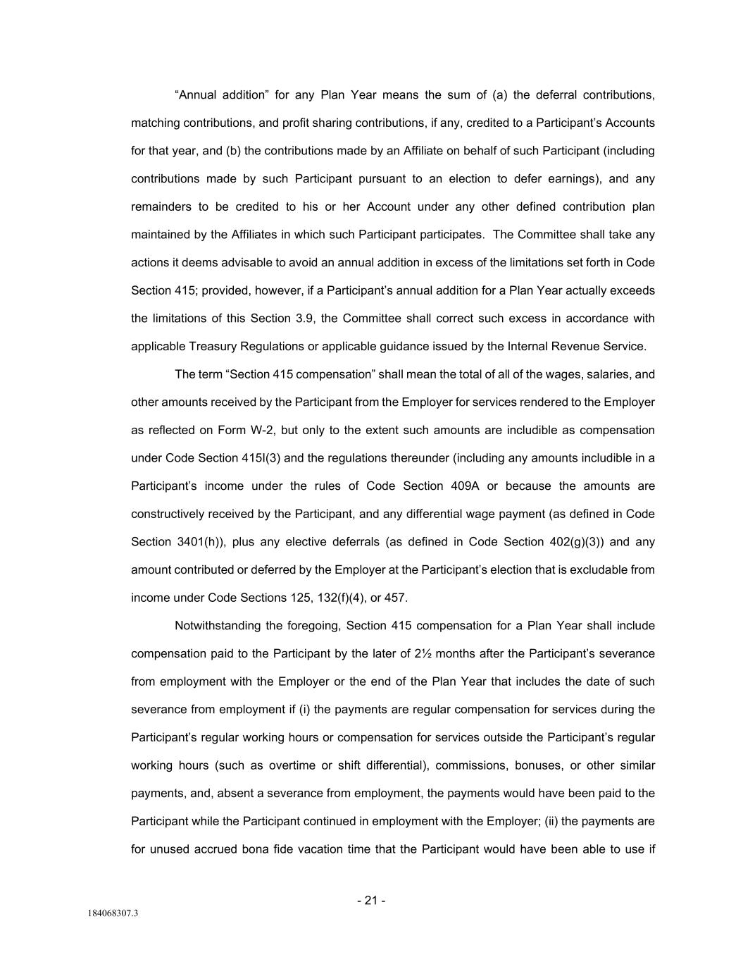 - 21 - 184068307.3 “Annual addition” for any Plan Year means the sum of (a) the deferral contributions, matching contributions, and profit sharing contributions, if any, credited to a Participant’s Accounts for that year, and (b) the contributions made by an Affiliate on behalf of such Participant (including contributions made by such Participant pursuant to an election to defer earnings), and any remainders to be credited to his or her Account under any other defined contribution plan maintained by the Affiliates in which such Participant participates. The Committee shall take any actions it deems advisable to avoid an annual addition in excess of the limitations set forth in Code Section 415; provided, however, if a Participant’s annual addition for a Plan Year actually exceeds the limitations of this Section 3.9, the Committee shall correct such excess in accordance with applicable Treasury Regulations or applicable guidance issued by the Internal Revenue Service. The term “Section 415 compensation” shall mean the total of all of the wages, salaries, and other amounts received by the Participant from the Employer for services rendered to the Employer as reflected on Form W-2, but only to the extent such amounts are includible as compensation under Code Section 415I(3) and the regulations thereunder (including any amounts includible in a Participant’s income under the rules of Code Section 409A or because the amounts are constructively received by the Participant, and any differential wage payment (as defined in Code Section 3401(h)), plus any elective deferrals (as defined in Code Section 402(g)(3)) and any amount contributed or deferred by the Employer at the Participant’s election that is excludable from income under Code Sections 125, 132(f)(4), or 457. Notwithstanding the foregoing, Section 415 compensation for a Plan Year shall include compensation paid to the Participant by the later of 2½ months after the Participant’s severance from employment with the Employer or the end of the Plan Year that includes the date of such severance from employment if (i) the payments are regular compensation for services during the Participant’s regular working hours or compensation for services outside the Participant’s regular working hours (such as overtime or shift differential), commissions, bonuses, or other similar payments, and, absent a severance from employment, the payments would have been paid to the Participant while the Participant continued in employment with the Employer; (ii) the payments are for unused accrued bona fide vacation time that the Participant would have been able to use if