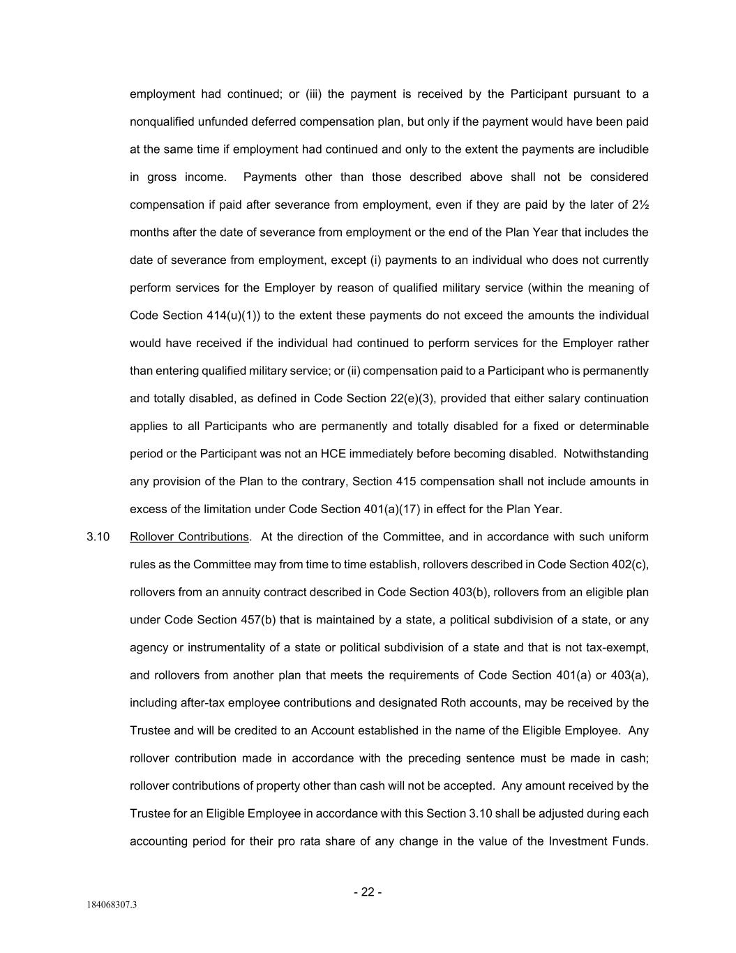 - 22 - 184068307.3 employment had continued; or (iii) the payment is received by the Participant pursuant to a nonqualified unfunded deferred compensation plan, but only if the payment would have been paid at the same time if employment had continued and only to the extent the payments are includible in gross income. Payments other than those described above shall not be considered compensation if paid after severance from employment, even if they are paid by the later of 2½ months after the date of severance from employment or the end of the Plan Year that includes the date of severance from employment, except (i) payments to an individual who does not currently perform services for the Employer by reason of qualified military service (within the meaning of Code Section 414(u)(1)) to the extent these payments do not exceed the amounts the individual would have received if the individual had continued to perform services for the Employer rather than entering qualified military service; or (ii) compensation paid to a Participant who is permanently and totally disabled, as defined in Code Section 22(e)(3), provided that either salary continuation applies to all Participants who are permanently and totally disabled for a fixed or determinable period or the Participant was not an HCE immediately before becoming disabled. Notwithstanding any provision of the Plan to the contrary, Section 415 compensation shall not include amounts in excess of the limitation under Code Section 401(a)(17) in effect for the Plan Year. 3.10 Rollover Contributions. At the direction of the Committee, and in accordance with such uniform rules as the Committee may from time to time establish, rollovers described in Code Section 402(c), rollovers from an annuity contract described in Code Section 403(b), rollovers from an eligible plan under Code Section 457(b) that is maintained by a state, a political subdivision of a state, or any agency or instrumentality of a state or political subdivision of a state and that is not tax-exempt, and rollovers from another plan that meets the requirements of Code Section 401(a) or 403(a), including after-tax employee contributions and designated Roth accounts, may be received by the Trustee and will be credited to an Account established in the name of the Eligible Employee. Any rollover contribution made in accordance with the preceding sentence must be made in cash; rollover contributions of property other than cash will not be accepted. Any amount received by the Trustee for an Eligible Employee in accordance with this Section 3.10 shall be adjusted during each accounting period for their pro rata share of any change in the value of the Investment Funds.