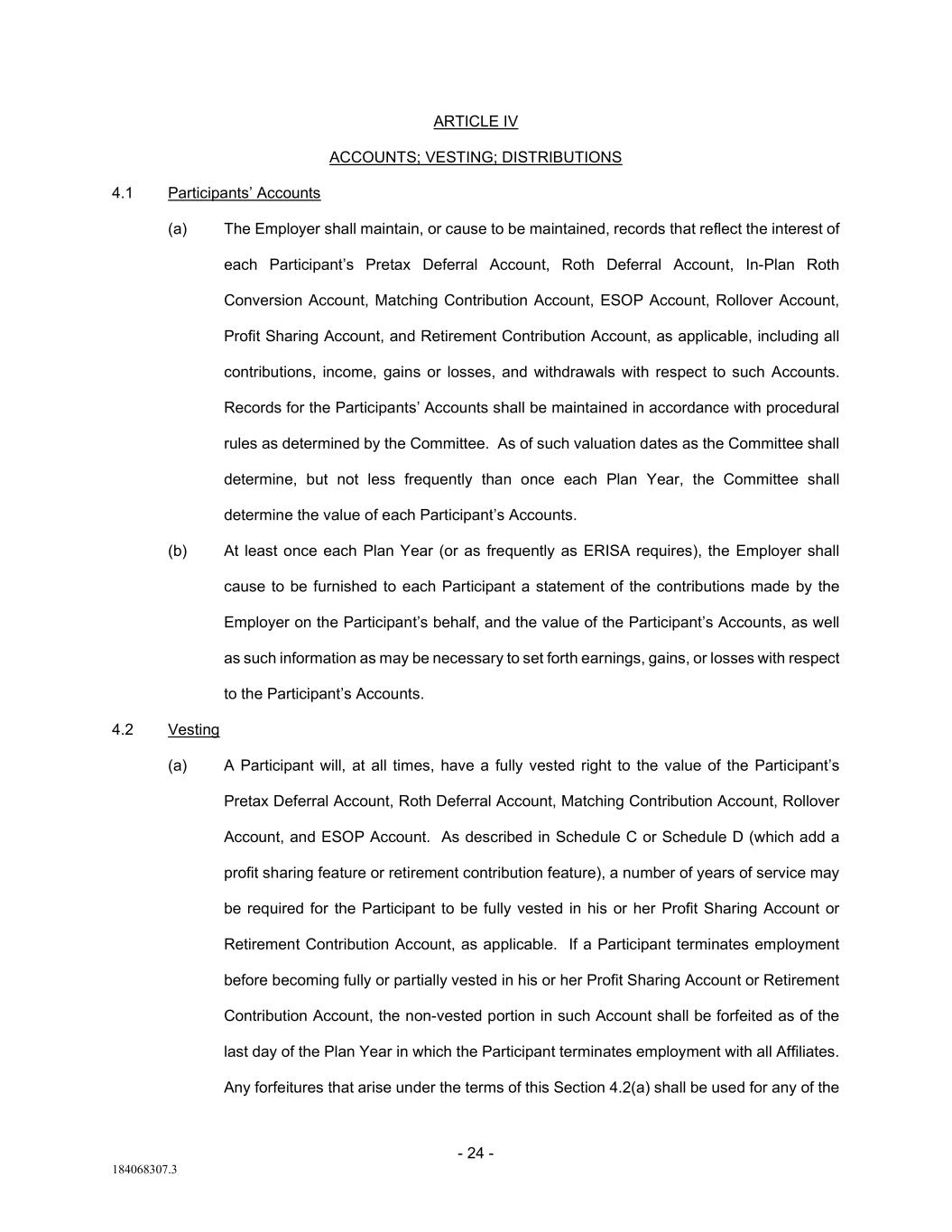 - 24 - 184068307.3 ARTICLE IV ACCOUNTS; VESTING; DISTRIBUTIONS 4.1 Participants’ Accounts (a) The Employer shall maintain, or cause to be maintained, records that reflect the interest of each Participant’s Pretax Deferral Account, Roth Deferral Account, In-Plan Roth Conversion Account, Matching Contribution Account, ESOP Account, Rollover Account, Profit Sharing Account, and Retirement Contribution Account, as applicable, including all contributions, income, gains or losses, and withdrawals with respect to such Accounts. Records for the Participants’ Accounts shall be maintained in accordance with procedural rules as determined by the Committee. As of such valuation dates as the Committee shall determine, but not less frequently than once each Plan Year, the Committee shall determine the value of each Participant’s Accounts. (b) At least once each Plan Year (or as frequently as ERISA requires), the Employer shall cause to be furnished to each Participant a statement of the contributions made by the Employer on the Participant’s behalf, and the value of the Participant’s Accounts, as well as such information as may be necessary to set forth earnings, gains, or losses with respect to the Participant’s Accounts. 4.2 Vesting (a) A Participant will, at all times, have a fully vested right to the value of the Participant’s Pretax Deferral Account, Roth Deferral Account, Matching Contribution Account, Rollover Account, and ESOP Account. As described in Schedule C or Schedule D (which add a profit sharing feature or retirement contribution feature), a number of years of service may be required for the Participant to be fully vested in his or her Profit Sharing Account or Retirement Contribution Account, as applicable. If a Participant terminates employment before becoming fully or partially vested in his or her Profit Sharing Account or Retirement Contribution Account, the non-vested portion in such Account shall be forfeited as of the last day of the Plan Year in which the Participant terminates employment with all Affiliates. Any forfeitures that arise under the terms of this Section 4.2(a) shall be used for any of the