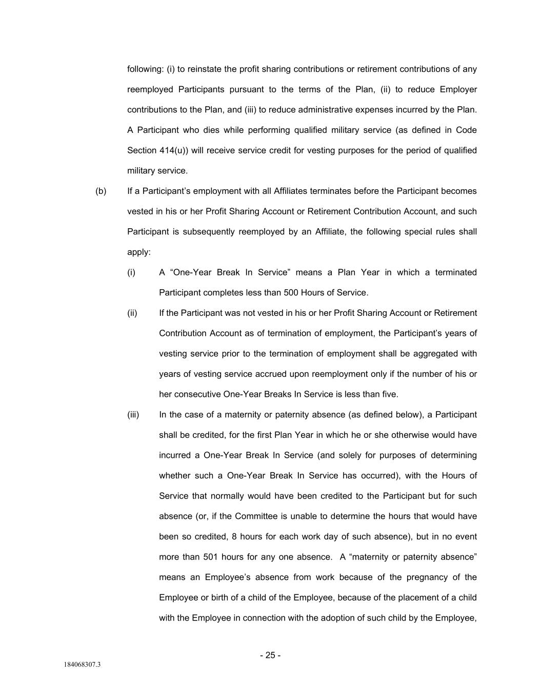 - 25 - 184068307.3 following: (i) to reinstate the profit sharing contributions or retirement contributions of any reemployed Participants pursuant to the terms of the Plan, (ii) to reduce Employer contributions to the Plan, and (iii) to reduce administrative expenses incurred by the Plan. A Participant who dies while performing qualified military service (as defined in Code Section 414(u)) will receive service credit for vesting purposes for the period of qualified military service. (b) If a Participant’s employment with all Affiliates terminates before the Participant becomes vested in his or her Profit Sharing Account or Retirement Contribution Account, and such Participant is subsequently reemployed by an Affiliate, the following special rules shall apply: (i) A “One-Year Break In Service” means a Plan Year in which a terminated Participant completes less than 500 Hours of Service. (ii) If the Participant was not vested in his or her Profit Sharing Account or Retirement Contribution Account as of termination of employment, the Participant’s years of vesting service prior to the termination of employment shall be aggregated with years of vesting service accrued upon reemployment only if the number of his or her consecutive One-Year Breaks In Service is less than five. (iii) In the case of a maternity or paternity absence (as defined below), a Participant shall be credited, for the first Plan Year in which he or she otherwise would have incurred a One-Year Break In Service (and solely for purposes of determining whether such a One-Year Break In Service has occurred), with the Hours of Service that normally would have been credited to the Participant but for such absence (or, if the Committee is unable to determine the hours that would have been so credited, 8 hours for each work day of such absence), but in no event more than 501 hours for any one absence. A “maternity or paternity absence” means an Employee’s absence from work because of the pregnancy of the Employee or birth of a child of the Employee, because of the placement of a child with the Employee in connection with the adoption of such child by the Employee,