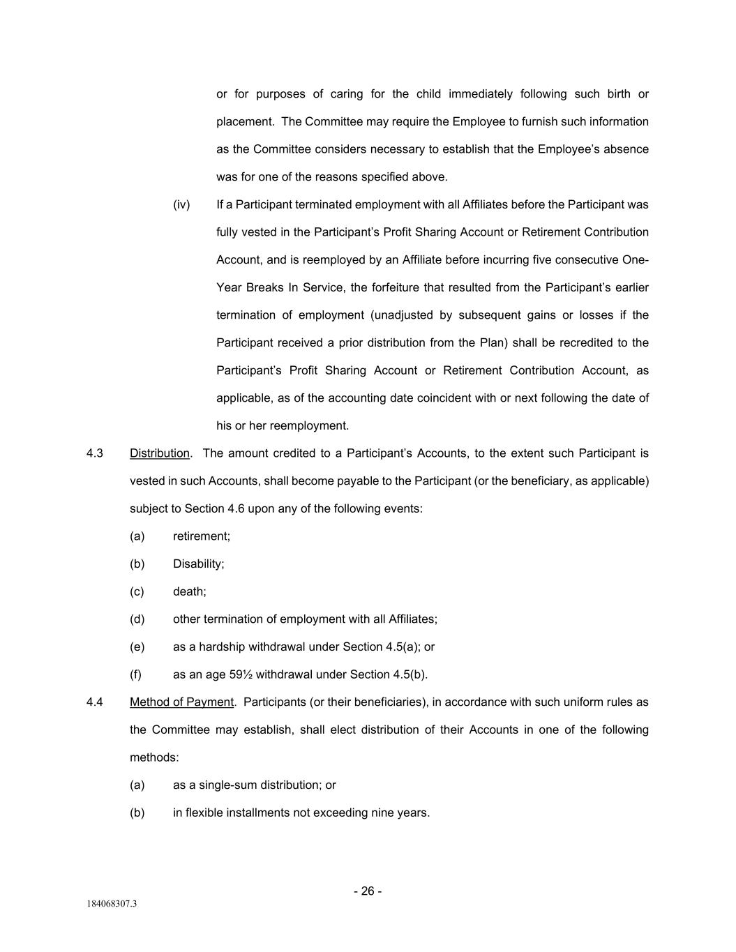 - 26 - 184068307.3 or for purposes of caring for the child immediately following such birth or placement. The Committee may require the Employee to furnish such information as the Committee considers necessary to establish that the Employee’s absence was for one of the reasons specified above. (iv) If a Participant terminated employment with all Affiliates before the Participant was fully vested in the Participant’s Profit Sharing Account or Retirement Contribution Account, and is reemployed by an Affiliate before incurring five consecutive One- Year Breaks In Service, the forfeiture that resulted from the Participant’s earlier termination of employment (unadjusted by subsequent gains or losses if the Participant received a prior distribution from the Plan) shall be recredited to the Participant’s Profit Sharing Account or Retirement Contribution Account, as applicable, as of the accounting date coincident with or next following the date of his or her reemployment. 4.3 Distribution. The amount credited to a Participant’s Accounts, to the extent such Participant is vested in such Accounts, shall become payable to the Participant (or the beneficiary, as applicable) subject to Section 4.6 upon any of the following events: (a) retirement; (b) Disability; (c) death; (d) other termination of employment with all Affiliates; (e) as a hardship withdrawal under Section 4.5(a); or (f) as an age 59½ withdrawal under Section 4.5(b). 4.4 Method of Payment. Participants (or their beneficiaries), in accordance with such uniform rules as the Committee may establish, shall elect distribution of their Accounts in one of the following methods: (a) as a single-sum distribution; or (b) in flexible installments not exceeding nine years.