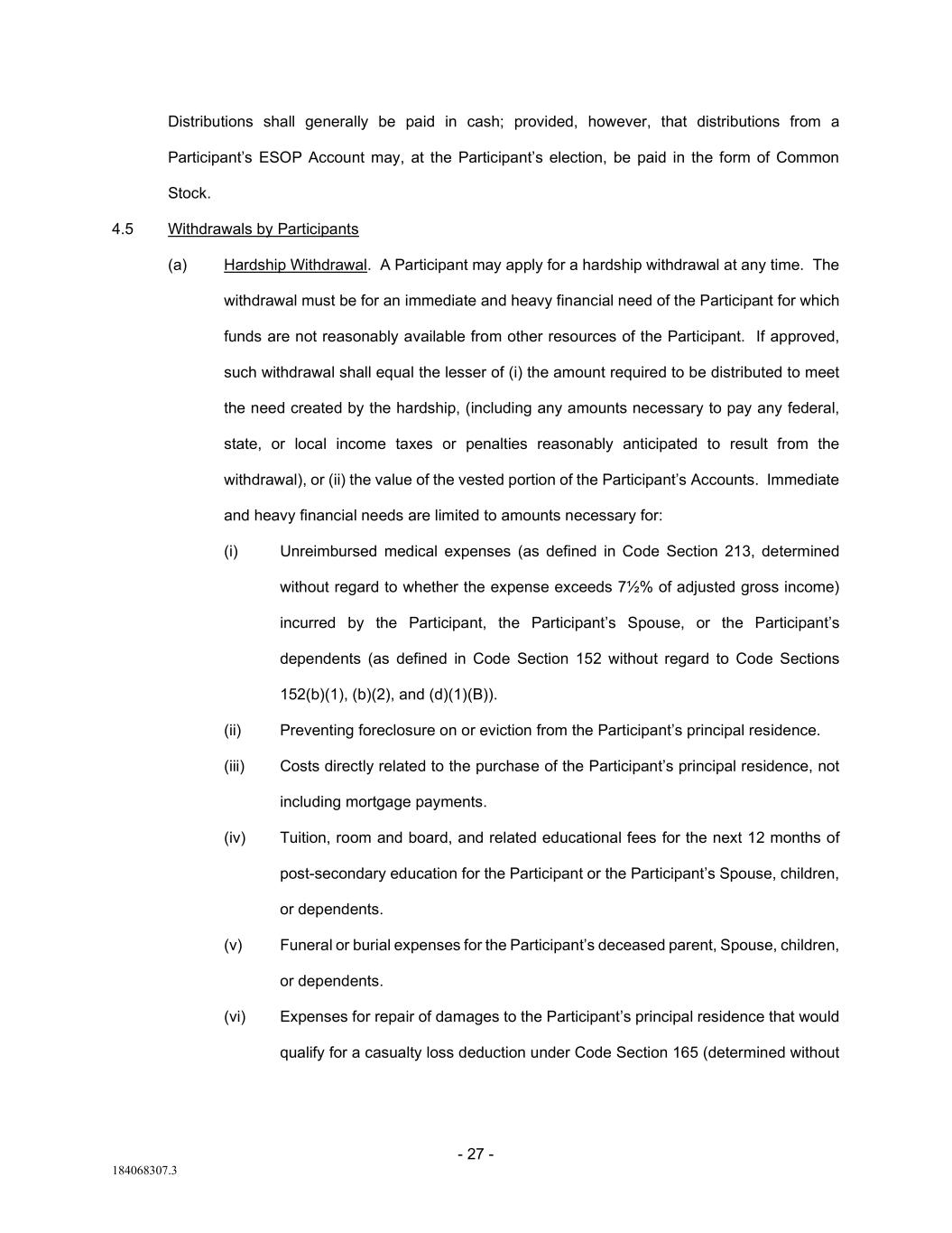 - 27 - 184068307.3 Distributions shall generally be paid in cash; provided, however, that distributions from a Participant’s ESOP Account may, at the Participant’s election, be paid in the form of Common Stock. 4.5 Withdrawals by Participants (a) Hardship Withdrawal. A Participant may apply for a hardship withdrawal at any time. The withdrawal must be for an immediate and heavy financial need of the Participant for which funds are not reasonably available from other resources of the Participant. If approved, such withdrawal shall equal the lesser of (i) the amount required to be distributed to meet the need created by the hardship, (including any amounts necessary to pay any federal, state, or local income taxes or penalties reasonably anticipated to result from the withdrawal), or (ii) the value of the vested portion of the Participant’s Accounts. Immediate and heavy financial needs are limited to amounts necessary for: (i) Unreimbursed medical expenses (as defined in Code Section 213, determined without regard to whether the expense exceeds 7½% of adjusted gross income) incurred by the Participant, the Participant’s Spouse, or the Participant’s dependents (as defined in Code Section 152 without regard to Code Sections 152(b)(1), (b)(2), and (d)(1)(B)). (ii) Preventing foreclosure on or eviction from the Participant’s principal residence. (iii) Costs directly related to the purchase of the Participant’s principal residence, not including mortgage payments. (iv) Tuition, room and board, and related educational fees for the next 12 months of post-secondary education for the Participant or the Participant’s Spouse, children, or dependents. (v) Funeral or burial expenses for the Participant’s deceased parent, Spouse, children, or dependents. (vi) Expenses for repair of damages to the Participant’s principal residence that would qualify for a casualty loss deduction under Code Section 165 (determined without