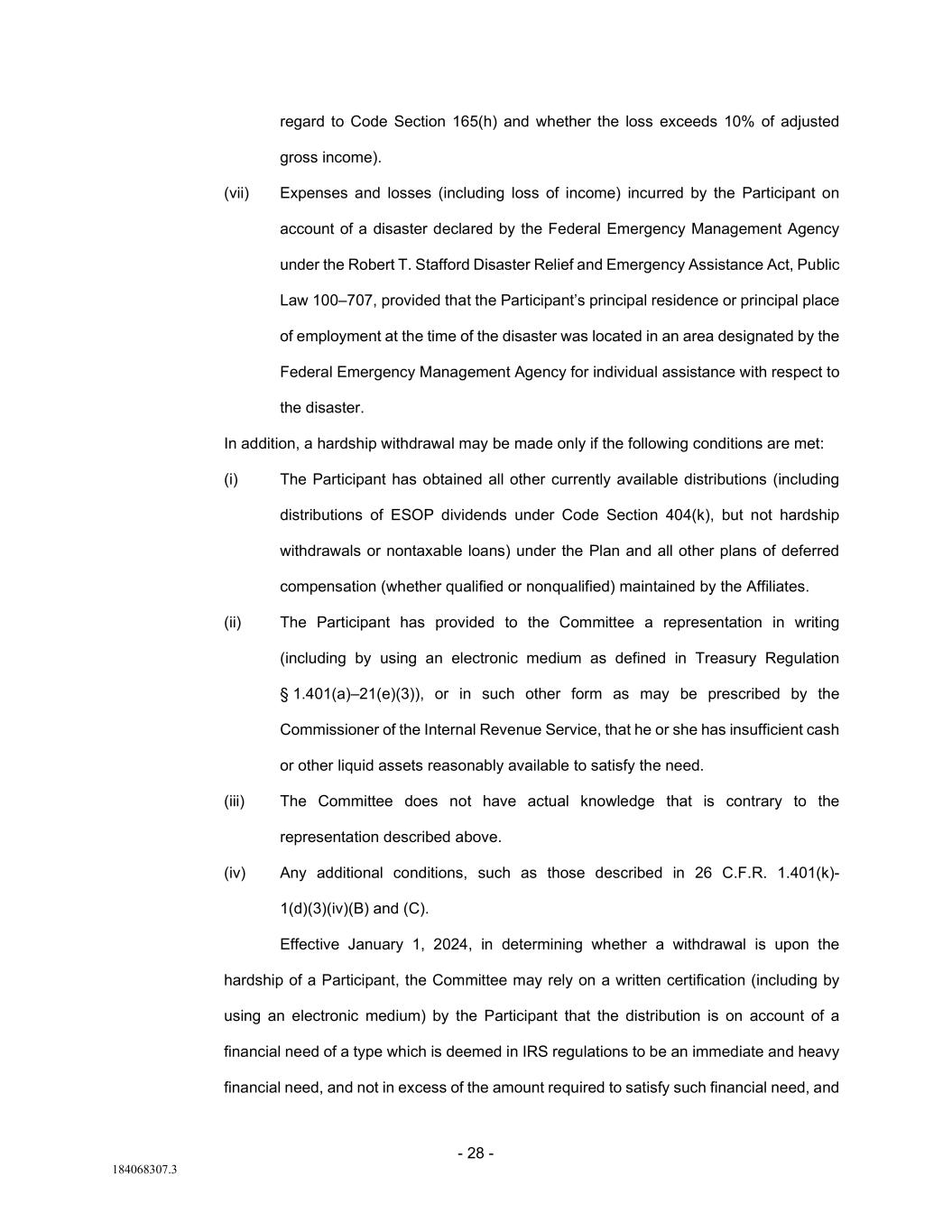 - 28 - 184068307.3 regard to Code Section 165(h) and whether the loss exceeds 10% of adjusted gross income). (vii) Expenses and losses (including loss of income) incurred by the Participant on account of a disaster declared by the Federal Emergency Management Agency under the Robert T. Stafford Disaster Relief and Emergency Assistance Act, Public Law 100–707, provided that the Participant’s principal residence or principal place of employment at the time of the disaster was located in an area designated by the Federal Emergency Management Agency for individual assistance with respect to the disaster. In addition, a hardship withdrawal may be made only if the following conditions are met: (i) The Participant has obtained all other currently available distributions (including distributions of ESOP dividends under Code Section 404(k), but not hardship withdrawals or nontaxable loans) under the Plan and all other plans of deferred compensation (whether qualified or nonqualified) maintained by the Affiliates. (ii) The Participant has provided to the Committee a representation in writing (including by using an electronic medium as defined in Treasury Regulation § 1.401(a)–21(e)(3)), or in such other form as may be prescribed by the Commissioner of the Internal Revenue Service, that he or she has insufficient cash or other liquid assets reasonably available to satisfy the need. (iii) The Committee does not have actual knowledge that is contrary to the representation described above. (iv) Any additional conditions, such as those described in 26 C.F.R. 1.401(k)- 1(d)(3)(iv)(B) and (C). Effective January 1, 2024, in determining whether a withdrawal is upon the hardship of a Participant, the Committee may rely on a written certification (including by using an electronic medium) by the Participant that the distribution is on account of a financial need of a type which is deemed in IRS regulations to be an immediate and heavy financial need, and not in excess of the amount required to satisfy such financial need, and