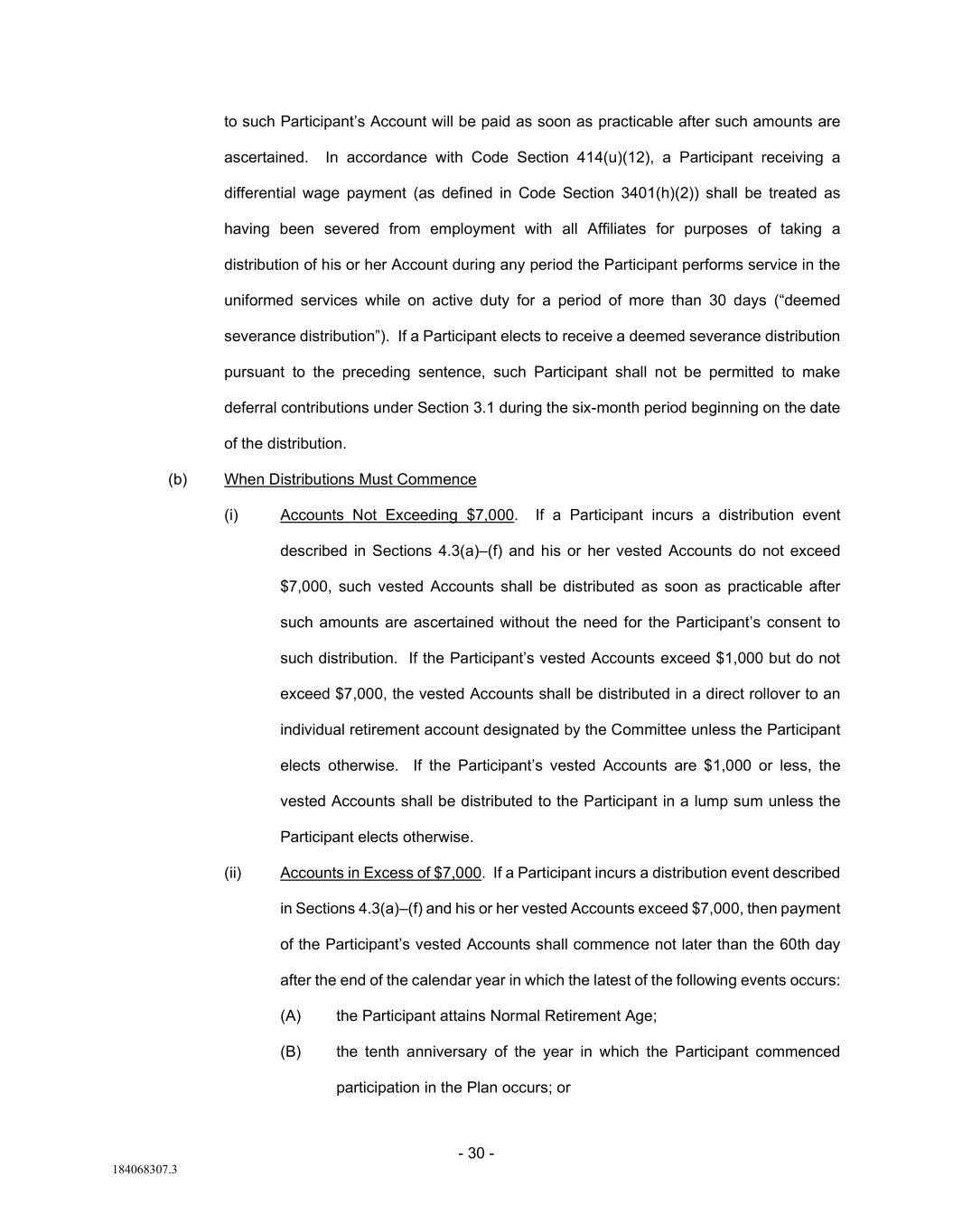 - 30 - 184068307.3 to such Participant’s Account will be paid as soon as practicable after such amounts are ascertained. In accordance with Code Section 414(u)(12), a Participant receiving a differential wage payment (as defined in Code Section 3401(h)(2)) shall be treated as having been severed from employment with all Affiliates for purposes of taking a distribution of his or her Account during any period the Participant performs service in the uniformed services while on active duty for a period of more than 30 days (“deemed severance distribution”). If a Participant elects to receive a deemed severance distribution pursuant to the preceding sentence, such Participant shall not be permitted to make deferral contributions under Section 3.1 during the six-month period beginning on the date of the distribution. (b) When Distributions Must Commence (i) Accounts Not Exceeding $7,000. If a Participant incurs a distribution event described in Sections 4.3(a)–(f) and his or her vested Accounts do not exceed $7,000, such vested Accounts shall be distributed as soon as practicable after such amounts are ascertained without the need for the Participant’s consent to such distribution. If the Participant’s vested Accounts exceed $1,000 but do not exceed $7,000, the vested Accounts shall be distributed in a direct rollover to an individual retirement account designated by the Committee unless the Participant elects otherwise. If the Participant’s vested Accounts are $1,000 or less, the vested Accounts shall be distributed to the Participant in a lump sum unless the Participant elects otherwise. (ii) Accounts in Excess of $7,000. If a Participant incurs a distribution event described in Sections 4.3(a)–(f) and his or her vested Accounts exceed $7,000, then payment of the Participant’s vested Accounts shall commence not later than the 60th day after the end of the calendar year in which the latest of the following events occurs: (A) the Participant attains Normal Retirement Age; (B) the tenth anniversary of the year in which the Participant commenced participation in the Plan occurs; or
