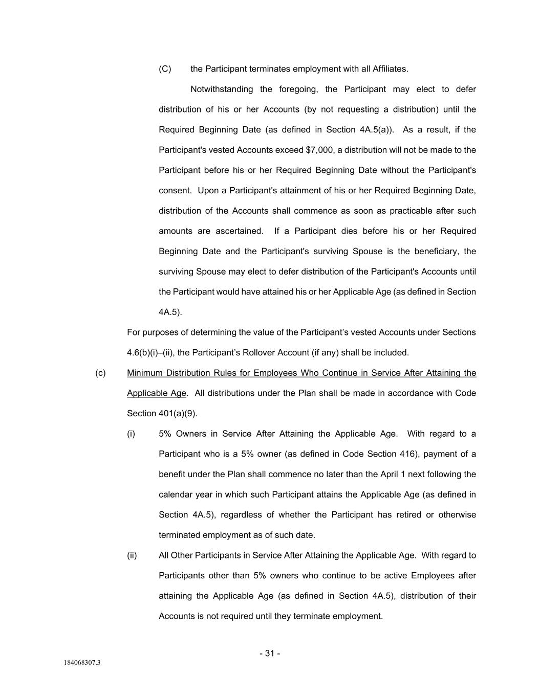 - 31 - 184068307.3 (C) the Participant terminates employment with all Affiliates. Notwithstanding the foregoing, the Participant may elect to defer distribution of his or her Accounts (by not requesting a distribution) until the Required Beginning Date (as defined in Section 4A.5(a)). As a result, if the Participant's vested Accounts exceed $7,000, a distribution will not be made to the Participant before his or her Required Beginning Date without the Participant's consent. Upon a Participant's attainment of his or her Required Beginning Date, distribution of the Accounts shall commence as soon as practicable after such amounts are ascertained. If a Participant dies before his or her Required Beginning Date and the Participant's surviving Spouse is the beneficiary, the surviving Spouse may elect to defer distribution of the Participant's Accounts until the Participant would have attained his or her Applicable Age (as defined in Section 4A.5). For purposes of determining the value of the Participant’s vested Accounts under Sections 4.6(b)(i)–(ii), the Participant’s Rollover Account (if any) shall be included. (c) Minimum Distribution Rules for Employees Who Continue in Service After Attaining the Applicable Age. All distributions under the Plan shall be made in accordance with Code Section 401(a)(9). (i) 5% Owners in Service After Attaining the Applicable Age. With regard to a Participant who is a 5% owner (as defined in Code Section 416), payment of a benefit under the Plan shall commence no later than the April 1 next following the calendar year in which such Participant attains the Applicable Age (as defined in Section 4A.5), regardless of whether the Participant has retired or otherwise terminated employment as of such date. (ii) All Other Participants in Service After Attaining the Applicable Age. With regard to Participants other than 5% owners who continue to be active Employees after attaining the Applicable Age (as defined in Section 4A.5), distribution of their Accounts is not required until they terminate employment.