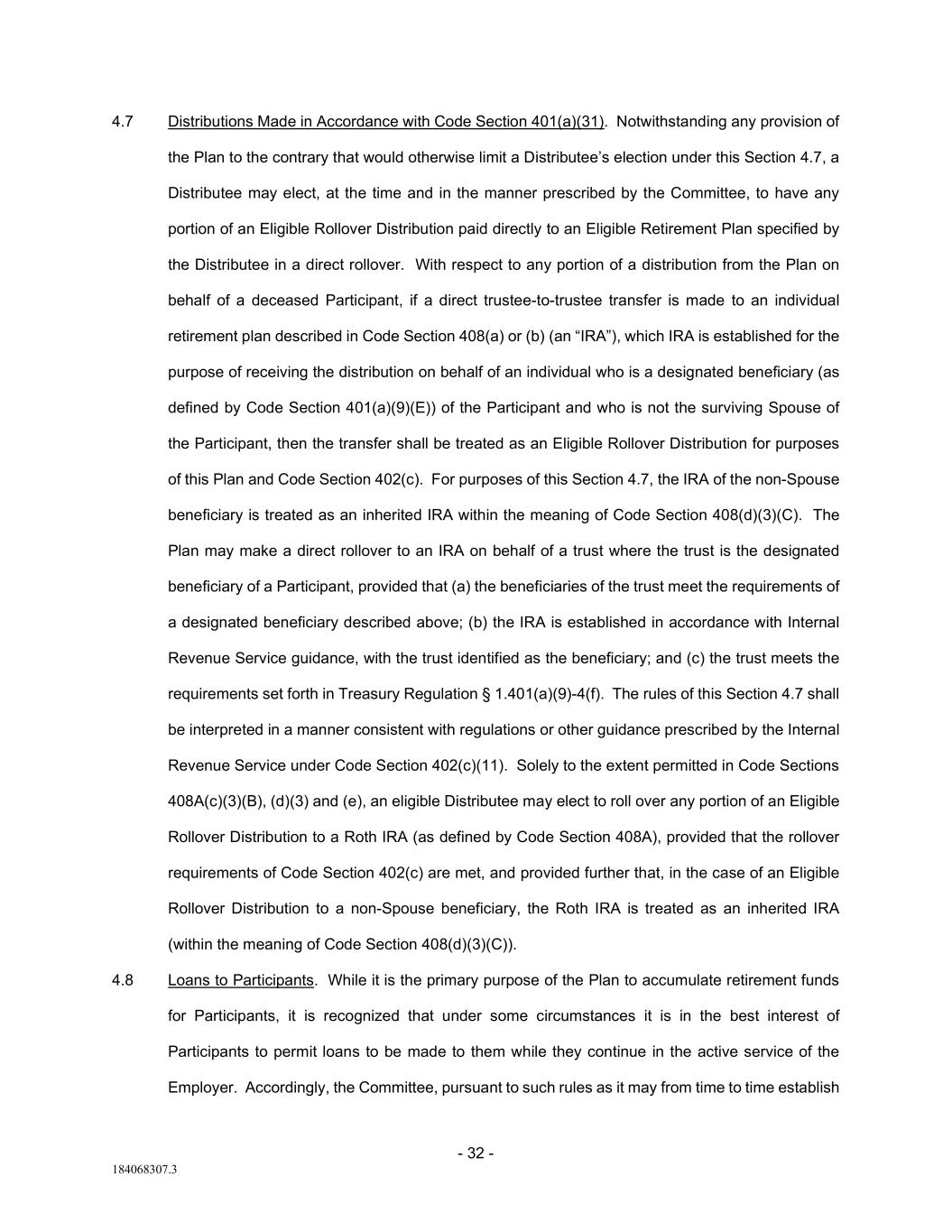 - 32 - 184068307.3 4.7 Distributions Made in Accordance with Code Section 401(a)(31). Notwithstanding any provision of the Plan to the contrary that would otherwise limit a Distributee’s election under this Section 4.7, a Distributee may elect, at the time and in the manner prescribed by the Committee, to have any portion of an Eligible Rollover Distribution paid directly to an Eligible Retirement Plan specified by the Distributee in a direct rollover. With respect to any portion of a distribution from the Plan on behalf of a deceased Participant, if a direct trustee-to-trustee transfer is made to an individual retirement plan described in Code Section 408(a) or (b) (an “IRA”), which IRA is established for the purpose of receiving the distribution on behalf of an individual who is a designated beneficiary (as defined by Code Section 401(a)(9)(E)) of the Participant and who is not the surviving Spouse of the Participant, then the transfer shall be treated as an Eligible Rollover Distribution for purposes of this Plan and Code Section 402(c). For purposes of this Section 4.7, the IRA of the non-Spouse beneficiary is treated as an inherited IRA within the meaning of Code Section 408(d)(3)(C). The Plan may make a direct rollover to an IRA on behalf of a trust where the trust is the designated beneficiary of a Participant, provided that (a) the beneficiaries of the trust meet the requirements of a designated beneficiary described above; (b) the IRA is established in accordance with Internal Revenue Service guidance, with the trust identified as the beneficiary; and (c) the trust meets the requirements set forth in Treasury Regulation § 1.401(a)(9)-4(f). The rules of this Section 4.7 shall be interpreted in a manner consistent with regulations or other guidance prescribed by the Internal Revenue Service under Code Section 402(c)(11). Solely to the extent permitted in Code Sections 408A(c)(3)(B), (d)(3) and (e), an eligible Distributee may elect to roll over any portion of an Eligible Rollover Distribution to a Roth IRA (as defined by Code Section 408A), provided that the rollover requirements of Code Section 402(c) are met, and provided further that, in the case of an Eligible Rollover Distribution to a non-Spouse beneficiary, the Roth IRA is treated as an inherited IRA (within the meaning of Code Section 408(d)(3)(C)). 4.8 Loans to Participants. While it is the primary purpose of the Plan to accumulate retirement funds for Participants, it is recognized that under some circumstances it is in the best interest of Participants to permit loans to be made to them while they continue in the active service of the Employer. Accordingly, the Committee, pursuant to such rules as it may from time to time establish