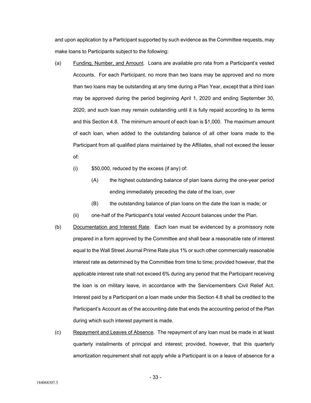- 33 - 184068307.3 and upon application by a Participant supported by such evidence as the Committee requests, may make loans to Participants subject to the following: (a) Funding, Number, and Amount. Loans are available pro rata from a Participant’s vested Accounts. For each Participant, no more than two loans may be approved and no more than two loans may be outstanding at any time during a Plan Year, except that a third loan may be approved during the period beginning April 1, 2020 and ending September 30, 2020, and such loan may remain outstanding until it is fully repaid according to its terms and this Section 4.8. The minimum amount of each loan is $1,000. The maximum amount of each loan, when added to the outstanding balance of all other loans made to the Participant from all qualified plans maintained by the Affiliates, shall not exceed the lesser of: (i) $50,000, reduced by the excess (if any) of: (A) the highest outstanding balance of plan loans during the one-year period ending immediately preceding the date of the loan, over (B) the outstanding balance of plan loans on the date the loan is made; or (ii) one-half of the Participant’s total vested Account balances under the Plan. (b) Documentation and Interest Rate. Each loan must be evidenced by a promissory note prepared in a form approved by the Committee and shall bear a reasonable rate of interest equal to the Wall Street Journal Prime Rate plus 1% or such other commercially reasonable interest rate as determined by the Committee from time to time; provided however, that the applicable interest rate shall not exceed 6% during any period that the Participant receiving the loan is on military leave, in accordance with the Servicemembers Civil Relief Act. Interest paid by a Participant on a loan made under this Section 4.8 shall be credited to the Participant’s Account as of the accounting date that ends the accounting period of the Plan during which such interest payment is made. (c) Repayment and Leaves of Absence. The repayment of any loan must be made in at least quarterly installments of principal and interest; provided, however, that this quarterly amortization requirement shall not apply while a Participant is on a leave of absence for a