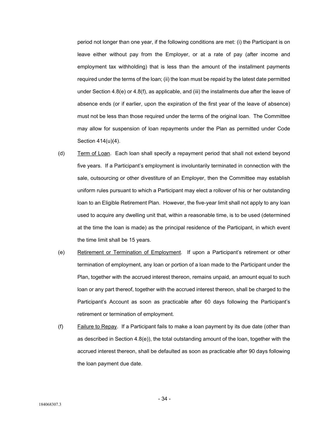 - 34 - 184068307.3 period not longer than one year, if the following conditions are met: (i) the Participant is on leave either without pay from the Employer, or at a rate of pay (after income and employment tax withholding) that is less than the amount of the installment payments required under the terms of the loan; (ii) the loan must be repaid by the latest date permitted under Section 4.8(e) or 4.8(f), as applicable, and (iii) the installments due after the leave of absence ends (or if earlier, upon the expiration of the first year of the leave of absence) must not be less than those required under the terms of the original loan. The Committee may allow for suspension of loan repayments under the Plan as permitted under Code Section 414(u)(4). (d) Term of Loan. Each loan shall specify a repayment period that shall not extend beyond five years. If a Participant’s employment is involuntarily terminated in connection with the sale, outsourcing or other divestiture of an Employer, then the Committee may establish uniform rules pursuant to which a Participant may elect a rollover of his or her outstanding loan to an Eligible Retirement Plan. However, the five-year limit shall not apply to any loan used to acquire any dwelling unit that, within a reasonable time, is to be used (determined at the time the loan is made) as the principal residence of the Participant, in which event the time limit shall be 15 years. (e) Retirement or Termination of Employment. If upon a Participant’s retirement or other termination of employment, any loan or portion of a loan made to the Participant under the Plan, together with the accrued interest thereon, remains unpaid, an amount equal to such loan or any part thereof, together with the accrued interest thereon, shall be charged to the Participant’s Account as soon as practicable after 60 days following the Participant’s retirement or termination of employment. (f) Failure to Repay. If a Participant fails to make a loan payment by its due date (other than as described in Section 4.8(e)), the total outstanding amount of the loan, together with the accrued interest thereon, shall be defaulted as soon as practicable after 90 days following the loan payment due date.
