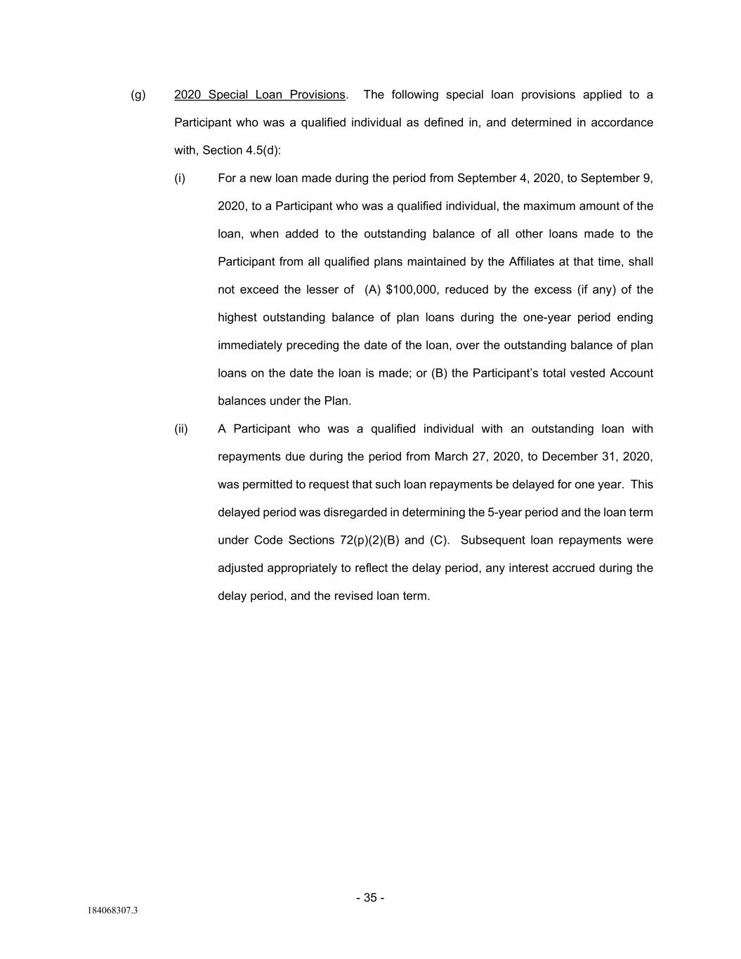 - 35 - 184068307.3 (g) 2020 Special Loan Provisions. The following special loan provisions applied to a Participant who was a qualified individual as defined in, and determined in accordance with, Section 4.5(d): (i) For a new loan made during the period from September 4, 2020, to September 9, 2020, to a Participant who was a qualified individual, the maximum amount of the loan, when added to the outstanding balance of all other loans made to the Participant from all qualified plans maintained by the Affiliates at that time, shall not exceed the lesser of (A) $100,000, reduced by the excess (if any) of the highest outstanding balance of plan loans during the one-year period ending immediately preceding the date of the loan, over the outstanding balance of plan loans on the date the loan is made; or (B) the Participant’s total vested Account balances under the Plan. (ii) A Participant who was a qualified individual with an outstanding loan with repayments due during the period from March 27, 2020, to December 31, 2020, was permitted to request that such loan repayments be delayed for one year. This delayed period was disregarded in determining the 5-year period and the loan term under Code Sections 72(p)(2)(B) and (C). Subsequent loan repayments were adjusted appropriately to reflect the delay period, any interest accrued during the delay period, and the revised loan term.