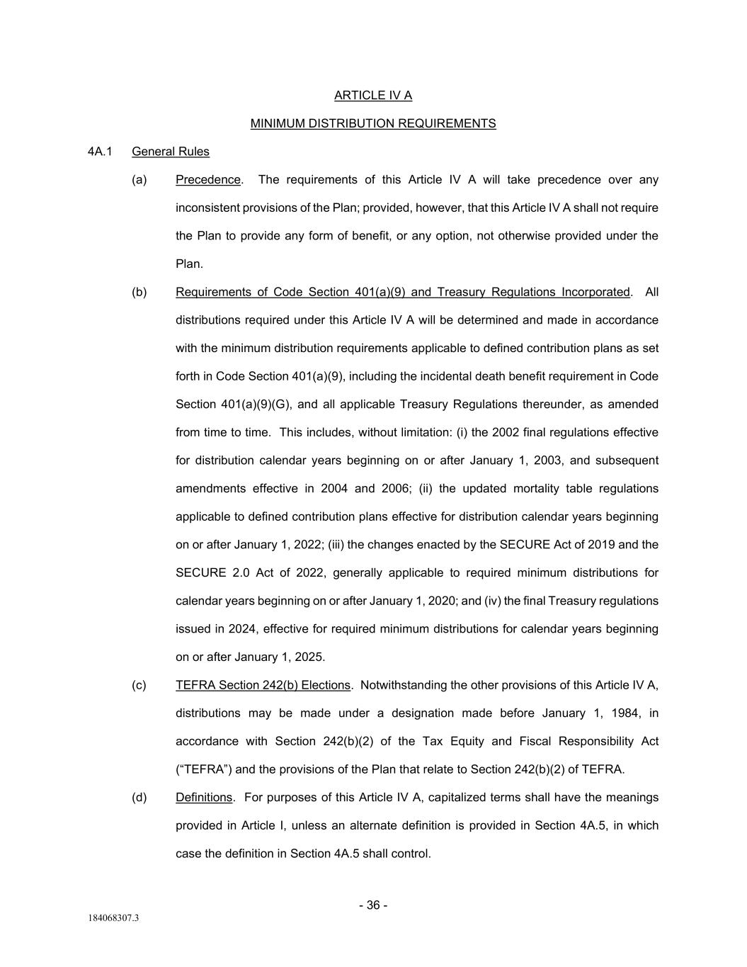 - 36 - 184068307.3 ARTICLE IV A MINIMUM DISTRIBUTION REQUIREMENTS 4A.1 General Rules (a) Precedence. The requirements of this Article IV A will take precedence over any inconsistent provisions of the Plan; provided, however, that this Article IV A shall not require the Plan to provide any form of benefit, or any option, not otherwise provided under the Plan. (b) Requirements of Code Section 401(a)(9) and Treasury Regulations Incorporated. All distributions required under this Article IV A will be determined and made in accordance with the minimum distribution requirements applicable to defined contribution plans as set forth in Code Section 401(a)(9), including the incidental death benefit requirement in Code Section 401(a)(9)(G), and all applicable Treasury Regulations thereunder, as amended from time to time. This includes, without limitation: (i) the 2002 final regulations effective for distribution calendar years beginning on or after January 1, 2003, and subsequent amendments effective in 2004 and 2006; (ii) the updated mortality table regulations applicable to defined contribution plans effective for distribution calendar years beginning on or after January 1, 2022; (iii) the changes enacted by the SECURE Act of 2019 and the SECURE 2.0 Act of 2022, generally applicable to required minimum distributions for calendar years beginning on or after January 1, 2020; and (iv) the final Treasury regulations issued in 2024, effective for required minimum distributions for calendar years beginning on or after January 1, 2025. (c) TEFRA Section 242(b) Elections. Notwithstanding the other provisions of this Article IV A, distributions may be made under a designation made before January 1, 1984, in accordance with Section 242(b)(2) of the Tax Equity and Fiscal Responsibility Act (“TEFRA”) and the provisions of the Plan that relate to Section 242(b)(2) of TEFRA. (d) Definitions. For purposes of this Article IV A, capitalized terms shall have the meanings provided in Article I, unless an alternate definition is provided in Section 4A.5, in which case the definition in Section 4A.5 shall control.