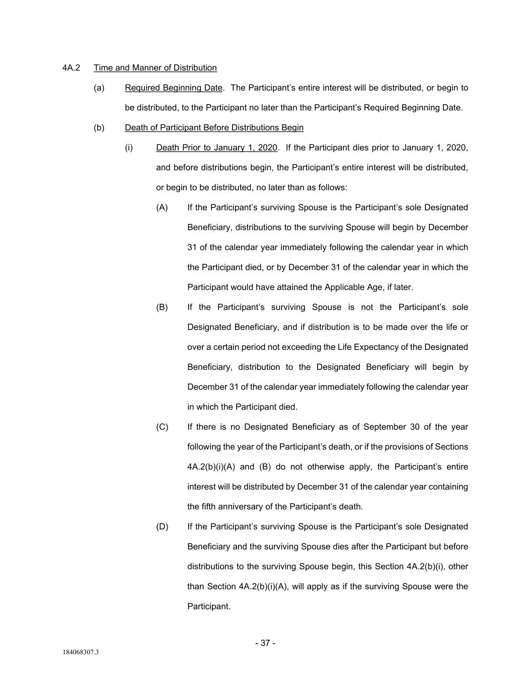 - 37 - 184068307.3 4A.2 Time and Manner of Distribution (a) Required Beginning Date. The Participant’s entire interest will be distributed, or begin to be distributed, to the Participant no later than the Participant’s Required Beginning Date. (b) Death of Participant Before Distributions Begin (i) Death Prior to January 1, 2020. If the Participant dies prior to January 1, 2020, and before distributions begin, the Participant’s entire interest will be distributed, or begin to be distributed, no later than as follows: (A) If the Participant’s surviving Spouse is the Participant’s sole Designated Beneficiary, distributions to the surviving Spouse will begin by December 31 of the calendar year immediately following the calendar year in which the Participant died, or by December 31 of the calendar year in which the Participant would have attained the Applicable Age, if later. (B) If the Participant’s surviving Spouse is not the Participant’s sole Designated Beneficiary, and if distribution is to be made over the life or over a certain period not exceeding the Life Expectancy of the Designated Beneficiary, distribution to the Designated Beneficiary will begin by December 31 of the calendar year immediately following the calendar year in which the Participant died. (C) If there is no Designated Beneficiary as of September 30 of the year following the year of the Participant’s death, or if the provisions of Sections 4A.2(b)(i)(A) and (B) do not otherwise apply, the Participant’s entire interest will be distributed by December 31 of the calendar year containing the fifth anniversary of the Participant’s death. (D) If the Participant’s surviving Spouse is the Participant’s sole Designated Beneficiary and the surviving Spouse dies after the Participant but before distributions to the surviving Spouse begin, this Section 4A.2(b)(i), other than Section 4A.2(b)(i)(A), will apply as if the surviving Spouse were the Participant.